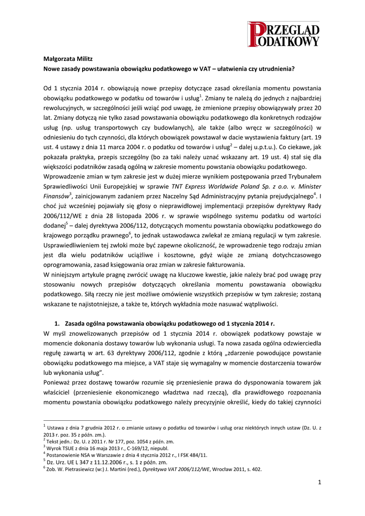 Małgorzata Militz Nowe zasady powstawania obowiązku podatkowego w VAT – ułatwienia czy utrudnienia? Od 1 stycznia 2014 r. obowiązują nowe przepisy dotyczące zasad określania momentu powstania obowiązku podatkowego w podatku od towarów i usług1. Zmiany te należą do jednych z najbardziej rewolucyjnych, w szczególności jeśli wziąd pod uwagę, że zmienione przepisy obowiązywały przez 20 lat. Zmiany dotyczą nie tylko zasad powstawania obowiązku podatkowego dla konkretnych rodzajów usług (np. usług transportowych czy budowlanych), ale także (albo wręcz w szczególności) w odniesieniu do tych czynności, dla których obowiązek powstawał w dacie wystawienia faktury (art. 19 ust. 4 ustawy z dnia 11 marca 2004 r. o podatku od towarów i usług2 – dalej u.p.t.u.). Co ciekawe, jak pokazała praktyka, przepis szczególny (bo za taki należy uznad wskazany art. 19 ust. 4) stał się dla większości podatników zasadą ogólną w zakresie momentu powstania obowiązku podatkowego. Wprowadzenie zmian w tym zakresie jest w dużej mierze wynikiem postępowania przed Trybunałem Sprawiedliwości Unii Europejskiej w sprawie TNT Express Worldwide Poland Sp. z o.o. v. Minister Finansów3, zainicjowanym zadaniem przez Naczelny Sąd Administracyjny pytania prejudycjalnego4. I chod już wcześniej pojawiały się głosy o nieprawidłowej implementacji przepisów dyrektywy Rady 2006/112/WE z dnia 28 listopada 2006 r. w sprawie wspólnego systemu podatku od wartości dodanej5 – dalej dyrektywa 2006/112, dotyczących momentu powstania obowiązku podatkowego do krajowego porządku prawnego6, to jednak ustawodawca zwlekał ze zmianą regulacji w tym zakresie. Usprawiedliwieniem tej zwłoki może byd zapewne okolicznośd, że wprowadzenie tego rodzaju zmian jest dla wielu podatników uciążliwe i kosztowne, gdyż wiąże ze zmianą dotychczasowego oprogramowania, zasad księgowania oraz zmian w zakresie fakturowania. W niniejszym artykule pragnę zwrócid uwagę na kluczowe kwestie, jakie należy brad pod uwagę przy stosowaniu nowych przepisów dotyczących określania momentu powstawania obowiązku podatkowego. Siłą rzeczy nie jest możliwe omówienie wszystkich przepisów w tym zakresie; zostaną wskazane te najistotniejsze, a także te, których wykładnia może nasuwad wątpliwości. 1. Zasada ogólna powstawania obowiązku podatkowego od 1 stycznia 2014 r. W myśl znowelizowanych przepisów od 1 stycznia 2014 r. obowiązek podatkowy powstaje w momencie dokonania dostawy towarów lub wykonania usługi. Ta nowa zasada ogólna odzwierciedla regułę zawartą w art. 63 dyrektywy 2006/112, zgodnie z którą „zdarzenie powodujące powstanie obowiązku podatkowego ma miejsce, a VAT staje się wymagalny w momencie dostarczenia towarów lub wykonania usług”. Ponieważ przez dostawę towarów rozumie się przeniesienie prawa do dysponowania towarem jak właściciel (przeniesienie ekonomicznego władztwa nad rzeczą), dla prawidłowego rozpoznania momentu powstania obowiązku podatkowego należy precyzyjnie określid, kiedy do takiej czynności 1 Ustawa z dnia 7 grudnia 2012 r. o zmianie ustawy o podatku od towarów i usług oraz niektórych innych ustaw (Dz. U. z 2013 r. poz. 35 z późn. zm.). 2 Tekst jedn.: Dz. U. z 2011 r. Nr 177, poz. 1054 z późn. zm. 3 Wyrok TSUE z dnia 16 maja 2013 r., C-169/12, niepubl. 4 Postanowienie NSA w Warszawie z dnia 4 stycznia 2012 r., I FSK 484/11. 5 6 Dz. Urz. UE L 347 z 11.12.2006 r., s. 1 z późn. zm. Zob. W. Pietrasiewicz (w:) J. Martini (red.), Dyrektywa VAT 2006/112/WE, Wrocław 2011, s. 402. 1 (dostawy towarów) doszło. Moment, który należy uznad za moment dokonania dostawy towarów, może zależed od dwustronnych ustaleo stron transakcji oraz formy, w jakiej to przekazanie towarów następuje, a także określenia, kiedy przechodzą na nabywcę ryzyka związane z przemieszczeniem towarów lub ich utratą. Należy podkreślid, że pojęcie dostawy towaru na gruncie przepisów o VAT należy rozumied bardzo szeroko i nie można go ograniczad jedynie do fizycznego wydania towarów. Co więcej, strony transakcji mogą to pojęcie dla własnych potrzeb zdefiniowad, np. wskazując, że dostawa towarów będzie miała miejsce, gdy nabywca potwierdzi fakt jej dokonania (co wcale nie musi oznaczad, że będzie to miało miejsce w momencie fizycznego otrzymania towaru)7. Co to oznacza dla podatników dokonujących dostaw towarów? Dla prawidłowego określenia momentu powstania obowiązku podatkowego istotne więc będzie, na jakich warunkach jest dokonywana dostawa: czy towar został wydany z magazynu sprzedawcy nabywcy lub przewoźnikowi działającemu na jego zlecenie, czy sprzedawca zobowiązał się dostarczyd towar do nabywcy lub w miejsce przez niego wskazane, czy towar został pozostawiony w miejscu wskazanym przez nabywcę. Pomocne w tym zakresie będą także zasady wynikające z reguł Incoterms, które precyzują obowiązki sprzedawcy i nabywcy i wskazują na moment przejścia ryzyk związanych z utratą towaru. Również warunki dostaw towarów muszą byd brane pod uwagę przy dokonywaniu tzw. transakcji łaocuchowych, tj. gdy dostawy towaru dokonuje kilka podmiotów, ale towar jest przemieszczany pomiędzy pierwszym a ostatnim z nich (wydawany przez pierwszego ostatniemu w kolejności). Pomimo że dotychczas użyte przez ustawodawcę w przepisie art. 19 ust. 1 u.p.t.u. pojęcie „wydanie towarów” należało interpretowad jako „dostawę towarów”, to w praktyce podatnicy raczej nie zwracali uwagi na warunki dostawy, bo obowiązek podatkowy powstawał najczęściej w dacie wystawienia faktury. Dla zilustrowania tej sytuacji można się posłużyd następującym przykładem: sprzedawca ma dostarczyd towar do nabywcy, towar został wydany z magazynu sprzedawcy 31 stycznia 2014 r. (co potwierdza dokument wydania magazynowego tzw. WZ), tego samego dnia została także wystawiona faktura. Przewoźnik działający na zlecenie spr