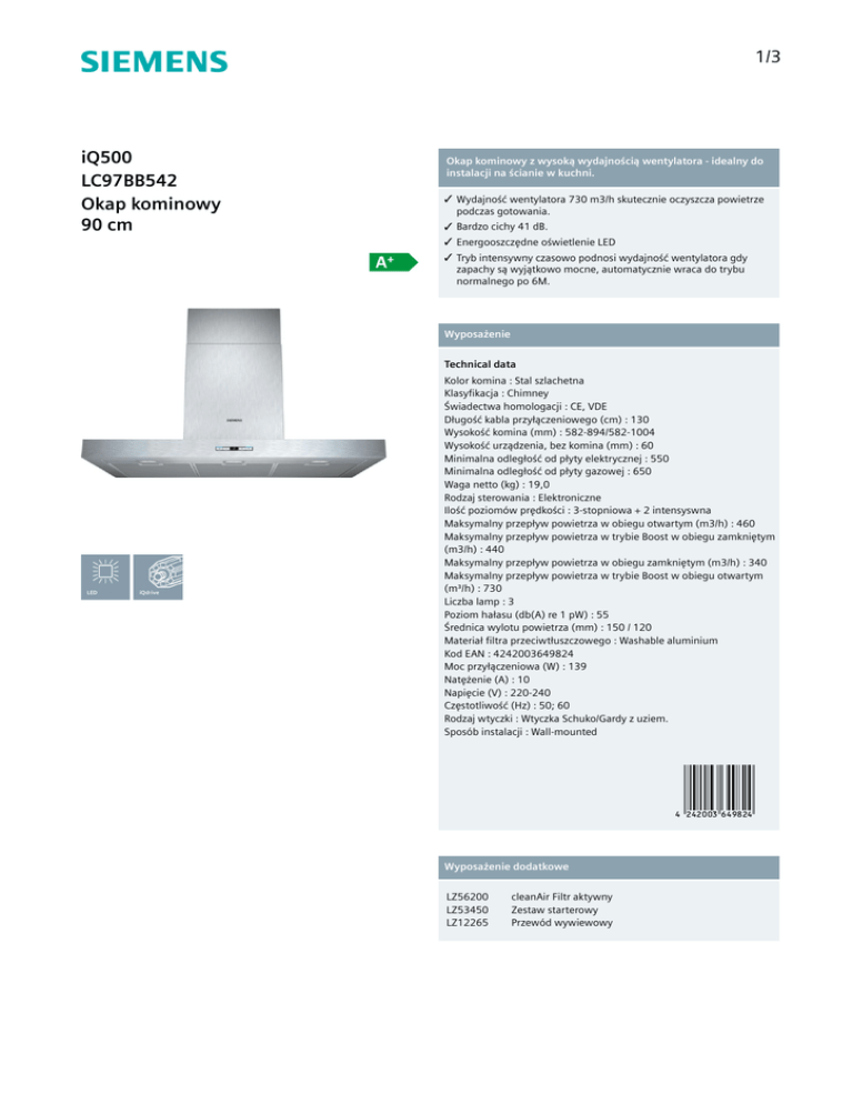 1/3 iQ500 LC97BB542 Okap kominowy 90 cm Okap kominowy z wysoką wydajnością wentylatora - idealny do instalacji na ścianie w kuchni. ✓ Wydajność wentylatora 730 m3/h skutecznie oczyszcza powietrze podczas gotowania. ✓ Bardzo cichy 41 dB. ✓ Energooszczędne oświetlenie LED ✓ Tryb intensywny czasowo podnosi wydajność wentylatora gdy zapachy są wyjątkowo mocne, automatycznie wraca do trybu normalnego po 6M. Wyposażenie Technical data Kolor komina : Stal szlachetna Klasyfikacja : Chimney Świadectwa homologacji : CE, VDE Długość kabla przyłączeniowego (cm) : 130 Wysokość komina (mm) : 582-894/582-1004 Wysokość urządzenia, bez komina (mm) : 60 Minimalna odległość od płyty elektrycznej : 550 Minimalna odległość od płyty gazowej : 650 Waga netto (kg) : 19,0 Rodzaj sterowania : Elektroniczne Ilość poziomów prędkości : 3-stopniowa + 2 intensyswna Maksymalny przepływ powietrza w obiegu otwartym (m3/h) : 460 Maksymalny przepływ powietrza w trybie Boost w obiegu zamkniętym (m3/h) : 440 Maksymalny przepływ powietrza w obiegu zamkniętym (m3/h) : 340 Maksymalny przepływ powietrza w trybie Boost w obiegu otwartym (m³/h) : 730 Liczba lamp : 3 Poziom hałasu (db(A) re 1 pW) : 55 Średnica wylotu powietrza (mm) : 150 / 120 Materiał filtra przeciwtłuszczowego : Washable aluminium Kod EAN : 4242003649824 Moc przyłączeniowa (W) : 139 Natężenie (A) : 10 Napięcie (V) : 220-240 Częstotliwość (Hz) : 50; 60 Rodzaj wtyczki : Wtyczka Schuko/Gardy z uziem. Sposób instalacji : Wall-mounted '!2E20AD-gejice! Wyposażenie dodatkowe LZ56200 LZ53450 LZ12265 cleanAir Filtr aktywny Zestaw starterowy Przewód wywiewowy 2/3 iQ500 LC97BB542 Okap kominowy 90 cm Wyposażenie Design: ● Stal szlachetna ● Biało-niebieskie oświetlenie ● Oświetlenie halogenowe 3 x 14W ● Funkcja Dimm ● softLight ● Sterowanie za pomocą płaskich przycisków, wyświetlacz 7segmentowy Typ pracy, moc urządzenia: ● Praca w obiegu otwartym lub zamkniętym ● 3-stopniowa regulacja pracy wentylatora + dwa tryby intensywne ● Dwuzakresowy wysokowydajny wentylator ● ● ● Wydajność wentylatora zgodnie z normą EN 61591 ø 15 cm: maks. tryb norm.: 460 m³/h; tryb int.: 730 m³/h Poziom hałasu zgodnie z normą EN 60704-3 i EN 60704-2-13: maks. tryb norm.: 55 dB(A) re 1 pW (41 dB(A) re 20 µPa ciśnienia akustycznego); tryb int.: 65 dB(A) re 1 pW (51 dB(A) re 20 µPa ciśnienia akustycznego) Parametry przyłącza: 139 W Komfort i bezpieczeństwo: ● ● ● Praca w obiegu zamkniętym możliwa po zamontowaniu zestawu startowego (dostępny jako wyposażenie dodatkowe) Do montażu naściennego nad płytą kuchenną Funkcja intensywnego wentylowania z powrotem do pracy normalnej po 6 min. ● Funkcja automatycznego wyłączenia urządzenia po 10 min. ● Filtr metalowy do mycia również w zmywarce ● Wskaźnik nasycenia filtra ● Dodatkowa izolacja chroniąca przed hałasem Wymiary: ● Okap kominowy, 90 cm ● Wymiary obieg otwarty (WxSxG): 642-954 x 900 x 500 mm 3/3 iQ500 LC97BB542 Okap kominowy 90 cm Rysunki wymiarowe