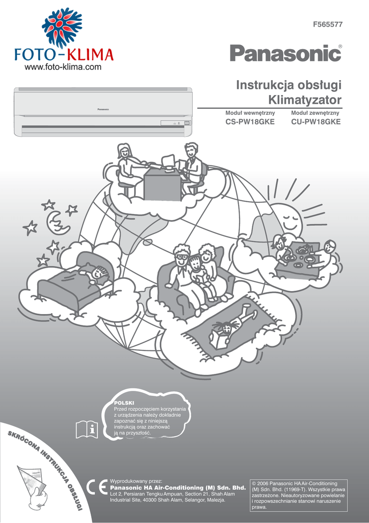 FOTO-KLIMA F565577 www.foto-klima.pl Instrukcja obs³ugi Klimatyzator SK RÓ Modu³ wewnêtrzny Modu³ zewnêtrzny CS-PW18GKE CU-PW18GKE POLSKI Przed rozpoczêciem korzystania z urz¹dzenia nale¿y dok³adnie zapoznaæ siê z niniejsz¹ instrukcj¹ oraz zachowaæ j¹ na przysz³oœæ. CO NA IN S TR U KC JA Wyprodukowany przez: OB Panasonic HA Air-Conditioning (M) Sdn. Bhd. S£ UG Lot 2, Persiaran Tengku Ampuan, Section 21, Shah Alam Industrial Site, 40300 Shah Alam, Selangor, Malezja. I © 2006 Panasonic HA Air-Conditioning (M) Sdn. Bhd. (11969-T). Wszystkie prawa zastrze¿one. Nieautoryzowane powielanie i rozpowszechnianie stanowi naruszenie prawa. ZALECENIA DOTYCZ¥CE BEZPIECZEÑSTWA DEFINICJE Aby zapobiec zagro¿eniu zdrowia, zdrowia innych osób lub uszkodzeniu urz¹dzenia nale¿y stosowaæ siê do poni¿szych zaleceñ. Niew³aœciwa obs³uga wynikaj¹ca z nieprzestrzegania instrukcji mo¿e powodowaæ zranienia lub uszkodzenia, których stopieñ zosta³ sklasyfikowany poni¿ej: znak oznacza zagro¿enie œmierci¹ Ostrze¿enie Ten lub powa¿nym uszkodzeniem cia³a. Uwaga Ten znak ostrzega o mo¿liwoœci zranienia siê lub uszkodzenia urz¹dzenia. Instrukcje, do których nale¿y siê zastosowaæ, zosta³y oznaczone nastêpuj¹cymi symbolami: Ten symbol oznacza dzia³anie, które jest ZABRONIONE. Te symbole oznaczaj¹ czynnoœci, które s¹ WYMAGANE. Ostrze¿enie Pilot zdalnego sterowania Podczas obs³ugi • Nie nale¿y korzystaæ z akumulatorów (Ni-Cd). • Nie nale¿y pozwalaæ dzieciom na zabawê pilotem zdalnego sterowania, aby zapobiec mo¿liwoœci przypadkowego po³kniêcia przez nie baterii. • Baterie nale¿y wyj¹æ z pilota, je¿eli urz¹dzenie nie bêdzie u¿ywane przez d³u¿szy czas. • Aby zapobiec uszkodzeniu pilota zdalnego sterowania, nowe baterie tego samego typu musz¹ byæ instalowane zgodnie z oznaczon¹ polaryzacj¹. Uwaga Modu³ wewnêtrzny Podczas instalacji Modu³ wewnêtrzny Podczas instalcji • Nie nale¿y samodzielnie instalowaæ, demontowaæ oraz reinstalowaæ urz¹dzenia. Niew³aœciwa instalacja mo¿e spowodowaæ wycieki, pora¿enie pr¹dem lub po¿ar. Wykonanie instalacji nale¿y powierzyæ fachowcowi. Podczas obs³ugi • Nie wolno wk³adaæ palców lub innych przedmiotów do modu³ów urz¹dzenia. • Nie nale¿y próbowaæ naprawiaæ urz¹dzenia samodzielnie. Wlot powietrza • Nie wolno instalowaæ urz¹dzenia w pomieszczeniu o atmosferze zagro¿onej wybuchem. • Nale¿y upewniæ siê, ¿e rurka odprowadzaj¹ca wodê jest w³aœciwe pod³¹czona. W innym przypadku mog¹ wyst¹piæ wycieki. Podczas obs³ugi • Nie wolno myæ urz¹dzenia wod¹, benzenem, rozpuszczalnikami lub œrodkami do szorowania. • Nie wolno wykorzystywaæ urz¹dzenia do innych celów, takich jak np. konserwacja ¿ywnoœci. • Na wprost wylotu powietrza nie wolno umieszczaæ urz¹dzeñ operuj¹cych otwartym ogniem. • Nie nale¿y wystawiaæ siê przez d³u¿szy czas na bezpoœrednie dzia³anie strumienia zimnego powietrza. • Pomieszczenie nale¿y regularnie wietrzyæ. W yl ot po w ie trz a Zasilanie Podczas obs³ugi • W celu wyjêcia wtyczki nie wolno ci¹gn¹æ za przewód zasilaj¹cy. Zasilanie Podczas instalacji • To urz¹dzenie musi byæ uziemione oraz zainstalowane w sieci chronionej wy³¹cznikiem ró¿nicowo-pr¹dowym. W innym przypadku w wyniku uszkodzenia urz¹dzenie mo¿e spowodowaæ pora¿enie pr¹dem lub po¿ar. Wlot powietrza Podczas obs³ugi • Nie wolno korzystaæ z tego samego gniazdka sieciowego do zasilania innego urz¹dzenia. • Nie wolno modyfikowaæ kabla zasilaj¹cego. • Nie wolno korzystaæ z przed³u¿aczy. • Nie wolno obs³ugiwaæ wilgotnymi rêkoma. • Nie wolno uruchamiaæ/wy³¹czaæ urz¹dzenia przez w³o¿enie/wyjêcie wtyczki. • Nale¿y w³aœciwie pod³¹czyæ wtyczkê. • Nale¿y u¿ywaæ oznaczonego kabla zasilaj¹cego. • Je¿eli kabel zasilaj¹cy zostanie uszkodzony, musi zostaæ wymieniony przez autoryzowany serwis producenta lub osobê o odpowiednich kwalifikacjach w celu zapobie¿enia ryzyka pora¿enia pr¹dem. • Kurz osadzaj¹cy siê na wtyczce powinien byæ okresowo wycierany such¹ œciereczk¹. • W nag³ym przypadku lub w przypadku niew³aœciwego zachowywania siê urz¹dzenia (dym, nietypowy zapach itp), nale¿y wy³¹czyæ zasilanie i od³¹czyæ urz¹dzenie od sieci zasilaj¹cej. 2 Wlot powietrza Wylot powietrza • Przed napraw¹ lub konserwacj¹ nale¿y wy³¹czyæ zasilanie i od³¹czyæ urz¹dzenie od sieci zasilaj¹cej. • Je¿eli urz¹dzenie nie bêdzie wykorzystywane przez d³u¿szy czas, nale¿y wy³¹czyæ zasilanie i od³¹czyæ urz¹dzenie od sieci zasilaj¹cej. • Niniejszy klimatyzator jest wyposa¿ony w zabezpieczenie przeciwprzepiêciowe. Jednak w celu dodatkowej ochrony przed uszkodzeniem podczas wyj¹tkowo intensywnych wy³adowañ atmosferycznych mo¿e istnieæ potrzeba od³¹czenia go od sieci zasilaj¹cej. Nie wolno dotykaæ klimatyzatora podczas wy³adowañ atmosferycznych, poniewa¿ mo¿e to spowodowaæ pora¿enie pr¹dem. Modu³ zewnêtrzny Podczas instalacji • Nale¿y upewniæ siê, ¿e rurka odprowadzaj¹ca wodê jest w³aœciwe pod³¹czona. W innym przypadku mog¹ wyst¹piæ wycieki. Podczas obs³ugi • Nie wolno siadaæ lub umieszczaæ jakichkolwiek przedmiotów na module zewnêtrznym. • Po up³ywie d³ugiego okresu u¿ytkowania nale¿y upewniæ siê, ¿e rama instalacyjna nie zosta³a uszkodzona. INFORMACJE PRAWNE OCHRONA ŒRODOWISKA Dziêkujemy za nabycie klimatyzatora POLSKI Urz¹dzenie nie jest przeznaczone do obs³ugi przez dzieci lub osoby nieprzeszkolone bez odpowiedniego nadzoru. Starsze dzieci powinny korzystaæ z urz¹dzenia pod nadzorem dla upewnienia siê, ¿e nie wykorzystaj¹ go do zabawy. SPIS TREŒCI ZALECENIA DOTYCZ¥CE BEZPIECZEÑSTWA USUWANIE ZU¯YTEGO URZ¥DZENIA INFORMACJE PRAWNE 3 OBS£UGA 4~5 KONSERWACJA I CZYSZCZENIE ROZWI¥ZYWANIE PROBLEMÓW 6 English Informacja o usuwaniu odpadów w krajach poza Uni¹ Europejsk¹ 2 English Instrukcje dla „u¿ytk