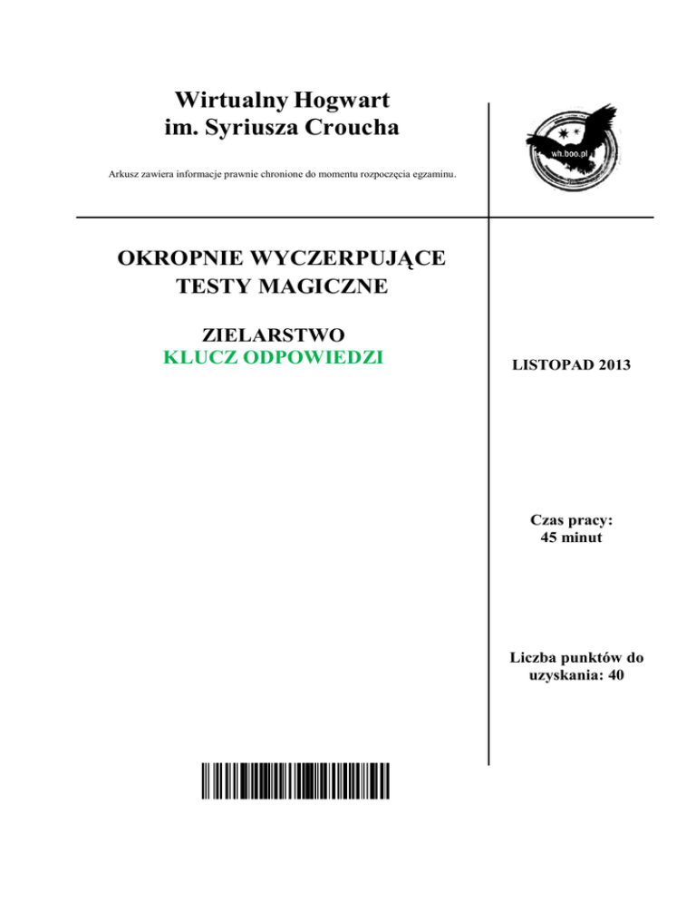 Wirtualny Hogwart im. Syriusza Croucha Arkusz zawiera informacje prawnie chronione do momentu rozpoczęcia egzaminu. OKROPNIE WYCZERPUJĄCE TESTY MAGICZNE ZIELARSTWO KLUCZ ODPOWIEDZI LISTOPAD 2013 Czas pracy: 45 minut Liczba punktów do uzyskania: 40 Wirtualny Hogwart im. Syriusza Croucha Zielarstwo Okropnie Wyczerpujące Testy Magiczne Zadanie 1. (6 pkt) Uzupełnij tekst. Ananas jest rośliną wieloletnią dorastającą nawet do (1.1) 1 metra wysokości. Jest rośliną z rodziny bromeliowatych, w stanie naturalnym rosnącą tylko w (1.2) Ameryce Południowej Jego oryginalna nazwa to (1.3) nana , oznaczająca coś pachnącego. Dla nas, Europejczyków, owoc ten zostały odkryty przez wybitną osobistość – (1.4) Krzysztofa Kolumba, w roku (1.5) 1493 , postanowił kilka z nich przywieźć na tereny Europy. W Polsce uprawy ananasa zapoczątkował król (1.6) Stanisława Augusta Poniatowskiego . Zadanie 2. (3 pkt) Wymień 3 znane Ci owoce egzotyczne. Nashi,ananas,kokos,durian – (przerobione na lekcji, inne interpretowane przez egzaminatora) Zadanie 3. (4 pkt) Rozpoznaj roślinę na podstawie opisów i podaj ich nazwy. 3.1. "Pochodzi z rodziny psiankowatych, rośnie zazwyczaj nad brzegami rzek i zarośli. Ma grube kłącze, łodyga czasem o odcieniu fioletowym." Wilcza Jagoda 3.2. ‘"Wyglądem przypomina ślimaka. Jest pokryta sporymi bąblami, zawierające substancje żrące ." Czyrakobulwa 3.3. ‘"Z widzenia przypomina kaktus, potrafi strzelać kolcami, robią to gdy wyczuwają niebezpieczeństwo." Ostrokrzew 3.4.Wygląda jak karłowaty kaktus, zamiast kolców ma wypustki, pochodzi z Asyrii.." Mimbulus mimbletonia 2 Wirtualny Hogwart im. Syriusza Croucha Zielarstwo Okropnie Wyczerpujące Testy Magiczne Zadanie 4. (10 pkt) Przeczytaj tekst i odpowiedz na pytania. W średniowieczu mało kto nie znał lokalnego znachora albo "mądrej", którzy za pomocą ziół leczyli rany i dolegliwości ciała oraz rozwiązywali wszelakie problemy natury osobistej - od wyschniętej studni po apodyktyczną teściową. Ich recepty bazowały na przekazywaniu z pokolenia na pokolenie ludowych wierzeń obejmujących lecznicze właściwości roślin. Leki powstawały i nadal powstają, na zasadzie, że każda roślina została jest naznaczona wyraźnym, specjalnym znakiem określającym jej rolę w medycynie, wystarczy więc przyjrzeć się jej dokładnie, by poznać, na co pomaga. Barwa kwiatów czy owoców, kształt liści albo korzeni, budowa płatka albo łodygi - wszystko to podpowiada, jakie są lecznicze właściwości danej rośliny. Na przykład rośliny o żółtych kwiatach przeciwdziałają żółtej cerze cierpiących na żółtaczkę, rośliny o czerwonych liściach bądź korzeniach stosuje się w leczeniu ran i dolegliwości, którym towarzyszy krwawienie, a z fioletowych płatków roślin robi się okłady na stłuczenia. Jeżeli jakaś roślina przypomina kształtem jakiś organ, przypisuje się jej zbawienne dla niego działanie. Wydaje się, że jest to teoria czysto mugolska, ale jest w tym sporo teorii magicznej. Jak już zostało wspomniane w poprzednim temacie , teorie magii i mugoli są do siebie bardzo podobne , ze względu na nieuwagę mugoli. Myślą oni, że jest to czysto naukowe , a jednak teoria potwierdza praktykę , ale oni jeszcze o tym nie wiedzą. 4.1. Pracy jakiej osoby dotyczy tekst? Znachora 4.2. Na co działały rośliny o żółtych kwiatach? Zółtaczce 4.3.Za pomocą czego wymienione wyżej postacie leczyły rany? Za pomocą ziół 4.4. W jaki celu wykorzystywano kwiaty z fioletowymi płatkami? Wykorzystywano je na stłuczenia 3 Wirtualny Hogwart im. Syriusza Croucha Zielarstwo Okropnie Wyczerpujące Testy Magiczne 4.5. Jakie znaczenie miało porównywanie kształtów roślin do organów? Jeśli jakaś roślina przypominała swoim kształtem jakiś organ, przypisywało jej się lecznice właściwości na owy organ. Zadanie 5. (3 pkt) Wymień 3 znane Ci gatunki tentakuli. 5.1. jadowita 5.2. afrykańska 5.3. pospolita (kolejność oczywiście może być dowolna) Zadanie 6. (1 pkt) Ile znamy odmian roślin karańskich? A. 10 B. 11 C. 12 D. 13 Zadanie 7. (1 pkt) Jaką doniczkę powinna mieć mandragora? A. plastikową B. drewnianą C. metalową D. papierową 4 Wirtualny Hogwart im. Syriusza Croucha Zielarstwo Okropnie Wyczerpujące Testy Magiczne Zadanie 8 (12 pkt) Dopasuj zaklęcie do jego działania. 8.1. Engorgio A. wyczarowuje wodę 8.2. Diffindo B. naprawia 8.3. Wingardium Leviosa C. sprawia że roślina szybciej rośnie 8.4. Reparo D. powoduje zwiększenie obiektu 8.5. Herbivicus E. unosi przedmioty 8.6 Aquamenti F. przecina pnącza G. podpala 8.1. 8.2. 8.3. 8.4. 8.5. 8.6. D F E B C A 5