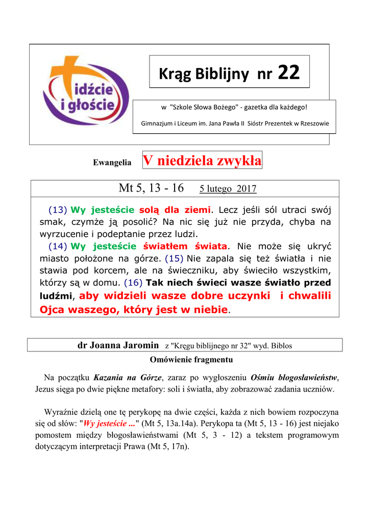Krąg Biblijny nr 22 w "Szkole Słowa Bożego" - gazetka dla każdego! Gimnazjum i Liceum im. Jana Pawła II Sióstr Prezentek w Rzeszowie Ewangelia V niedziela zwykła Mt 5, 13 - 16 5 lutego 2017 (13) Wy jesteście solą dla ziemi. Lecz jeśli sól utraci swój smak, czymże ją posolić? Na nic się już nie przyda, chyba na wyrzucenie i podeptanie przez ludzi. (14) Wy jesteście światłem świata. Nie może się ukryć miasto położone na górze. (15) Nie zapala się też światła i nie stawia pod korcem, ale na świeczniku, aby świeciło wszystkim, którzy są w domu. (16) Tak niech świeci wasze światło przed ludźmi, aby widzieli wasze dobre uczynki i chwalili Ojca waszego, który jest w niebie. dr Joanna Jaromin z "Kręgu biblijnego nr 32" wyd. Biblos Omówienie fragmentu Na początku Kazania na Górze, zaraz po wygłoszeniu Ośmiu błogosławieństw, Jezus sięga po dwie piękne metafory: soli i światła, aby zobrazować zadania uczniów. Wyraźnie dzielą one tę perykopę na dwie części, każda z nich bowiem rozpoczyna się od słów: "Wy jesteście ..." (Mt 5, 13a.14a). Perykopa ta (Mt 5, 13 - 16) jest niejako pomostem między błogosławieństwami (Mt 5, 3 - 12) a tekstem programowym dotyczącym interpretacji Prawa (Mt 5, 17n). Pierwsza metafora dotyczy soli: "Wy jesteście solą ziemi" (Mt 5, 13a). Z pewnością pierwszym skojarzeniem biblijnym z nią jest żona Lota, która podczas ucieczki z Sodomy i Gomory została zamieniona w słup soli za złamanie zakazu oglądania się za siebie (Rdz 19, 26). Mieszkańcy Palestyny znali dobrze takie słupy solne, zwłaszcza w okolicach Morza Martwego i na pustyni, ale sól była dla nich ogromnie ważna z innych powodów. Każdy dar ofiarny musiał być posolony (Kpł 2, 13: (13) Każdy dar należący do ofiary pokarmowej ma być posolony. Niech nie brakuje soli przymierza Boga twego przy żadnej ofierze pokarmowej. Każdy dar posypiesz solą. przymierza (Lb 18, 19: ), gdyż sól była symbolem (19) Wszystko, co odłożone jest z darów świętych, jakie Izraelici przynoszą Panu, daję na zawsze tobie, synom twoim i córkom. To jest należność wiekuista, wraz z tobą.), przymierze soli wobec Pana dla ciebie i potomstwa twego a każda ofiara składana Bogu o tym przymierzu miała przypominać. Sól miała także właściwości oczyszczające: Elizeusz oczyścił za pomocą soli wodę niezdatną do picia i nawadniania roli, aby przynosiła plony (2 Krl 2, 19 - 22). Sól przywoływała także na pamięć "przymierze soli" , jakie Bóg zawarł a Aaronem i kapłanami (Lb 18, 19), a tym samym stanowi symbol wierności temu przymierzu. Czasem sól rozumiana była jako metafora mądrości; po tej linii idzie Paweł Apostoł: "Mowa wasza, zawsze miła, niech będzie zaprawiona solą, tak byście wiedzieli, jak należy każdemu odpowiadać" (Kol 4, 6). Najbardziej jednak podstawową jej funkcją było konserwowanie pokarmów oraz nadawanie bardziej wyrazistego smaku potrawom. W tym kontekście słowa Jezusa skierowane do uczniów, czyli tak naprawdę do chrześcijan wszystkich czasów: "Wy jesteście solą ziemi" , możemy rozumieć także dość szeroko. Chrześcijanin ma być tym, który będzie nadawał światu "smak", czyli decydował o jego wyrazistości, jednoznaczności, aby był on zimny albo gorący, ale nigdy letni (Ap 3, 15 - 16). Uczeń Chrystusa ma także chronić świat przed zepsuciem, ma uzdrawiać i oczyszczać go z wszelkiego zła swoim świadectwem życia zgodnego z głoszoną Ewangelią. Świat ma stawać się dzięki niemu lepszy. Jednocześnie chrześcijanin sam musi być wzorem czystości i braku jakiejkolwiek skazy. Powinien też odznaczać się duchem ofiary. Uczniowie Jezusa także zawarli z Nim swoiste "przymierze soli", przymierze wierności, którego zachowywanie uzdalnia ich do bycia "solą ziemi". Chrześcijanin swoją mądrością duchową ma dzielić z tymi, którym jej brak. Jak niewielka ilość soli wystarcza, aby zmienić smak potrawy, tak też wystarczy niewielu uczniów Chrystusa, aby zmienić oblicze świata , o ile będą oni gorliwymi świadkami Ewangelii. Jak więc sól ma wielostronne zastosowanie, tak i posłannictwo uczniów Chrystusa jest wieloaspektowe. Jezus rozwija jeszcze tę metaforę. Mówi dalej "Lecz jeśli sól utraci swój smak, czymże ją posolić? Na nic się już nie przyda, chyba na wyrzucenie i podeptanie przez ludzi" (Mt 5, 13bc). W słowach Jezusa zastanawia pewien fakt: sól nie może utracić smaku. Chodzi tu więc być może o sól zanieczyszczoną, na przykład ziemią, i jako taką właściwie bezużyteczną. A może Jezus miał tu na uwadze zjawisko dobrze znane w okolicach Morza martwego: otóż tutaj w wyniku parowania powstają różne formacje z gipsu, uważanego kiedyś za sól, która utraciła swój smak. (...) Ojcowie Kościoła Sól chroni przed zepsuciem. Uczniowie mają się wystrzegać wszelkiego zepsucia. Orygenes. Jezus mówi uczniom by nie tracili swojej wyrazistości i zapału do przekazywania jej innym. Hilary z Poitiers. Nauka, którą otrzymują Apostołowie, nie jest przeznaczona jedynie dla nich, lecz dla całego świata. „Nie posyłam was też do dwóch miast, ani do dziesięciu czy dwudziestu, ani do jednego narodu, jak niegdyś proroków, lecz na ziemię, na morze, na cały świat, i to świat zepsuty. W słowach: <<Wy jesteście solą ziemi>> wyraził to, że cała natura ludzka utraciła smak i jest nadgniła wskutek grzechów”. Św. Jan Chryzostom. Ci którzy otrzymali mądrość nadprzyrodzoną, nie powinni „utracić swego smaku”. Chromancjusz z Akwilei. Druga część omawianej perykopy rozpoczyna się od słów: "Wy jesteście światłem świata" (Mt 5, 14a). Światło to przeciwieństwo ciemności, więc już na pierwszy rzut oka kojarzy się z czymś dobrym, podczas gdy ciemność - z czymś złym. W Biblii termin "światło" odnosi się często do samego Boga i Chrystusa (np. J 8, 12; 1 J 1, 5). Światłem dla innych naro