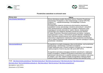 Poradnictwo zawodowe na stronach www Strony www www.doradca-zawodowy.pl Zakres Strona internetowa projektu Narodowe Centrum Zasobów Poradnictwa Zawodowego Poradnictwo w Sieci realizowanego w ramach SPO RZL Działanie 1.1., współfinansowanego z Europejskiego Funduszu Społecznego. Pomyślana jako wsparcie merytoryczne dla doradców zawodowych, specjalistów rozwoju zawodowego, doradców personalnych i wszystkich osób zainteresowanych profesjonalnym postępem świadczenia usług wspierających procesy planowania i wyboru zawodu, dostosowania zawodowego oraz osiągania satysfakcji zawodowej przez klientów. W dziale Poradnictwo zawodowe prezentowane są metody i narzędzia wykorzystywane w pracy z róŜnorodnymi grupami klientów. Znajdują się takŜe informacje zawodoznawcze oraz artykuły praktyków poświęcone róŜnorodnym zagadnieniom świadczenia usług poradnictwa zawodowego. Jest to miejsce prezentacji analiz eksperckich i raportów opisujących aspekty poradnictwa i doradztwa. www.euroguidance.pl Euroguidance to projekt propagujący ideę eurodoradztwa, czyli poradnictwa edukacyjnego i zawodowego w wymiarze europejskim. Projekt realizowany jest w ramach programu Leonardo da Vinci będącego częścią programu Uczenie się przez całe Ŝycie (2007-2013) Euroguidance jest siecią zrzeszającą doradców zawodowych z większości krajów europejskich. Działania Euroguidance skierowane są do doradców zawodowych zatrudnionych w systemie edukacji oraz doradców rynku pracy. W związku z tym cele i zadania projektu Euroguidance realizują zespoły robocze (centra) usytuowane w resortach edukacji i/lub resortach pracy Źródła: http://www.doradca-zawodowy.pl; http://www.kowez.edu.pl; http://www.psz.praca.gov.pl; http://www.zdz-net.pl; http://www.progra.pl; http://www.ohp.pl; http://eurodoradztwo.praca.gov.pl; http://www.sdsiz.pl; http://cm.ecorys.pl; http://www.euroguidance.pl Sporządzono: Lipiec 2010 r. Opracowano w CIZ Kraków krajów europejskich, które przystąpiły do projektu. Centra są krajowymi koordynatorami projektu. W jednym kraju moŜe być nawet kilka, bądź kilkanaście Centrów. Zespoły te współpracują ze sobą tworząc sieć transnacjonalnego poradnictwa zawodowego SIEĆ EUROGUIDANCE. Głównym celem Euroguidance jest wspieranie mobilności edukacyjnej i zawodowej uczniów realizowane poprzez: - wytwarzanie, gromadzenie i rozpowszechnianie informacji na temat moŜliwości kształcenia i szkolenia zawodowego w Polsce i państwach europejskich; - doskonalenie kadry doradców zawodowych dla krajowego systemu doradztwa zawodowego i orientacji zawodowej – szkolenia, seminaria, konferencje; - działalność wydawniczo-popularyzatorską – publikacje. www.kowez.edu.pl Strona Krajowego Ośrodka Wspierania Edukacji Zawodowej i Ustawicznej centralnej, publicznej placówki doskonalenia nauczycieli o ogólnopolskim zasięgu działania. Organem prowadzącym Ośrodek jest Ministerstwo Edukacji Narodowej. KOWEZiU inspiruje, przygotowuje i koordynuje zadania w zakresie kształcenia i doskonalenia zawodowego nauczycieli kształcenia zawodowego oraz nauczycieli szkół dla dorosłych. KOWEZiU opracowuje i realizuje przedsięwzięcia edukacyjne związane z kolejnymi etapami przemian edukacyjnych w Polsce. Ośrodek współpracuje z innymi centralnymi placówkami edukacyjnymi oraz instytucjami rządowymi i organizacjami pozarządowymi w kraju i za granicą. Zajmuje się takŜe gromadzeniem, przetwarzaniem i rozpowszechnianiem informacji pedagogicznej z zakresu kształcenia zawodowego. Źródła: http://www.doradca-zawodowy.pl; http://www.kowez.edu.pl; http://www.psz.praca.gov.pl; http://www.zdz-net.pl; http://www.progra.pl; http://www.ohp.pl; http://eurodoradztwo.praca.gov.pl; http://www.sdsiz.pl; http://cm.ecorys.pl; http://www.euroguidance.pl Sporządzono: Lipiec 2010 r. Opracowano w CIZ Kraków http://eurodoradztwo.praca.gov.pl/publikacje.html Zeszyty informacyjno-metodyczne doradcy zawodowego www.psz.praca.gov.pl Portal publicznych słuŜb zatrudnienia; informacje o usługach rynku pracy; dane statystyczne; adresy urzędów pracy; publikacje; Klasyfikacja zawodów i specjalności; Doradca 2000. www.malopolska.ohp.pl/pl/6240/0/Jednostki_Organizacyjne.htm Strona Ochotniczych Hufców Pracy w Małopolsce. l Prezentuje zakres usług oferowanych przez jednostki organizacyjne OHP w Małopolsce, w tym: - Centra Edukacji i Pracy MłodzieŜy - MłodzieŜowe Biura Pracy - Kluby Pracy - Mobilne Centra Informacji Zawodowej - MłodzieŜowe Centra Kariery - Punkt Pośrednictwa Pracy - Ośrodki Szkolenia Zawodowego. www.progra.pl Strona firmy PROGRA powstałej na bazie osób zajmujących się tworzeniem informacji zawodowej. Firma zajmuje się tworzeniem innowacyjnych produktów – oprogramowania komputerowego związanego z poradnictwem zawodowym, planowaniem kariery, czy teŜ zawierającego testy do samobadania. Kadrę stanowią znani i cenieni w naszym kraju wysokiej klasy specjaliści związani z tematyką rozwoju zawodowego człowieka, poradnictwem zawodowym i rynkiem pracy. Zajmują się oni na co dzień profesjonalnie problematyką orientacji i poradnictwa zawodowego – oddziaływując na zasoby ludzkie. Współpracownicy to osoby, które tworzyły pionierskie rozwiązania w poradnictwie zawodowym i budowały pierwsze Centra Informacji Zawodowej w Polsce. Źródła: http://www.doradca-zawodowy.pl; http://www.kowez.edu.pl; http://www.psz.praca.gov.pl; http://www.zdz-net.pl; http://www.progra.pl; http://www.ohp.pl; http://eurodoradztwo.praca.gov.pl; http://www.sdsiz.pl; http://cm.ecorys.pl; http://www.euroguidance.pl Sporządzono: Lipiec 2010 r. Opracowano w CIZ Kraków www.zdz-net.pl Strona ZDZ Net: Ogólnopolska Sieć Niepublicznych Agencji Poradnictwa Zawodowego. ZDZ-Net to sieć stu niepublicznych agencji poradnictwa zawodowego znajdujących się na terenie całej Polski, w których usługi świadczy wykwalifikowana kadra doradców stale doskonaląca swoją wiedzę i umieję