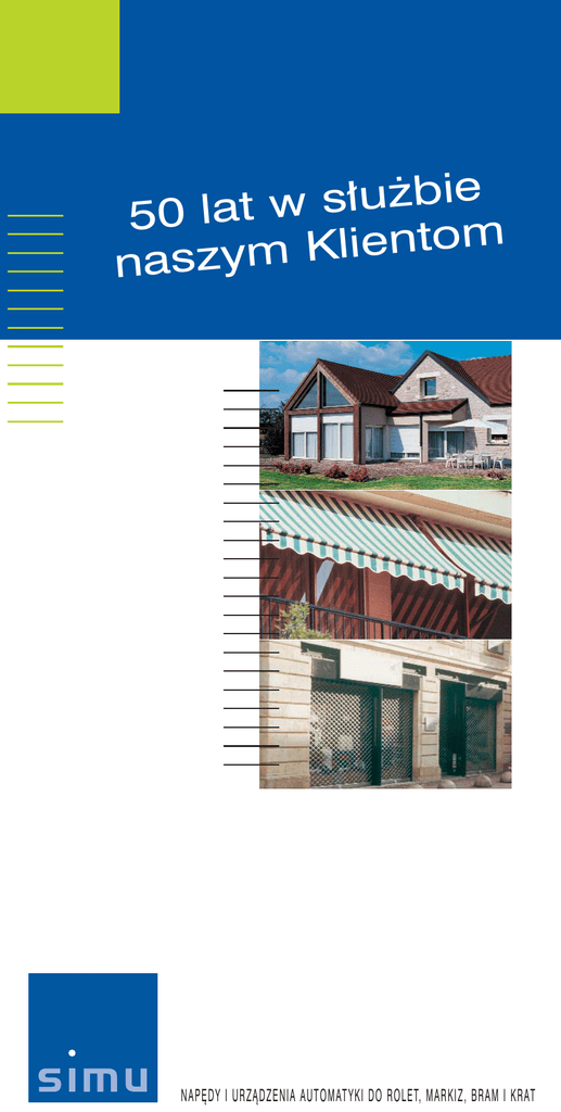 ie b ż u ł s w t 50 la m o t n e i l K naszym NAPĘDY I URZĄDZENIA AUTOMATYKI DO ROLET, MARKIZ, BRAM I KRAT SIMU projektuje, produkuje i sprzedaje kompletne rozwiązania motoryzacyjne dla zamknięć i urządzeń z zakresu zabezpieczeń przeciwsłonecznych w przemyśle budowlanym. Dzięki skonsolidowanym w ciągu 50 lat doświadczeniom na rynku rolet, markiz, zamknięć przemysłowych i handlowych, SIMU osiągnęło uznawaną biegłość i bliskie kontakty ze swoimi odbiorcami. Firma stawia na wiedzę w zakresie aktualnych i przyszłych potrzeb swoich klientów. Wprowadza na rynek innowacyjne rozwiązania wzbogacając swoją ofertę produktów oraz optymalizuje procesy montażowe. Historia: 1952 Utworzenie SIMU, firmy wyspecjalizowanej w produkcji części metalowych do montażu rolet i żaluzji, krat i zasłon przemysłowych. 1956 SIMU wynalazło pierwszy napęd rurowy, który szybko odniósł sukces przyspieszając rozwój SIMU we Francji i na arenie międzynarodowej. 1959 SIMU koncentruje się na napędach i kompletuje ofertę przez proponowanie automatycznych sterowań. 1990 SIMU przystępuje do SOMFY INTERNATIONAL, lidera w zakresie napędów, automatyki zasłon (markiz) i rolet. Wymiana doświadczeń, współpraca w strategiach i zasobach finansowych, przynosi nowe wymiary dla SIMU. 1997 SIMU i IMBAC stwarzają SIMBAC lidera w systemach i komponentach dla rolet i zasłon (markiz). 2001 SIMBAC łączy się z hiszpańską firmą GAVIOTA. 2002 SIMU koncentruje dodatkowe środki rozwojowe wraz z nową organizacją i ambitnym planem produkcji. Wyrazem tego jest nowe logo. 2 Dokładne dane: Roczna sprzedaż: • 60 milionów Euro Zatrudnienie: • 250 osób w siedzibie głównej • 100 osób na całym świecie: 5 filii (Niemcy, Polska, Czechy, Holandia, USA) Możliwości produkcyjne: • 1 milion napędów rocznie Sprzedanych ponad 6 milionów napędów Przemysłowe i logistyczne siły organizacji: • potencjał produkcyjny: 1 milion napędów w ciągu roku, • półautomatyczne linie montażowe, • organizacja ZPRO (zespoły produkcyjne z rozszerzoną odpowiedzialnością) w celu: - rozwinięcia ducha zespołowego, - dostarczania pracownikom koniecznej autonomii, - wyznaczania dynamiki stałego postępu, • logistyka wyposażona w bardzo skuteczne PZP (Planowanie Zasobów Przedsiębiorstwa) 3 Polityka jakościowa: SIMU wdraża wymagającą politykę jakościową całego łańcucha przemysłowego od rozwoju produktu do komercjalizacji poprzez: • sprawdzony proces rozwoju jak i plany wymogów produktu, • pełną kontrolę łańcucha dostaw przeprowadzaną zgodnie z kontraktami zawierającymi gwarancje jakościowe, • pełną kontrolę produkcji i indywidualną kontrolę każdego napędu. Laboratorium testowe w usłudze polityki jakościowej: Współpracujące z działami badań rozwoju i uprzemysłowienia Laboratorium Testowe SIMU jest wyposażone w liczne stanowiska testowe oraz przyrządy pomiarowe. Jego najważniejszym zadaniem jest kwalifikowanie nowych produktów oraz udoskonalanie istniejących. • 100 stanowisk testowych, • 1 pomieszczenie klimatyczne: (-)40°/+80° do testowania napędów w najbardziej ekstremalnych warunkach, z możliwością regulacji poziomu wilgotności, • 1 pomieszczenie z klimatyzacją do testów standardowych, • Ponad 450 testów rocznie, począwszy od wytrzymałości mechanicznej, stabilności elektrycznej aż do prób trwałości i testów przegrzania, itp., itd. • Testy potwierdzające zgodność z właściwymi standardami dla wymagających tego napędów (NF, CEBEC, IMQ, KEMA, VDE itp. itd.) 4 Od połowy stycznia 1996 r. SIMU POLSKA Sp. z o.o. istnieje jako dystrybutor SIMU w Polsce i cieszy się dużym powodzeniem Siedziba SIMU POLSKA Sp.z o.o. Nasz zespół w Kielcach oferuje Państwu: • dostawę składowanych towarów w ciągu 48 godzin • techniczne wsparcie w zakresie produktów i systemów • grupowe i indywidualne programy szkoleniowe, • marketingowe wsparcie w zakresie istniejących jak i nowych produktów, • kompetentny, szybki i przyjazny serwis • bardzo dobrą i fachową obsługę Dzięki doskonałej opiece nad klientami, nasz udział w polskim rynku stale wzrasta. Serwis i jakość są naszym znakiem fabrycznym i przyczyniają się w jednakowym stopniu do rozbudowywania naszej pozycji na rynku. SIMU należy do innowacyjnych oferentów w branży. Jesteśmy Państwa najlepszym partnerem w zakresie systemów napędowych i sterowań do rolet,markiz, bram i krat. 5 Zakres kompletnych, zoptymalizowanych produktów: Napędy • • • • • • • rurowe, zewnętrzne oraz centralne momenty obrotowe od 3 do 800 Nm z ręcznym awaryjnym sterowaniem lub bez z progresywnym układem wyłączników krańcowych z automatyczną regulacją wyłączników krańcowych (MSR) ze zintegrowanym układem radiowym z adaptacjami i uchwytami do wszystkich potrzebnych aplikacji Układy sterowania i automatyki: 6 Konwencjonalne: • przełączniki • zegary • sterowania grupowe • sterowania przewodowe Radiowe: • system sterowania FRS z różnymi rodzajami nadajników do wszystkich rodzajów sterowań: indywidualne, wielokrotne, grupowe i ogólne, • zintegrowane z napędami (T5 Hz.01, MSHz.01 i DMI 5 Hz.01) systemy sterowania radiowego • zegary FRS Urządzenia automatyki: • Windy • WZ 2200 • Zegary Akcesoria: • zestawy adaptacyjne • uchwyty • boki • szelki antywłamaniowe • hamulce bezpieczeństwa • akcesoria bezpieczeństwa Nowości roku 2004: Napędy • • • • • • • Napędowe systemy radiowe: MSHz.01 / T5 Hz.01 / DMI 5 Hz.01 Zegar sterujący Hz Przewodowy zegar sterujący Simubox SI Digicode Windy Hz SIMU na całym świecie: Polska Holandia Niemcy Francja Czechy USA Firma międzynarodowa. Jeden z liderów w branży (we Francji i USA nr 2 na rynku). Siedziba główna w Gray we Francji. 5 filii: Polska, Niemcy, Czechy, Holandia, USA. Dystrybutorzy w ponad 40 krajach. 7 SIMU POLSKA SP. Z O.O 25-61