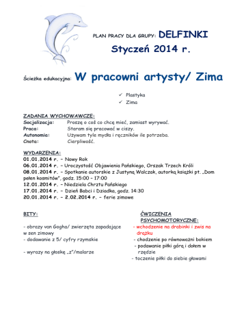 PLAN PRACY DLA GRUPY: DELFINKI Styczeń 2014 r. Ścieżka edukacyjna: W pracowni artysty/ Zima Plastyka Zima ZADANIA WYCHOWAWCZE: Socjalizacja: Proszę o coś co chcę mieć, zamiast wyrywać. Praca: Staram się pracować w ciszy. Autonomia: Używam tyle mydła i ręczników ile potrzeba. Cnota: Cierpliwość. WYDARZENIA: 01.01.2014 r. – Nowy Rok 06.01.2014 r. – Uroczystość Objawienia Pańskiego, Orszak Trzech Króli 08.01.2014 r. – Spotkanie autorskie z Justyną Walczak, autorką książki pt. „Dom pełen kosmitów”, godz. 15:00 – 17:00 12.01.2014 r. – Niedziela Chrztu Pańskiego 17.01.2014 r. – Dzień Babci i Dziadka, godz. 14:30 20.01.2014 r. – 2.02.2014 r. – ferie zimowe BITY: - obrazy van Gogha/ zwierzęta zapadające w sen zimowy - dodawanie z 5/ cyfry rzymskie - wyrazy na głoskę „z”/malarze ĆWICZENIA PSYCHOMOTORYCZNE: - wchodzenie na drabinki i zwis na drążku - chodzenie po równoważni bokiem - podawanie piłki górą i dołem w rzędzie - toczenie piłki do siebie głowami ĆWICZENIA LOGOPEDYCZNE: puszczanie baniek mydlanych szybkie, energiczne dalekie wyrzucanie języka przenoszenie za pomocą słomki kuleczek waty rozciąganie i ściąganie ust przy głoskach „e” i „u” dmuchiwanie świeczki chrząkanie „Dzisiaj w Betlejem” Dzisiaj w Betlejem, dzisiaj w Betlejem wesoła nowina, że Panna czysta, że Panna czysta porodziła Syna. Chrystus się rodzi, nas oswobodzi, Anieli grają, króle witają, pasterze śpiewają, bydlęta klękają, cuda, cuda ogłaszają. X2 2. Maryja Panna, Maryja Panna Dzieciątko piastuje, i Józef Święty, i Józef Święty Ono pielęgnuje. Chrystus się rodzi, nas oswobodzi, Anieli grają, króle witają, pasterze śpiewają, bydlęta klękają, cuda, cuda ogłaszają.x2 3. Choć w stajeneczce, choć w stajeneczce Panna syna rodzi Przecież On wkrótce, przecież On wkrótce ludzi oswobodzi Chrystus się rodzi, nas oswobodzi, Anieli grają, króle witają, pasterze śpiewają, bydlęta klękają, cuda, cuda ogłaszają.x2 „Wśród nocnej ciszy” 1. Wśród nocnej ciszy głos się rozchodzi: wstańcie, pasterze, Bóg się wam rodzi. Czym prędzej się wybierajcie, do Betlejem pośpieszajcie przywitać Pana. 2. Poszli, znaleźli Dzieciątko w żłobie z wszystkimi znaki, danymi sobie. Jako Bogu cześć Mu dali, a witając zawołali z wielkiej radości 3. Ach witaj, Zbawco, z dawna żądany, cztery tysięcy lat wyglądany. Na Ciebie króle, prorocy czekali, a Tyś tej nocy nam się objawił. Wiersze: „Styczeń” Jerzy Ficowski Nowy Rok zawitał wreszcie stary sobie poszedł. Co tam rośnie w mrozach stycznia? Dzień rośnie po trosze! Wróbelkowi serce rośnie, że wiosny doczeka, chociaż jeszcze droga do niej mroźna i daleka. Rosną w styczniu zaspy śniegu, że wóz w nich ugrzęźnie a na szybach rosną srebrne liście i gałęzie. Więc na inne pory roku, nie patrzy zazdrośnie mroźny styczeń: bo w nim także mnóstwo rzeczy rośnie! WIERSZ LOGOPEDYCZNY: A. Wojtowicz „Liski” Leży w norce lisek. Stoi obok żona. Wygraża mu łapką, bo jest obrażona. Co włożę do garnka, gdy pusta spiżarka? Żywo! Wstawaj, mój panie i na polowanie! ZAGADKI: Lepi się go, lecz nie z gliny ani z plasteliny. Daje się mu miotłę w rękę, żeby nam wyglądał pięknie. (bałwan) Co to za woda, twarda jak kamień? Można na łyżwach ślizgać się na niej. (lód) Noworocznych wiele życzeń niesie dzieciom mroźny... (styczeń) W jakiej stołówce za każde danie, goście dziękują nam – ćwierkaniem? (karmik) Szybko po lodzie niosą nas one, obie do butów są przyczepione. (łyżwy) Wszystkie pojazdy na świecie muszą mieć koła, jak wiecie. A te, nie mają ich wcale! Zimą jeździ się na nich wspaniale. (sanki) Kiedy mrozik szczypie, Kiedy śnieżek pada, Każdy ją natychmiast Na głowę zakłada. (czapka) Co to za żeberka przy ścianie wiszące, co latem są zimne, a zimą gorące? (grzejniki) Wesoły dzwoneczek i sznur saneczek. (kulig) AUDYCJE MUZYCZNE: Jan Sebastian Bach – „ Koncert d- moll na dwoje skrzypiec’’ Georg Philipp Telemann – „Koncert C- dur” Allegro JĘZYK ANGIELSKI: TEMATY SŁOWNICTWO I GRAMATYKA BITY WINTER skis, ice, ice skates, snowflake, sledge, snowman, snowballs, snow, cold, icicles WINTER VOCABULARY WINTER SPORTS MONTHS OF THE YEAR WINTER SPORTS snowboarding, skiing, ice skating, ice hockey, ski jumping NUMBERS 1-70 Liczby 1-70 January, February, March, April, May, June July, August, September, October, November, December SONGS: SILENT NIGHT Silent night! Holy night! All is calm, all is bright round yon virgin mother and child, Holy infant so tender and mild, sleep in Heavenly peace! sleep in Heavenly peace!