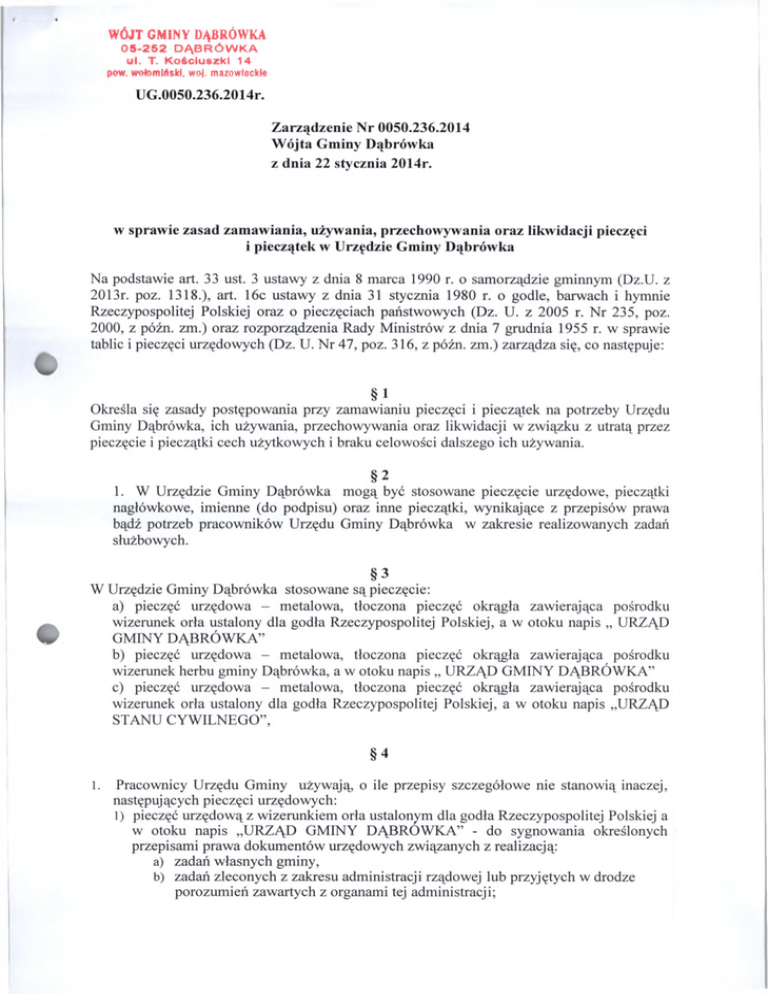WÓJT GMINY DĄBRÓWKA 0 5 -2 5 2 D Ą B R Ó W K A ul. T. K o ś c iu s z k i 14 pow. wołomiński, wo|. mazowieckie UG.0050.236.2014r. Zarządzenie Nr 0050.236.2014 Wójta Gminy Dąbrówka z dnia 22 stycznia 2014r. w sprawie zasad zamawiania, używania, przechowywania oraz likwidacji pieczęci i pieczątek w Urzędzie Gminy Dąbrówka Na podstawie art. 33 ust. 3 ustawy z dnia 8 marca 1990 r. o samorządzie gminnym (Dz.U. z 2013r. poz. 1318.), art. 16c ustawy z dnia 31 stycznia 1980 r. o godle, barwach i hymnie Rzeczypospolitej Polskiej oraz o pieczęciach państwowych (Dz. U. z 2005 r. Nr 235, poz. 2000, z późn. zm.) oraz rozporządzenia Rady Ministrów z dnia 7 grudnia 1955 r. w sprawie tablic i pieczęci urzędowych (Dz. U. Nr 47, poz. 316, z późn. zm.) zarządza się, co następuje: §1 Określa się zasady postępowania przy zamawianiu pieczęci i pieczątek na potrzeby Urzędu Gminy Dąbrówka, ich używania, przechowywania oraz likwidacji w związku z utratą przez pieczęcie i pieczątki cech użytkowych i braku celowości dalszego ich używania. §2 1. W Urzędzie Gminy Dąbrówka mogą być stosowane pieczęcie urzędowe, pieczątki nagłówkowe, imienne (do podpisu) oraz inne pieczątki, wynikające z przepisów prawa bądź potrzeb pracowników Urzędu Gminy Dąbrówka w zakresie realizowanych zadań służbowych. §3 W Urzędzie Gminy Dąbrówka stosowane są pieczęcie: a) pieczęć urzędowa - metalowa, tłoczona pieczęć okrągła zawierająca pośrodku wizerunek orła ustalony dla godła Rzeczypospolitej Polskiej, a w otoku napis „ URZĄD GMINY DĄBRÓWKA” b) pieczęć urzędowa - metalowa, tłoczona pieczęć okrągła zawierająca pośrodku wizerunek herbu gminy Dąbrówka, a w otoku napis „ URZĄD GMINY DĄBRÓWKA” c) pieczęć urzędowa - metalowa, tłoczona pieczęć okrągła zawierająca pośrodku wizerunek orła ustalony dla godła Rzeczypospolitej Polskiej, a w otoku napis „URZĄD STANU CYWILNEGO”, §4 1. Pracownicy Urzędu Gminy używają, o ile przepisy szczegółowe nie stanowią inaczej, następujących pieczęci urzędowych: 1) pieczęć urzędową z wizerunkiem orła ustalonym dla godła Rzeczypospolitej Polskiej a w otoku napis „URZĄD GMINY DĄBRÓWKA” - do sygnowania określonych przepisami prawa dokumentów urzędowych związanych z realizacją: a) zadań własnych gminy, b) zadań zleconych z zakresu administracji rządowej lub przyjętych w drodze porozumień zawartych z organami tej administracji; 2) pieczęć urzędową z wizerunkiem herbu Gminy z napisem w otoku „ URZĄD GMINY DĄBRÓWKA” - do umieszczania na urzędowych dokumentach okolicznościowych lub o charakterze reprezentacyjnym, sygnowanych przez Wójta Gminy Dąbrówka 3) pieczęć urzędowa - metalowa, tłoczona pieczęć okrągła zawierająca pośrodku wizerunek orła ustalony dla godła Rzeczypospolitej Polskiej, a w otoku napis „URZĄD STANU CYWILNEGO” na dokumentach urzędowych wydawanych przez Urząd Stanu Cywilnego, 4) pieczęć - metalowa, tłoczona pieczęć okrągła zawierająca pośrodku wizerunek orła ustalony dla godła Rzeczypospolitej Polskiej, a w otoku napis „URZĄD GMINY DĄBRÓWKA” stosowana na dokumentach dla rozliczeń związanych z obsługą bankową i kasową budżetu Gminy. Odcisku pieczęci nie umieszcza się na kopiach dokumentów składanych do akt Urzędu Gminy. Pracownicy Urzędu Gminy są odpowiedzialni za używanie pieczęci zgodnie z obowiązującymi przepisami prawa. §5 1. W Urzędzie Gminy Dąbrówka stosowane są pieczątki nagłówkowe, imienne (do podpisu) i inne. 2. Uprawnionymi do korzystania z imiennych pieczątek w Urzędzie Gminy są: a) Wójt Gminy Dąbrówka b) Zastępca Wójta Gminy Dąbrówka c) Sekretarz Gminy Dąbrówka d) Skarbnik Gminy Dąbrówka. e) Kierownicy referatów f) Pracownicy, których zakres powierzonych zadań i czynności służbowych uzasadnia posługiwanie się taką pieczątką. 3. Pieczątki imienne innej treści, mogą posiadać i stosować następujące osoby: a) „z up. Wójta” - pracownicy, w granicach indywidualnego pisemnego upoważnienia Wójta Gminy Dąbrówka. §6 1.W Urzędzie Gminy w Biurze Obsługi Interesanta i obsługi Rady Gminy stosowane są pieczątki nagłówkowe i imienne ( do podpisu). 2. Uprawnionymi do korzystania z imiennych pieczątek są: a) przewodniczący Rady Gminy b) zastępca przewodniczącego Rady Gminy c) przewodniczący Komisji Rady Gminy 3. Uprawnionymi do korzystania z pieczątki nagłówkowej Rady Gminy są: a) przewodniczący Rady Gminy b) zastępca przewodniczącego Rady Gminy c) pracownik, którego zakres powierzonych zadań i czynności służbowych uzasadnia posługiwanie się taką pieczątką. §7 1.Wniosek w sprawie zamówienia pieczęci lub pieczątki winien zawierać: a) treść pieczęci lub pieczątki, b) rozmiar pieczęci c) uzasadnienie, d) potwierdzenie zasadności wyrobienia pieczęci lub pieczątki przez przełożonego. 2. Wniosek w sprawie zamówienia wykonania pieczęci lub pieczątki należy składać do sekretarza gminy , który dokonuje sprawdzenia jego treści pod względem formalno prawnym, potwierdza zgodność w zakresie danych personalnych i zajmowanego stanowiska służbowego, następnie dokonuje stosownego zlecenia wykonania pieczęci lub pieczątki. Wzór zamówienia o którym mowa w niniejszym paragrafie stanowi załącznik nr 1 do zarządzenia. §8 1. Po wykonaniu pieczęci lub pieczątki sekretarz gminy dokonuje ich rejestracji w „Ewidencji pieczęci urzędowych” lub w „Ewidencji pieczątek imiennych oraz stempli”. Wzór Ewidencji pieczęci i pieczątek imiennych i nagłówkowych stanowi załącznik nr 2 do zarządzenia. 2. Ewidencja powinna być systematycznie aktualizowana i wykazywać aktualny stan posiadania pieczęci, pieczątek oraz stempli. 3. Pieczęcie i pieczątki wydawane są za imiennym potwierdzeniem odbioru (czytelny podpis odbierającego i data). §9 . Pieczęcie i pieczątki stosuje się wy