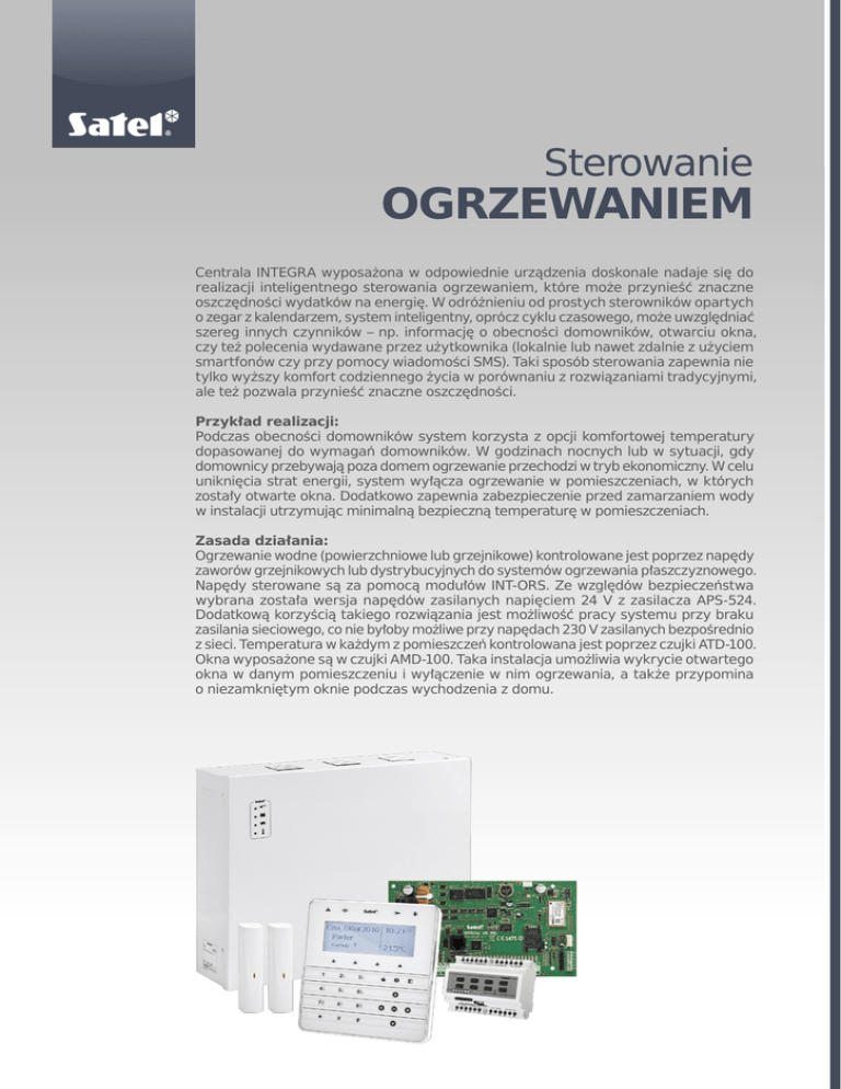 Sterowanie OGRZEWANIEM Centrala INTEGRA wyposażona w odpowiednie urządzenia doskonale nadaje się do realizacji inteligentnego sterowania ogrzewaniem, które może przynieść znaczne oszczędności wydatków na energię. W odróżnieniu od prostych sterowników opartych o zegar z kalendarzem, system inteligentny, oprócz cyklu czasowego, może uwzględniać szereg innych czynników – np. informację o obecności domowników, otwarciu okna, czy też polecenia wydawane przez użytkownika (lokalnie lub nawet zdalnie z użyciem smartfonów czy przy pomocy wiadomości SMS). Taki sposób sterowania zapewnia nie tylko wyższy komfort codziennego życia w porównaniu z rozwiązaniami tradycyjnymi, ale też pozwala przynieść znaczne oszczędności. Przykład realizacji: Podczas obecności domowników system korzysta z opcji komfortowej temperatury dopasowanej do wymagań domowników. W godzinach nocnych lub w sytuacji, gdy domownicy przebywają poza domem ogrzewanie przechodzi w tryb ekonomiczny. W celu uniknięcia strat energii, system wyłącza ogrzewanie w pomieszczeniach, w których zostały otwarte okna. Dodatkowo zapewnia zabezpieczenie przed zamarzaniem wody w instalacji utrzymując minimalną bezpieczną temperaturę w pomieszczeniach. Zasada działania: Ogrzewanie wodne (powierzchniowe lub grzejnikowe) kontrolowane jest poprzez napędy zaworów grzejnikowych lub dystrybucyjnych do systemów ogrzewania płaszczyznowego. Napędy sterowane są za pomocą modułów INT-ORS. Ze względów bezpieczeństwa wybrana została wersja napędów zasilanych napięciem 24 V z zasilacza APS-524. Dodatkową korzyścią takiego rozwiązania jest możliwość pracy systemu przy braku zasilania sieciowego, co nie byłoby możliwe przy napędach 230 V zasilanych bezpośrednio z sieci. Temperatura w każdym z pomieszczeń kontrolowana jest poprzez czujki ATD‑100. Okna wyposażone są w czujki AMD-100. Taka instalacja umożliwia wykrycie otwartego okna w danym pomieszczeniu i wyłączenie w nim ogrzewania, a także przypomina o niezamkniętym oknie podczas wychodzenia z domu. konfiguracja wejść ••• konfiguracja wyjść ••• Sterowanie OGRZEWANIEM konfiguracja czujki temperatury konfiguracja timerów konfiguracja blokad www.satel.pl (IND_0312) ul. Franciszka Schuberta 79, 80-172 Gdańsk tel.: (58) 320 94 00; fax: (58) 320 94 01 e-mail: [email protected]