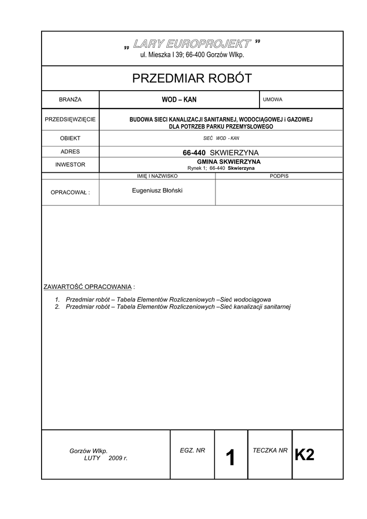 „ LARY EUROPROJEKT ” ul. Mieszka I 39; 66-400 Gorzów Wlkp. PRZEDMIAR ROBÓT WOD – KAN BRANŻA UMOWA PRZEDSIĘWZIĘCIE BUDOWA SIECI KANALIZACJI SANITARNEJ, WODOCIĄGOWEJ i GAZOWEJ DLA POTRZEB PARKU PRZEMYSŁOWEGO OBIEKT SIEĆ WOD - KAN ADRES 66-440 SKWIERZYNA GMINA SKWIERZYNA INWESTOR Rynek 1; 66-440 Skwierzyna IMIĘ I NAZWISKO OPRACOWAŁ : PODPIS Eugeniusz Błoński ZAWARTOŚĆ OPRACOWANIA : 1. Przedmiar robót – Tabela Elementów Rozliczeniowych –Sieć wodociągowa 2. Przedmiar robót – Tabela Elementów Rozliczeniowych –Sieć kanalizacji sanitarnej Gorzów Wlkp. LUTY 2009 r. EGZ. NR 1 TECZKA NR K2 PRZEDMIAR ROBÓT – TABELA ELEMENTÓW ROZLICZENIOWYCH Lp. Podstawa wyceny 1 2 1 1 1 2 3 4 5 6 7 8 Opis pozycji kosztorysowych 3 KANALIZACJA SANITARNA - CZĘŚĆ GRAWITACYJNA Ilość J.m. Cena jedn. Wartość 4 5 6 7 ROZBIÓRKI I NAPRAWA NAWIERZCHNI DROGOWYCH (AW) BCR. 1.1.3.003040 (AW) BCR. 1.1.3.001060 (AW) BCR. 4.1.2.015050 (AW) BCI. .2.1.032-050 Rozebranie krawężników [do ponownego montażu] 2,00 m Rozbiórka ław pod krawężnik betonowy 0,40 m3 Ręczne rozebranie nawierzchni z kostki betonowej na podsypce cementowo-piaskowej 5,00 m2 Podsypka cementowo-piaskowa z zagęszczeniem mechanicznym - 3 cm grubości warstwy po zagęszczeniu 5,00 m2 (AW) BCI. .5.1.002-060 (AW) BCI. .5.2.003-040 (AW) BCI. .4.4.004-050 Ława pod krawężnik betonowa z betonu B-15 z oporem 0,40 m3 Krawężniki uliczne betonowe o wym. 15 x 30 cm 2,00 m Nawierzchnie drogowe z kostki brukowej grub. 8 cm "dwuteownik" 20 x 16,5 cm na podsypce z piasku grub. 5 cm 5,00 m2 (AW) BCI. .2.1.027-050 Utwardzenie gruntu; stabilizacja podłoża cementem, do Rm=1,5 MPa, grubość warstwy po zagęszczeniu 10 cm. Wykopy na terenie dróg gruntowych 103,50 m2 Razem: 2 ROBOTY ZIEMNE I PRZYGOTOWAWCZE 9 (AW) BCI. .3.6.001-060 Próbne wykopy i przekopy o długości 2,0 m; do lokalizacji uzbrojenia podziemnego i dołączeń sieci do zbiorników i budynków .Wykopy liniowe i szerokoprzestrzenne o ścianach pochyłychpod fundamenty, rurociągi i kolektory w gruncie suchym z wydobyciem urobku łopatą lub wyciągiem ręcznym - o głęb. do 3,0 m, szerokości do 3,0 m, kategoria gruntu 34. ANALOGIA. 24,00 m3 10 (AW) BCI. .3.8.002-060 Ręczne zasypywanie próbnych wykopów i przekopów liniowych o ścianach pionowych głębokość do 3,0 m, szerokość 1,6-2,5 m, kat. gruntu 3-4 24,00 m3 11 (AW) BCI. .3.11.003050 Umocnienie ażurowe pionowych ścian wykopów próbnych o szer. do 1,0 m, wypraskami stalowymi wraz z rozbiórką, w gruntach kat. 3-4, przy zagłębieniu do 3,0 m 40,00 m2 System kosztorysowania WINBUD Kosztorys Prof (wer. 2008.30) str 1 1 12 2 (AW) Cena BP-060 3 Dopłata za ręczne wykopy [różnica do robót mechanicznych] na odcinku sieci. Wykopy liniowe o ścianach pionowych pod fundamenty, rurociągi i kolektory w gruncie suchym z wydobyciem urobku łopatą lub wyciągiem ręcznym - o głęb. do 6,0 m, szerokości 0,8-1,5 m, kategoria gruntu 3-4 4 78,94 5 m3 13 (AW) Cena BP-060 Dopłata za ręczną zasypkę wykopów [róznica do robót mechanicznych]. Ręczne zasypywanie wykopów liniowych o ścianach pionowych - głębokość wykopu do 3,0 m, szerokość 0,8-1,5 m, kat. gruntu 3-4 94,88 m3 14 (AW) BCI. .3.12.005050 Dopłata za umocnienie ścian wykopów liniowych o szer.1,1-1,8m, w gruntach nawodnionych kat.3 grodzicami wbijanymi pionowo na głębokość do 6,0 m, wraz z rozbiórką 143,52 m2 Razem: 3 ROBOTY INSTALACYJNE 15 (AW) BCI. 2.1.4.003040 Sieć kanalizacyjna Dn 200, z rur PVC-U SN8 ze ścianką 125,00 litą, montowanych metodą na wcisk przy użyciu uszczelki gumowej. Kanały z rur ułożone w wykopach umocnionych o głębokości do 3,0 m, w gruncie kat. 3, wykopy wykonywane mechanicznie z wywozem gruntu na odkład czasowy na odl. 1 km, umocnienia wykopu wypraskami, podsypka z piasku grub. 20 cm, obsypka piaskiem do wys. 30 cm ponad wierzch rury. Zasypanie wykopów ziemią dowiezioną z odkładu z zagęszczaniem warstwami. m 16 (AW) BCI. 2.7.006-040 Przeciski pod torem i drogą dojazdową, na średniej głęb. 2,50 m, odcinki do 200 m wraz z komorami przeciskowymi i z odwodnieniem, średnica rury ochronnej do Dn 400 mm 21,00 m 17 (AW) BCI. 2.7.014-040 Powyżej 2,50 m, dodatek za każde zwiększenie głębokości o 0,5 m 21,00 m 18 (AW) BCI. 2.2.5.004040 (AW) BCI. 2.3.3.003020 Rury przeciskowe Dn 400 z rur PE-100; SDR 17,6 21,00 m Studnie Dn 1000 mm; H=2,0 m; w gruncie kat.3-4, z prefabrykowanych elementów, z betonu B45. Studnia posiada całkowicie wykończoną kinetę z osadzonymi króćcami wlotowymi i wylotowymi oraz wyprofilowaną rynną spływową. Pomiędzy kręgami studni osadzone są uszczelki zapewniające pełną wodoszczelność po zmontowaniu. Zakończenie studni włazem kanałowym żeliwnym śr. 600 mm. Łączenie elementów betonowych klejem do betonu.Wykopy wykonywane częściowo mechanicznie z wywozem gruntu na odkład, umocnienie wykopu wypraskami lub ścianką szczelną z odwodnieniem gruntu. 4,00 szt 19 System kosztorysowania WINBUD Kosztorys Prof (wer. 2008.30) str 2 6 7 1 20 2 (AW) BCI. 2.3.3.013020 3 Studnie Dn 1200 mm; H=2,5 m; z prefabrykowanych elementów B45, z uszczelkami. Studnia z kinetą z osadzonymi króćcami wlotowymi i wylotowymi, wyprofilowaną rynną spływową i klamry złazowe. Zakończenie studni : właz kanałowy żeliwno-betonowym klasy D400; śr. 600 mm obsadzony na betonowych płytach dystansowych D 600; żelbetowa płyta nadstudzienna i żelbetowy pierścień oporowy. Łączenie elementów betonowych klejem do betonu.Wykopy wykonywane częściowo mechanicznie z wywozem gruntu na odkład, umocnienie wykopu wypraskami lub ścianką szczelną z odwodnieniem gruntu. 4 3,00 5 szt Razem: 4 ODWODNIENIE WYKOPÓW 21 (AW) BCI. .5.1.004-020 Igłofiltry Dn 63 wpłukiwane w grunt z obsypką do głębokości 4,0 m [zestaw 50 m w rozstawie co 1,0m]/ 58,00 szt 22 KNNR 1 0603-01010149 Pompowanie przy braku stałego źródła energii. Zestaw pompa elektr. 240 m3/h + agregat prąd