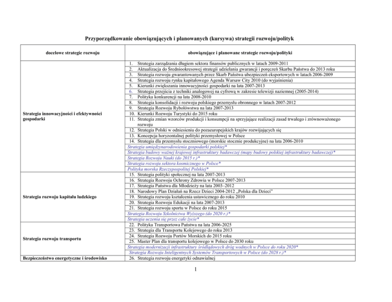 Przyporządkowanie obowiązujących i planowanych (kursywa) strategii rozwoju/polityk obowiązujące i planowane strategie rozwoju/polityki docelowe strategie rozwoju Strategia innowacyjności i efektywności gospodarki Strategia rozwoju kapitału ludzkiego Strategia rozwoju transportu Bezpieczeństwo energetyczne i środowisko 1. 2. 3. 4. 5. 6. 7. 8. 9. 10. 11. Strategia zarządzania długiem sektora finansów publicznych w latach 2009-2011 Aktualizacja do Średniookresowej strategii udzielania gwarancji i poręczeń Skarbu Państwa do 2013 roku Strategia rozwoju gwarantowanych przez Skarb Państwa ubezpieczeń eksportowych w latach 2006-2009 Strategia rozwoju rynku kapitałowego Agenda Warsaw City 2010 (do wyjaśnienia) Kierunki zwiększania innowacyjności gospodarki na lata 2007-2013 Strategia przejścia z techniki analogowej na cyfrową w zakresie telewizji naziemnej (2005-2014) Polityka konkurencji na lata 2008-2010 Strategia konsolidacji i rozwoju polskiego przemysłu obronnego w latach 2007-2012 Strategia Rozwoju Rybołówstwa na lata 2007-2013 Kierunki Rozwoju Turystyki do 2015 roku Strategia zmian wzorców produkcji i konsumpcji na sprzyjające realizacji zasad trwałego i zrównowaŜonego rozwoju 12. Strategia Polski w odniesieniu do pozaeuropejskich krajów rozwijających się 13. Koncepcja horyzontalnej polityki przemysłowej w Polsce 14. Strategia dla przemysłu stoczniowego (morskie stocznie produkcyjne) na lata 2006-2010 Strategia umiędzynarodowienia gospodarki polskiej* Strategia budowy waŜnej krajowej infrastruktury badawczej (mapy budowy polskiej infrastruktury badawczej)* Strategia Rozwoju Nauki (do 2015 r.)* Strategia rozwoju sektora kosmicznego w Polsce* Polityka morska Rzeczypospolitej Polskiej* 15. Strategia polityki społecznej na lata 2007-2013 16. Strategia Rozwoju Ochrony Zdrowia w Polsce 2007-2013 17. Strategia Państwa dla MłodzieŜy na lata 2003–2012 18. Narodowy Plan Działań na Rzecz Dzieci 2004-2012 „Polska dla Dzieci” 19. Strategia rozwoju kształcenia ustawicznego do roku 2010 20. Strategia Rozwoju Edukacji na lata 2007-2013 21. Strategia rozwoju sportu w Polsce do roku 2015 Strategia Rozwoju Szkolnictwa WyŜszego (do 2020 r.)* Strategia uczenia się przez całe Ŝycie* 22. Polityka Transportowa Państwa na lata 2006-2025 23. Strategia dla Transportu Kolejowego do roku 2013 24. Strategia Rozwoju Portów Morskich do 2015 roku 25. Master Plan dla transportu kolejowego w Polsce do 2030 roku Strategia modernizacji infrastruktury śródlądowych dróg wodnych w Polsce do roku 2020* Strategia Rozwoju Inteligentnych Systemów Transportowych w Polsce (do 2028 r.)* 26. Strategia rozwoju energetyki odnawialnej 1 obowiązujące i planowane strategie rozwoju/polityki docelowe strategie rozwoju 27. 28. 29. 30. 31. 32. 33. Sprawne państwo Strategia rozwoju kapitału społecznego Krajowa Strategia Rozwoju Regionalnego – Regiony-miasta-obszary wiejskie Strategia Bezpieczeństwa Narodowego Rzeczypospolitej Polskiej Strategia zrównowaŜonego rozwoju wsi i rolnictwa Polityka energetyczna Polski do 2025 r. (Polityka energetyczna Polski do roku 2030*) Polityka rządu RP dla przemysłu naftowego w Polsce Polityka dla przemysłu gazu ziemnego Strategia działalności górnictwa węgla kamiennego w Polsce w latach 2007-2015 Polityka klimatyczna Polski wraz z krajową strategią redukcji emisji gazów cieplarnianych w Polsce do roku 2020 Polityka ekologiczna państwa (obecnie na lata 2009-2012 z perspektywą do roku 2016) Krajowa strategia ochrony i zrównowaŜonego uŜytkowania róŜnorodności biologicznej (wraz z programem Działań, obecnie na lata 2007-2013, dokument przygotowywany na 7 lat) - rezygnacja ze strategii oznacza konieczność nowelizacji ustawy o ochronie przyrody oraz włączenia problematyki do innych dokumentów Narodowa Strategia Gospodarowania Wodami 2030 (z uwzględnieniem etapu 2015)* 34. Program zwalczania korupcji – Strategia Antykorupcyjna. II etap wdraŜania 2005-2009 35. Strategia polityki konsumenckiej na lata 2007-2009 Ramowa Strategia Promocji Polski do 2015 roku* Strategia zarządzania zasobami ludzkimi w słuŜbie cywilnej* 36. Strategia wspierania rozwoju społeczeństwa obywatelskiego na lata 2009-2015 37. Strategia rozwoju społeczeństwa informacyjnego do roku 2013 38. Narodowa Strategia Rozwoju Kultury na lata 2004-2013 , Uzupełnienie Narodowej Strategii Rozwoju Kultury na lata 2005-2020 Polityka audiowizualna* Strategia digitalizacji zasobów dziedzictwa kulturowego* 39. Strategia rozwoju społeczno-gospodarczego Polski Wschodniej do roku 2020 40. Strategia Bezpieczeństwa Narodowego Rzeczypospolitej Polskiej 41. Strategia udziału Sił Zbrojnych RP w operacjach międzynarodowych 42. Krajowy Plan Strategiczny Rozwoju Obszarów Wiejskich na lata 2007-2013 Kierunki rozwoju obszarów wiejskich* * strategie w trakcie opracowywania lub planowane do opracowania 2