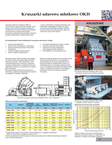 Kruszarki udarowe m otkowe OKD Kruszarki udarowe m otkowe OKD s! maszynami o nowoczesnej konstrukcji, które !cz! w sobie zalety kruszarek udarowych i m otkowych. Kruszarki OKD s! przewa"nie przeznaczone do jednostopniowego kruszenia wydobywanego wapienia, dolomitu, kamienia gipsowego, margla wapiennego KRUSZENIE i innych materia ów o #redniej twardo#ci oraz materia ów zawieraj!cych lepkie i y i gliny. zazwyczaj w technologii produkcji cementu kruszarki OKD s! stosowane tam, gdzie we m ynie jest u"yty m yn kulowy. Do najwi kszych zalet m!otkowych kruszarek udarowych nale"y: ! wysoka niezawodno#$ ! niskie koszty eksploatacji i utrzymania ! d uga "ywotno#$ g ównych elementów krusz!cych ! wysoka wydajno#$ jednostkowa ! wysoki stopie% rozdrobnienia ! korzystne jednostkowe zu"ycie energii ! korzystne uziarnienie produktu ! zdolno#$ kruszenia materia ów zawieraj!cych lepkie sk adniki ! niewra"liwo#$ na przedmioty obce Wirnik kruszarek OKD posiada pokrywaj!ce si& m otki, które pokrywaj! ca ! szeroko#$ robocz! kruszarki. Takie wykonanie, wraz z konstrukcj! komory kruszenia, zapewnia wysokie rozdrobnienie i mo"liwo#$ przerobu materia ów, których w przesz o#ci nie mo"na by o przerabia$. Ruszt jest drug! cz&#ci! robocz! komory kruszenia i ogranicza zastosowanie kruszarki ze wzgl&du na lepko#$ materia u. Wirnik jest skonstruowany tak, aby pr&ty rusztu pe ni y rol& bezpiecznika w razie dostania niemo"liwego do skruszenia przedmiotu do komory kruszenia. Katastrofalne szkody s! minimalizowane w przypadku z amania pr&ta rusztu. Nie dojdzie do kontaktu kawa ków pr&ta rusztu z rotuj!cymi m otkami, ale wypadaj! swobodnie do zsuwni umieszczonej pod kruszark!. Kruszarka udarowa m otkowa OKD 1155 – kruszenie surowca do produkcji cementu. Rysunek kruszarki udarowej m otkowej OKD 1155 z nap!dem. Kruszarka udarowa m otkowa OKD 1155 – odchylona cz!"# skrzyni z rusztem. G!ówne parametry techniczne pr dko#$ d!ugo#$ szeroko#$ silnik el. typ wej#cie obwodowa maks. ca!kowita ca!kowita wysoko ! wirnika** wydajno ! m3 mm mm t/h mm mm mm kW 0,01 300 25 20 - 35 1330 2330 * 1500 30-35 OKD 1151 0,01 300 25 45 - 70 1330 2800 * 1500 55-75 OKD 1152 0,08 600 25 70 - 100 2000 3650 * 2300 100-130 OKD 1153.1 0,25 900 25 130-180 3500 4500 2900 200-250 OKD 1153.2 0,3 900 25 190-250 3700 4700 2900 250-315 OKD 1154 0,5 1200 25 240 - 320 5450 6300 3600 320-500 OKD 1155 0,75 1500 25 370 - 500 5850 9000 4500 500-800 OKD 1156 1 1800 25 550 - 720 6500 9500 5450 1000-1250 OKD 1158 1,2 1800 25 720 - 1100 7200 10100 5400 1400-2000 * bezpo#redni nap&d (na "yczenie mo"na dostarczy$ z nap&dem pasowym). ** 90% do 25 mm przy szczelinie rusztu 40 mm. Podane wydajno#ci s! informacyjne i zale"! od w a#ciwo#ci i sk adu kruszonego materia u oraz sposobu podawania. pozosta o#$ na sicie [%] OKD 1150 Sk!ad granulometryczny produktu otwór kwadratowego sita [mm] Obszar mi&dzy krzywymi charakteryzuje zdolno#$ kruszenia maszyn w zale"no#ci od wielko#ci i rodzaju kruszonego materia u. 23