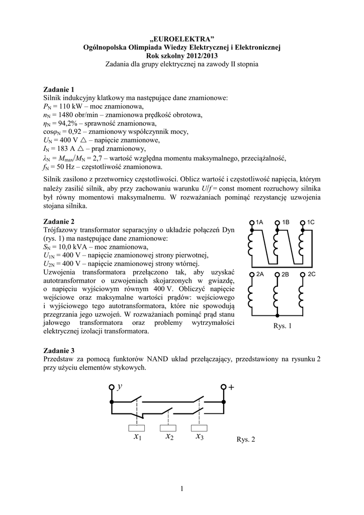 „EUROELEKTRA” Ogólnopolska Olimpiada Wiedzy Elektrycznej i Elektronicznej Rok szkolny 2012/2013 Zadania dla grupy elektrycznej na zawody II stopnia Zadanie 1 Silnik indukcyjny klatkowy ma następujące dane znamionowe: PN = 110 kW – moc znamionowa, nN = 1480 obr/min – znamionowa prędkość obrotowa, ηN = 94,2% – sprawność znamionowa, cosφN = 0,92 – znamionowy współczynnik mocy, UN = 400 V – napięcie znamionowe, IN = 183 A – prąd znamionowy, λN = Mmax/MN = 2,7 – wartość względna momentu maksymalnego, przeciążalność, fN = 50 Hz – częstotliwość znamionowa. Silnik zasilono z przetwornicy częstotliwości. Oblicz wartość i częstotliwość napięcia, którym należy zasilić silnik, aby przy zachowaniu warunku U/f = const moment rozruchowy silnika był równy momentowi maksymalnemu. W rozważaniach pominąć rezystancję uzwojenia stojana silnika. Zadanie 2 Trójfazowy transformator separacyjny o układzie połączeń Dyn (rys. 1) ma następujące dane znamionowe: SN = 10,0 kVA – moc znamionowa, U1N = 400 V – napięcie znamionowej strony pierwotnej, U2N = 400 V – napięcie znamionowej strony wtórnej. Uzwojenia transformatora przełączono tak, aby uzyskać autotransformator o uzwojeniach skojarzonych w gwiazdę, o napięciu wyjściowym równym 400 V. Obliczyć napięcie wejściowe oraz maksymalne wartości prądów: wejściowego i wyjściowego tego autotransformatora, które nie spowodują przegrzania jego uzwojeń. W rozważaniach pominąć prąd stanu jałowego transformatora oraz problemy wytrzymałości elektrycznej izolacji transformatora. 1A 1B 1C 2A 2B 2C Rys. 1 Zadanie 3 Przedstaw za pomocą funktorów NAND układ przełączający, przedstawiony na rysunku 2 przy użyciu elementów stykowych. y + x1 x2 x3 1 Rys. 2 Zadanie 4 Z rozdzielni oddziałowej R1, zasilanej z rozdzielni głównej RG (rys. 3), zasilane są następujące odbiorniki trójfazowe: - trzy silniki indukcyjne M1 o danych: PN = 22 kW – moc znamionowa, ηN = 91% – sprawność znamionowa, cosφN = 0,90ind – znamionowy współczynnik mocy, UN = 400 V ∆ – znamionowe napięcie zasilania, IN = 38,8 A ∆ – prąd znamionowy; - dwa silniki indukcyjne M2 o danych: PN = 11 kW – moc znamionowa, ηN = 89% – sprawność znamionowa, cosφN = 0,76ind – znamionowy współczynnik mocy, UN = 400 V ∆ – znamionowe napięcie zasilania, IN = 23,5 A ∆ – prąd znamionowy; - bojler trójfazowy B o danych: PN = 4,5 kW – moc znamionowa, ηN = 94% – sprawność znamionowa, UN = 400 V Υ – znamionowe napięcie zasilania, IN = 6,6 A Υ – prąd znamionowy; - silnik synchroniczny MS o danych: PN = 55 kW- moc znamionowa ηN = 92% – sprawność znamionowa, cosφN = 0,80poj – znamionowy współczynnik mocy, UN = 400 V Υ – znamionowe napięcie zasilania, IN = 107,9 A Υ – prąd znamionowy. Dobierz moc baterii kondensatorów energetycznych niskiego napięcia (na 400 V), która w pełni skompensuje moc bierną, pobieraną z rozdzielni R1. Należy przyjąć, że wszystkie odbiorniki obciążone są znamionowo. W którym miejscu należy zainstalować baterię: w rozdzielni głównej RG, czy też w rozdzielni oddziałowej R1? RG R1 M ~ M ~ M ~ M ~ M M1 M1 M1 M2 M2 ~ Opracował Sprawdził dr inż. Mirosław Miszewski. PESA Bydgoszcz dr inż. Sławomir Cieślik UTP Bydgoszcz 2 B MS Rys. 3 Zatwierdził Przewodniczący Rady Naukowej Olimpiady dr inż. Sławomir Cieślik