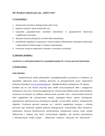 III. Konkurs plastyczny pn. „EKO wieś”. 1. Cel projektu : 1. promowanie nawyków ekologicznego stylu życia; 2. poprawa estetyki i stanu środowiska wsi; 3. racjonalne gospodarowanie zasobami naturalnymi w gospodarstwie domowym i najbliższym otoczeniu; 4. ukazanie korzyści płynących ze środowiska naturalnego; 5. przybliżenie zagadnień związanych z zastosowaniem infrastruktury chroniącej środowisko i odnawialnych źródeł energii w miejscu zamieszkania; 6. zwrócenie uwagi na zagrożenia związane z rozwojem cywilizacji. 2. Adresaci projektu : uczniowie ze szkół gimnazjalnych i ponadgimnazjalnych z terenu powiatu kieleckiego 3. Formy pracy: indywidualna Zainteresowane szkoły gimnazjalne i ponadgimnazjalne uczestniczą w konkursie, po uprzednim zgłoszeniu przez dyrekcję placówki, na przygotowanym przez organizatora konkursu formularzu (www.powiat.kielce.pl - zakładka Konkursy ekologiczne, IX edycja). Konkurs ma na celu ukazać przyrodę jako źródło niewyczerpanych dóbr i propagować ekologiczny styl życia. Przed przystąpieniem do wykonywania plakatu (praca indywidualna), uczniowie na lekcjach czy kółkach zainteresowań, powinni wraz z nauczycielami poruszyć takie zagadnienia jak: poszanowanie energii, segregacja śmieci, uprawy ekologiczne, gospodarstwa agroturystyczne, przydomowe ogródki, oczyszczalnie ścieków, kompostownie odpadów. Uczniowie powinni zapoznać się i omówić zagadnienia związane z ochroną powietrza (np. kotłownie opalane paliwem ekologicznym, termoizolacje, filtry kominowe, katalizatory, benzyna bezołowiowa), możliwościami zmniejszenia zużycia wody, energii elektrycznej i cieplnej oraz ilości wytwarzanych odpadów, jak również korzystaniem z alternatywnych źródeł energii – elektrownie wiatrowe, słoneczne itd. Nauczyciele – opiekunowie konkursów wskazują na różnice między żywnością wyprodukowaną metodami ekologicznymi a tradycyjnymi. Po omówieniu ww. zagadnień, uczniowie mogą odbyć wycieczkę po najbliższej okolicy, aby porozmawiać z mieszkańcami na temat ekologicznego stylu życia oraz zachęcić ich do stosowania rozwiązań ekologicznych w codziennym życiu. Uczniowie za pośrednictwem szkoły nadsyłają prace konkursowe – plakat w formacie A3 lub A2 (inne formaty plakatu nie będą oceniane). Nadesłany plakat musi być pracą własną, indywidualną, nigdzie wcześniej nie publikowaną i przedstawianą na innych konkursach. Na konkurs każdy uczeń może przesłać/przekazać tylko jedną pracę. Plakat powinien być czytelnie podpisany: tytuł konkursu, nazwa szkoły, klasa, imię i nazwisko ucznia - autora pracy, imię i nazwisko nauczyciela lub nauczycieli (opiekuna lub opiekunów konkursu), telefon kontaktowy. 4. Komisja konkursowa Wyboru najciekawszych prac dokona komisja konkursowa powołana przez Starostę Kieleckiego. 5. Wybór nagrodzonych prac Przy wyborze laureatów najciekawszych plakatów, komisja będzie kierowała się następującymi kryteriami: 1) trafność doboru tematyki z tematem konkursu, 2) jasność przekazu, 3) możliwość oddziaływania na wyobraźnię, 4) względy estetyczne. 6. Terminy i czas realizacji projektu: 1) ogłoszenie projektu - wrzesień 2012 roku, 2) zgłoszenie uczestnictwa - do dnia 5 listopada 2012 roku do Starostwa Powiatowego w Kielcach, Al. IX Wieków 3, 25–516 Kielce, fax. (041) 344-28-25, e-mail: [email protected] [email protected] 3) termin składania prac (plakatu) - do dnia 29 marca 2013 roku osobiście do siedziby Starostwa Powiatowego w Kielcach (pokoje numer 212b lub 232) lub na adres jw. 4) wyłonienie pięciu laureatów i wręczenie nagród - do dnia 26 kwietnia 2013 roku. 7. Nagrody indywidualne I miejsce – sprzęt sportowy o wartości ok. 350,00 zł II miejsce - sprzęt sportowy o wartości ok. 250,00 zł III miejsce – sprzęt sportowy o wartości ok. 200,00 zł 2 wyróżnienia – sprzęt sportowy o wartości 2 x ok. 150,00 zł = ok. 300,00 zł Łączny koszt nagród: około 1 100,00 zł 8. Uwagi ogólne 1. Organizator zastrzega sobie prawo odwołania projektu, gdy liczba nadesłanych prac będzie mniejsza niż 15 uczestników. 2. Organizator zastrzega sobie prawo dokonania zmian w zakresie rodzaju i wartości przyznanych nagród. 3. Opiekunowie konkursu w okresie trwania Programu edukacji ekologicznej dla powiatu kieleckiego pn. „Dla Ziemi, dla siebie”, w roku szkolnym 2012/2013 otrzymają pisemne podziękowania za opiekę merytoryczną nad uczestnikami konkursu. 4. Istnieje możliwość odbioru prac (plakatów) po wręczeniu nagród laureatom, najpóźniej do dnia 28 czerwca 2013 roku. Po tym okresie prace zostaną przekazane innym zainteresowanym lub zniszczone. Organizator zastrzega sobie prawo do dysponowania przekazanymi na konkurs plakatami, w celu promowania własnego wizerunku, poprzez ich publiczne udostępnianie (wystawa w siedzibie Starostwa Powiatowego w Kielcach), publikowanie na portalu internetowym www.powiat.kielce.pl, w mediach informujących o konkursie, folderach, kalendarzu oraz innych materiałach reklamowych. W każdym jednak ww. przypadku, określony zostanie autor plakatu. 5. Szkoły zobowiązane są do wypełnienia „Potwierdzenia liczby uczestników Programu” na formularzu znajdującym się na stronie organizatora (www.powiat.kielce.pl - zakładka Konkursy ekologiczne, IX edycja), po zrealizowaniu konkursu. Potwierdzenie należy złożyć z chwilą przekazywania prac (plakatów) lub do dnia wręczania nagród laureatom konkursu tj. 26 kwietnia 2013 roku.