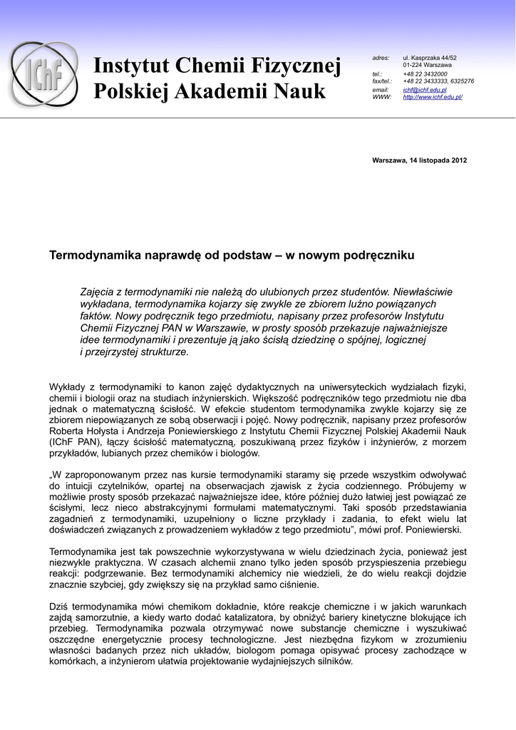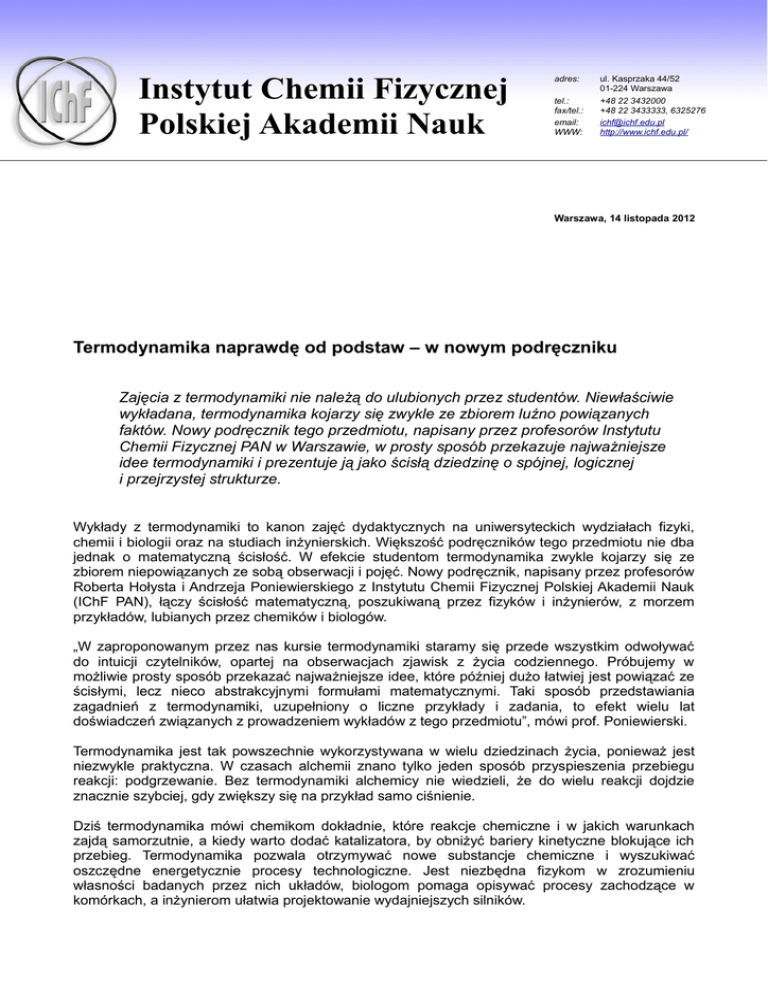 Instytut Chemii Fizycznej Polskiej Akademii Nauk adres: tel.: fax/tel.: email: WWW: ul. Kasprzaka 44/52 01-224 Warszawa +48 22 3432000 +48 22 3433333, 6325276 [email protected] http://www.ichf.edu.pl/ Warszawa, 14 listopada 2012 Termodynamika naprawdę od podstaw – w nowym podręczniku Zajęcia z termodynamiki nie należą do ulubionych przez studentów. Niewłaściwie wykładana, termodynamika kojarzy się zwykle ze zbiorem luźno powiązanych faktów. Nowy podręcznik tego przedmiotu, napisany przez profesorów Instytutu Chemii Fizycznej PAN w Warszawie, w prosty sposób przekazuje najważniejsze idee termodynamiki i prezentuje ją jako ścisłą dziedzinę o spójnej, logicznej i przejrzystej strukturze. Wykłady z termodynamiki to kanon zajęć dydaktycznych na uniwersyteckich wydziałach fizyki, chemii i biologii oraz na studiach inżynierskich. Większość podręczników tego przedmiotu nie dba jednak o matematyczną ścisłość. W efekcie studentom termodynamika zwykle kojarzy się ze zbiorem niepowiązanych ze sobą obserwacji i pojęć. Nowy podręcznik, napisany przez profesorów Roberta Hołysta i Andrzeja Poniewierskiego z Instytutu Chemii Fizycznej Polskiej Akademii Nauk (IChF PAN), łączy ścisłość matematyczną, poszukiwaną przez fizyków i inżynierów, z morzem przykładów, lubianych przez chemików i biologów. „W zaproponowanym przez nas kursie termodynamiki staramy się przede wszystkim odwoływać do intuicji czytelników, opartej na obserwacjach zjawisk z życia codziennego. Próbujemy w możliwie prosty sposób przekazać najważniejsze idee, które później dużo łatwiej jest powiązać ze ścisłymi, lecz nieco abstrakcyjnymi formułami matematycznymi. Taki sposób przedstawiania zagadnień z termodynamiki, uzupełniony o liczne przykłady i zadania, to efekt wielu lat doświadczeń związanych z prowadzeniem wykładów z tego przedmiotu”, mówi prof. Poniewierski. Termodynamika jest tak powszechnie wykorzystywana w wielu dziedzinach życia, ponieważ jest niezwykle praktyczna. W czasach alchemii znano tylko jeden sposób przyspieszenia przebiegu reakcji: podgrzewanie. Bez termodynamiki alchemicy nie wiedzieli, że do wielu reakcji dojdzie znacznie szybciej, gdy zwiększy się na przykład samo ciśnienie. Dziś termodynamika mówi chemikom dokładnie, które reakcje chemiczne i w jakich warunkach zajdą samorzutnie, a kiedy warto dodać katalizatora, by obniżyć bariery kinetyczne blokujące ich przebieg. Termodynamika pozwala otrzymywać nowe substancje chemiczne i wyszukiwać oszczędne energetycznie procesy technologiczne. Jest niezbędna fizykom w zrozumieniu własności badanych przez nich układów, biologom pomaga opisywać procesy zachodzące w komórkach, a inżynierom ułatwia projektowanie wydajniejszych silników. Równocześnie termodynamika jest ścisłą, doskonale sformalizowaną i zamkniętą dziedziną matematyki. David Hilbert, słynny niemiecki matematyk, stwierdził kiedyś, że ze wszystkich dziedzin fizyki właśnie termodynamika była najłatwiejsza do zaksjomatyzowania. „Na wydziałach fizyki termodynamikę często wykłada się w połączeniu z fizyką stastystyczną”, zauważa prof. Hołyst. „Rzecz w tym, że termodynamika wcale nie potrzebuje fizyki statystycznej. Dlatego tej w naszym podręczniku nie ma. Prezentujemy termodynamikę jako spójną konstrukcję wywodzącą się z teorii form różniczkowych”. W pierwszej części podręcznika autorzy zwięźle wprowadzają formalizm form różniczkowych. Opanowanie podstaw matematycznych termodynamiki pozwala dostrzec powiązania między jej różnymi aspektami. „Na przykład nie trzeba odwoływać się do legendarnej – bo nie do zmierzenia – entropii, skoro ma się świadomość, że wszystko, co mówi entropia, mówi nam także energia swobodna Gibbsa, którą można zmierzyć badając na przykład napięcie na bateryjce”, podkreśla prof. Hołyst i dodaje: „Staramy się, aby czytelnik rozumiał, że zamiana entropii na energię swobodną Gibbsa jest podyktowana wyłącznie wygodą człowieka. W końcu po to uczymy się termodynamiki, żeby potem coś mierzyć". Kolejne części podręcznika poświęcono zagadnieniom związanym z przemianami fazowymi oraz termodynamiką reakcji chemicznych. Wszystkie rozdziały zostały zilustrowane dużą liczbą przykładów chemicznych oraz ułatwiającymi zrozumienie zadaniami, zawierają też informacje o metodologii rozwiązywania tych ostatnich. Założenia współczesnej termodynamiki dotyczą układów w stanie równowagi. Nie opisują układów otwartych, które takiego stanu nie posiadają, takich jak człowiek czy, prawdopodobnie, Wszechświat. „Pisząc nasz podręcznik staraliśmy się myśleć perspektywicznie, nie tylko o samych studentach, ale i o rozwoju dziedziny. Uważamy, że tylko naprawdę głębokie zrozumienie termodynamiki układów zamkniętych, na podstawowym, matematycznym poziomie, umożliwi studentom wykroczenie poza jej aksjomaty i ułatwi sformułowanie założeń – dziś jeszcze nieistniejącej – termodynamiki układów otwartych nieposiadających stanu równowagi”, podsumowuje prof. Hołyst. Podręcznik „Thermodynamics for Chemists, Physicists and Engineers” ukazał się niedawno w języku angielskim nakładem wydawnictwa Springer Verlag. Materiał prasowy przygotowany w ramach grantu NOBLESSE z działania „Potencjał badawczy” 7. Programu Ramowego Unii Europejskiej. Instytut Chemii Fizycznej Polskiej Akademii Nauk (http://www.ichf.edu.pl/) został powołany w 1955 roku jako jeden z pierwszych instytutów chemicznych PAN. Profil naukowy Instytutu jest silnie powiązany z najnowszymi światowymi kierunkami rozwoju chemii fizycznej i fizyki chemicznej. Badania naukowe są prowadzone w 9 zakładach naukowych. Działający w ramach Instytutu Zakład Doświadczalny CHEMIPAN wdraża, produkuje i komercjalizuje specjalistyczne związki chemiczne do zastosowań m.in. w rolnic