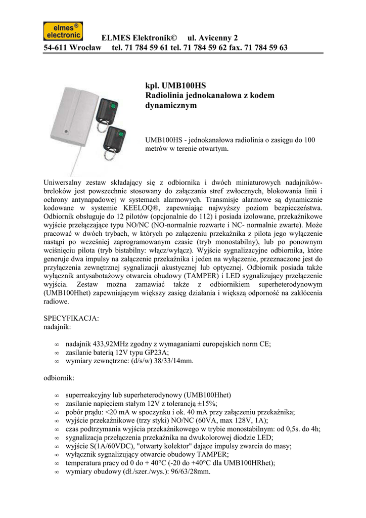 ELMES Elektronik© ul. Avicenny 2 54-611 Wrocław tel. 71 784 59 61 tel. 71 784 59 62 fax. 71 784 59 63 kpl. UMB100HS Radiolinia jednokanałowa z kodem dynamicznym UMB100HS - jednokanałowa radiolinia o zasięgu do 100 metrów w terenie otwartym. Uniwersalny zestaw składający się z odbiornika i dwóch miniaturowych nadajnikówbreloków jest powszechnie stosowany do załączania stref zwłocznych, blokowania linii i ochrony antynapadowej w systemach alarmowych. Transmisje alarmowe są dynamicznie kodowane w systemie KEELOQ®, zapewniając najwyższy poziom bezpieczeństwa. Odbiornik obsługuje do 12 pilotów (opcjonalnie do 112) i posiada izolowane, przekaźnikowe wyjście przełączające typu NO/NC (NO-normalnie rozwarte i NC- normalnie zwarte). Może pracować w dwóch trybach, w których po załączeniu przekaźnika z pilota jego wyłączenie nastąpi po wcześniej zaprogramowanym czasie (tryb monostabilny), lub po ponownym wciśnięciu pilota (tryb bistabilny: włącz/wyłącz). Wyjście sygnalizacyjne odbiornika, które generuje dwa impulsy na załączenie przekaźnika i jeden na wyłączenie, przeznaczone jest do przyłączenia zewnętrznej sygnalizacji akustycznej lub optycznej. Odbiornik posiada także wyłącznik antysabotażowy otwarcia obudowy (TAMPER) i LED sygnalizujący przełączenie wyjścia. Zestaw można zamawiać także z odbiornikiem superheterodynowym (UMB100Hhet) zapewniającym większy zasięg działania i większą odporność na zakłócenia radiowe. SPECYFIKACJA: nadajnik: • • • nadajnik 433,92MHz zgodny z wymaganiami europejskich norm CE; zasilanie baterią 12V typu GP23A; wymiary zewnętrzne: (d/s/w) 38/33/14mm. odbiornik: • • • • • • • • • • superreakcyjny lub superheterodynowy (UMB100Hhet) zasilanie napięciem stałym 12V z tolerancją ±15%; pobór prądu: <20 mA w spoczynku i ok. 40 mA przy załączeniu przekaźnika; wyjście przekaźnikowe (trzy styki) NO/NC (60VA, max 128V, 1A); czas podtrzymania wyjścia przekaźnikowego w trybie monostabilnym: od 0,5s. do 4h; sygnalizacja przełączenia przekaźnika na dwukolorowej diodzie LED; wyjście S(1A/60VDC), "otwarty kolektor" dające impulsy zwarcia do masy; wyłącznik sygnalizujący otwarcie obudowy TAMPER; temperatura pracy od 0 do + 40°C (-20 do +40°C dla UMB100HRhet); wymiary obudowy (dł./szer./wys.): 96/63/28mm. ELMES Elektronik© ul. Avicenny 2 54-611 Wrocław tel. 71 784 59 61 tel. 71 784 59 62 fax. 71 784 59 63 Nowy kształt pilota UMB100HT - od stycznia 2011 w każdym zestawie. PROCEDURY PROGRAMOWANIA Uwaga! Przed programowaniem należy upewnić się, że LED w odbiorniku świeci na czerwono. Jeżeli nie, to należy na krótko rozłączyć zasilanie odbiornika. 1. Programowanie - wprowadzenie pilota do pamięci odbiornika (maksymalnie 12): a) Przycisnąć przycisk PRG w odbiorniku (LED zaświeci na zielono) na czas krótszy niż 3s. Po zwolnieniu przycisku LED dalej świeci na zielono. b) Przycisnąć przycisk pilota. LED w odbiorniku zmieni kolor na czerwony. c) Przycisnąć przycisk pilota drugi raz (w pilotach dwukanałowych ten sam co poprzednio). LED w odbiorniku czterokrotnie zmieni kolor świecenia potwierdzając prawidłowe wykonanie procedury. 2. Programowanie trybu pracy monostabilnej i czasu podtrzymania przełączenia: a) Przycisnąć przycisk PRG w odbiorniku (LED zaświeci na zielono) na czas dłuższy niż 3s, ale krótszy niż 8s. Po zwolnieniu przycisku dioda LED w odbiorniku zmieni kolor na czerwony. b) Przycisnąć przycisk pilota (w pilotach dwukanałowych przycisk odpowiadający kanałowi który programujemy). Nastąpi załączenie przekaźnika. Po upływie żądanego czasu podtrzymania przełączenia ponownie przycisnąć ten sam przycisk pilota - nastąpi wyłączenie przekaźnika. c) Po upływie 2s nastąpi czterokrotna zmiana koloru świecenia diody LED potwierdzająca wykonanie procedury.. 3. Programowanie trybu pracy bistabilnej (włącz/wyłącz): a) Przycisnąć przycisk PRG w odbiorniku (LED zaświeci na zielono) na czas dłuższy niż 3s, ale krótszy niż 8s. Po zwolnieniu przycisku dioda LED w odbiorniku zmieni kolor na czerwony. b) Przycisnąć trzykrotnie przycisk pilota (w pilotach dwukanałowych przycisk odpowiadający kanałowi który programujemy) w odstępach krótszych niż 2 sekundy. Nastąpi załączenie przekaźnika, wyłączenie przekaźnika i potwierdzenie trybu bistabilnego czterokrotną zmianą koloru świecenia diody LED. 4. Kasowanie pamięci pilotów w odbiorniku: Przycisnąć przycisk PRG w odbiorniku (LED zaświeci na zielono) do chwili pierwszej zmiany koloru świecenia diody LED (ponad 8s), a następnie przycisk zwolnić. Czterokrotna ELMES Elektronik© ul. Avicenny 2 54-611 Wrocław tel. 71 784 59 61 tel. 71 784 59 62 fax. 71 784 59 63 zmiana koloru świecenia potwierdza prawidłowe wykonanie procedury. Kody pilotów są wykasowane i odbiornik nie reaguje na wysyłane sygnały. Po wykasowaniu pilotów tryby pracy kanałów odbiornika pozostają nie zmienione. Wprowadzenie pilotów do pamięci wykonać wg pkt. 1 powyżej. Uwaga! wykonanie procedur 2, 3 i 4 możliwe jest tylko przy użyciu pilota będącego w pamięci programowanego odbiornika • Elmes Elektronik deklaruje, że produkt jest zaprojektowany i wykonany zgodnie z normą bezpieczeństwa użytkowania EN 60950-1, normą kompatybilności elektromagnetycznej EN 301 489-1 i normą zgodności w wymaganiami radiowymi EN 300 220-3. Atest Z.R.T.O.M. “TECHOM” (AN) – klasa C. Atest Z.R.T.O.M. “TECHOM” (UMB, DW, DWB) – klasa B. Instytut Łączności – potwierdzenie zgodności nr 181/2001, nr 182/2001, nr 184/2001, 185/2001.