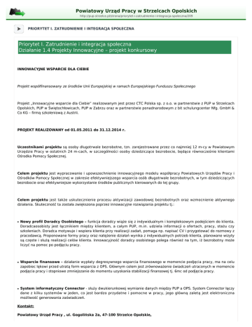 Powiatowy Urząd Pracy w Strzelcach Opolskich http://pup-strzelce.pl/strona/priorytet-i-zatrudnienie-i-integracja-spoleczna/209 PRIORYTET I. ZATRUDNIENIE I INTEGRACJA SPOŁECZNA Priorytet I. Zatrudnienie i integracja społeczna Działanie 1.4 Projekty Innowacyjne – projekt konkursowy INNOWACYJNE WSPARCIE DLA CIEBIE Projekt współfinansowany ze środków Unii Europejskiej w ramach Europejskiego Funduszu Społecznego Projekt „Innowacyjne wsparcie dla Ciebie” realizowanym jest przez CTC Polska sp. z o.o. w partnerstwie z PUP w Strzelcach Opolskich, PUP w Świętochłowicach, PUP w Zabrzu oraz w partnerstwie ponadnarodowym z bit schulungcenter Nfg. GmbH & Co KG – firmą szkoleniową z Austrii. PROJEKT REALIZOWANY od 01.05.2011 do 31.12.2014 r. Uczestnikami projektu są osoby długotrwale bezrobotne, tzn. zarejestrowane przez co najmniej 12 m-cy w Powiatowym Urzędzie Pracy w ostatnich 24 m-cach, w szczególności osoby dziedziczące bezrobocie, będące równocześnie klientami Ośrodka Pomocy Społecznej. Celem projektu jest wypracowanie i upowszechnienie innowacyjnego modelu współpracy Powiatowych Urzędów Pracy i Ośrodków Pomocy Społecznej w zakresie efektywniejszego wsparcia osób długotrwale bezrobotnych, w tym dziedziczących bezrobocie oraz efektywniejsze wykorzystanie środków publicznych kierowanych do tej grupy. Celem projektu jest także uskutecznienie procesu aktywizacji zawodowej bezrobotnych oraz wzmocnienie aktywnego działania. Skuteczność ta została zwiększona poprzez innowacyjne rozwiązania projektu tj.: ● ● ● Nowy profil Doradcy Osobistego – funkcja doradcy wiąże się z indywidualnym i kompleksowym podejściem do klienta. Doradcaosobisty jest łącznikiem między klientem, a całym PUP, m.in. udziela informacji o ofertach, pracy, stażu czy szkoleniach. Doradca motywuje i wspiera klienta przy realizacji zadań, pomaga np. napisać CV i przygotować do rozmowy z pracodawcą. Proponowane formy pracy oraz natężenie działań wynika z indywidualnych potrzeb klienta, planowane wizyty są częste i służą realizacji celów klienta. Innowacyjność doradcy osobistego polega również na tym, iż bezrobotny może liczyć na pomoc po podjęciu pracy. Wsparcie finansowe - działanie wypłaty degresywnego wsparcia finansowego w momencie podjęcia pracy, ma na celu zapobiec lękowi przed utratą form wsparcia z OPS. Głównym celem jest zrównoważenie świadczeń utraconych w momencie podjęcia pracy i stopniowe zmniejszanie do momentu uzyskania stabilizacji finansowej tj. 6mc od podjęcia pracy. System informatyczny Connector - służy dwukierunkowej wymianie danych między PUP a OPS. System Connector łączy dane z kilku systemów w jeden, co jest bardzo przydatne i pomocne w pracy, jego główną zaletą jest elektroniczna możliwość generowania zaświadczeń. Kontakt: Powiatowy Urząd Pracy , ul. Gogolińska 2a, 47-100 Strzelce Opolskie, ● ● ● pokój nr 10, Tel. 77 462 18 72, osoba do kontaktu : Iwona Ordyniec pokój nr 10, Tel. 77 462 18 72, osoba do kontaktu : Patrycja Gazda pokój nr 11, Tel. 77 462 18 09, osoba do kontaktu : Roman Kus