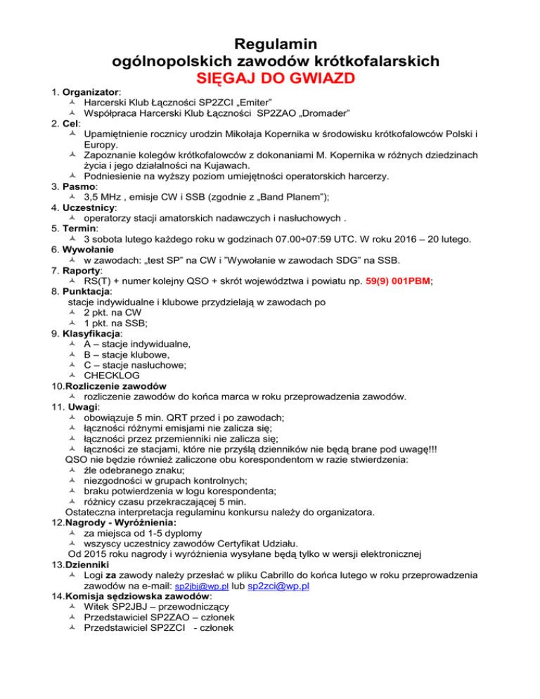 Regulamin ogólnopolskich zawodów krótkofalarskich SIĘGAJ DO GWIAZD 1. Organizator: Harcerski Klub Łączności SP2ZCI „Emiter” Współpraca Harcerski Klub Łączności SP2ZAO „Dromader” 2. Cel: Upamiętnienie rocznicy urodzin Mikołaja Kopernika w środowisku krótkofalowców Polski i Europy. Zapoznanie kolegów krótkofalowców z dokonaniami M. Kopernika w różnych dziedzinach życia i jego działalności na Kujawach. Podniesienie na wyższy poziom umiejętności operatorskich harcerzy. 3. Pasmo: 3,5 MHz , emisje CW i SSB (zgodnie z „Band Planem”); 4. Uczestnicy: operatorzy stacji amatorskich nadawczych i nasłuchowych . 5. Termin: 3 sobota lutego każdego roku w godzinach 07.00÷07:59 UTC. W roku 2016 – 20 lutego. 6. Wywołanie w zawodach: „test SP” na CW i ”Wywołanie w zawodach SDG” na SSB. 7. Raporty: RS(T) + numer kolejny QSO + skrót województwa i powiatu np. 59(9) 001PBM; 8. Punktacja: stacje indywidualne i klubowe przydzielają w zawodach po 2 pkt. na CW 1 pkt. na SSB; 9. Klasyfikacja: A – stacje indywidualne, B – stacje klubowe, C – stacje nasłuchowe; CHECKLOG 10.Rozliczenie zawodów rozliczenie zawodów do końca marca w roku przeprowadzenia zawodów. 11. Uwagi: obowiązuje 5 min. QRT przed i po zawodach; łączności różnymi emisjami nie zalicza się; łączności przez przemienniki nie zalicza się; łączności ze stacjami, które nie przyślą dzienników nie będą brane pod uwagę!!! QSO nie będzie również zaliczone obu korespondentom w razie stwierdzenia: źle odebranego znaku; niezgodności w grupach kontrolnych; braku potwierdzenia w logu korespondenta; różnicy czasu przekraczającej 5 min. Ostateczna interpretacja regulaminu konkursu należy do organizatora. 12.Nagrody - Wyróżnienia: za miejsca od 1-5 dyplomy wszyscy uczestnicy zawodów Certyfikat Udziału. Od 2015 roku nagrody i wyróżnienia wysyłane będą tylko w wersji elektronicznej 13.Dzienniki Logi za zawody należy przesłać w pliku Cabrillo do końca lutego w roku przeprowadzenia zawodów na e-mail: [email protected] lub [email protected] 14.Komisja sędziowska zawodów: Witek SP2JBJ – przewodniczący Przedstawiciel SP2ZAO – członek Przedstawiciel SP2ZCI - członek