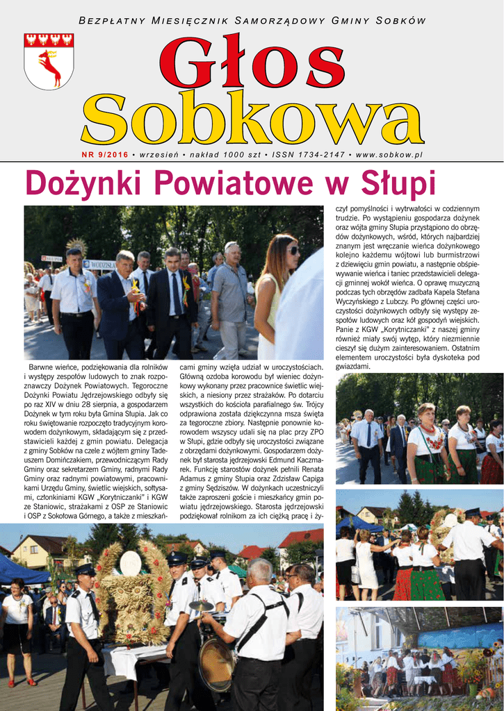 B e z p ł at n y M i e s i ę c z n i k S a m o r z ą d o w y G m i n y S o b k ó w Głos Sobkowa N R 9 / 2 0 1 6 • w r z e s i e ń • n a k ł a d 1 0 0 0 s z t • I S S N 1 7 3 4 - 2 1 4 7 • w w w. s o b k o w. p l Dożynki Powiatowe w Słupi Barwne wieńce, podziękowania dla rolników i występy zespołów ludowych to znak rozpoznawczy Dożynek Powiatowych. Tegoroczne Dożynki Powiatu Jędrzejowskiego odbyły się po raz XIV w dniu 28 sierpnia, a gospodarzem Dożynek w tym roku była Gmina Słupia. Jak co roku świętowanie rozpoczęto tradycyjnym korowodem dożynkowym, składającym się z przedstawicieli każdej z gmin powiatu. Delegacja z gminy Sobków na czele z wójtem gminy Tadeuszem Domińczakiem, przewodniczącym Rady Gminy oraz sekretarzem Gminy, radnymi Rady Gminy oraz radnymi powiatowymi, pracownikami Urzędu Gminy, świetlic wiejskich, sołtysami, członkiniami KGW „Korytniczanki” i KGW ze Staniowic, strażakami z OSP ze Staniowic i OSP z Sokołowa Górnego, a także z mieszkań- cami gminy wzięła udział w uroczystościach. Główną ozdoba korowodu był wieniec dożynkowy wykonany przez pracownice świetlic wiejskich, a niesiony przez strażaków. Po dotarciu wszystkich do kościoła parafialnego św. Trójcy odprawiona została dziękczynna msza święta za tegoroczne zbiory. Następnie ponownie korowodem wszyscy udali się na plac przy ZPO w Słupi, gdzie odbyły się uroczystości związane z obrzędami dożynkowymi. Gospodarzem dożynek był starosta jędrzejowski Edmund Kaczmarek. Funkcję starostów dożynek pełnili Renata Adamus z gminy Słupia oraz Zdzisław Capiga z gminy Sędziszów. W dożynkach uczestniczyli także zaproszeni goście i mieszkańcy gmin powiatu jędrzejowskiego. Starosta jędrzejowski podziękował rolnikom za ich ciężką pracę i ży- czył pomyślności i wytrwałości w codziennym trudzie. Po wystąpieniu gospodarza dożynek oraz wójta gminy Słupia przystąpiono do obrzędów dożynkowych, wśród, których najbardziej znanym jest wręczanie wieńca dożynkowego kolejno każdemu wójtowi lub burmistrzowi z dziewięciu gmin powiatu, a następnie obśpiewywanie wieńca i taniec przedstawicieli delegacji gminnej wokół wieńca. O oprawę muzyczną podczas tych obrzędów zadbała Kapela Stefana Wyczyńskiego z Lubczy. Po głównej części uroczystości dożynkowych odbyły się występy zespołów ludowych oraz kół gospodyń wiejskich. Panie z KGW „Korytniczanki” z naszej gminy również miały swój wytęp, który niezmiennie cieszył się dużym zainteresowaniem. Ostatnim elementem uroczystości była dyskoteka pod gwiazdami. 2 GŁOS SOBKOWA – wrzesień 2016 Dożynki w Chomentowie W niedzielę 4 września 2016 roku w Chomentowie miały miejsce dożynki parafialne. Tradycyjna ceremonia rozpoczęła się barwnym korowodem, w którym mieszkańcy Chomentowa przemaszerowali, niosąc wieniec dożynkowy. Korowód poprowadzili starostowie dożynek Irena Woźniczko i Zbigniew Gidel. Następnie wszyscy uczestniczyli we mszy św. w intencji rolników, homilię gościnie głosił ks. dr Marcin Rokita dyrektor ekonomiczny Kurii Diecezjalnej w Kielcach, po czym starostowie i dzieci przekazali bochen chleba oraz dary ziemi proboszczowi ks. Pawłowi Kolanowskiemu. Gospodarz naszej parafii serdecznie powitał wszystkich przybyłych na święto plonów oraz skierował słowa podziękowania do rolników za tegoroczne zbiory. Po uroczystościach w kościele przedstawiciele Chomentowa zaprosili uczestników dożynek na poczęstunek składający się z plonów, potraw regionalnych i wypieków. Całe wydarzenie uświetnione było śpiewem i akompaniamentem artystów zespołu Drochowianie. Dożynki parafialne w Korytnicy Dwa tygodnie wcześniej, przed dożynkami w Chomentowie, w sąsiedniej parafii – Korytnicy, również odbyły się Dożynki Parafialne. W dożynkach wzięła udział liczna grupa mieszkańców tej i pozostałych miejscowości z parafii. Uroczystą mszę świętą odprawił proboszcz Korytnicy ks. Eustachiusz Ptak. Podczas dożynek organizowanych w Korytnicy nie mogło zabraknąć mieszkanek tej wioski tj. członkiń Koła Gospodyń Wiejskich „Korytniczanki”, które w pięknych strojach wzięły udział w tym tradycyjnym święcie plonów. Jak co roku Starostwo Powiatowe w Jędrzejowie z Świętokrzyską Izbą Rolniczą w Kielcach oraz Świętokrzyskim Ośrodkiem Doradztwa Rolniczego w Modliszewicach ogłosiło konkurs, którego celem jest ochrona środowiska naturalnego polskiej wsi oraz mobilizacja mieszkańców do dbałości o utrzymanie czystości, porządku i bezpieczeństwa w gospodarstwie. Podobnie jak w ubiegłych latach, również XVIII edycja konkursu w swoim założeniu miała na celu poprawę estetyki oraz warunków higieniczno- sanitarnych zagród wiejskich w celu zwiększenia bezpieczeństwa pracy. Na szczeblu gminnym po konsultacjach z sołtysami oraz innymi rolnikami z naszej gminy do konkursu został zgłoszony rolnik z Brzegów – Tomasz Krzywda, który w swojej działalności rolniczej zajmuje się głównie uprawą zbóż. Gospodarstwo Pana Tomasza jako laureat na szczeblu powiatowym zostało zgłoszone do szczebla wojewódzkiego. W dniu 4 września br. podczas Dożynek Wojewódzkich w Końskich wręczono nagrody i wyróżnienia dla 13 finalistów z województwa świętokrzyskiego, spośród których Anna i Tomasz Krzywda z Brzegów otrzymali wyróżnienie jako finaliści etapu wojewódzkiego XVIII edycji konkursu „Piękna i bezpieczna zagroda – przyjazna środowisku”. Gratulujemy rolnikowi z naszej gminy, a pozostałych właścicieli gospodarstw rolnych zachęcamy do podejmowania przedsięwzięć organizacyjno-technicznych nie tylko w swoim gospodarstwie, ale także w środowisku wiejskim. fot. Mariusz Łężniak Konkurs „Piękna i bezpieczna zagroda – przyjazna środowisku” rozstrzygnięty GŁOS SOBKOWA – wrzesień 2016 3 Sprawozdanie z działalności Wójta Gminy między ses
