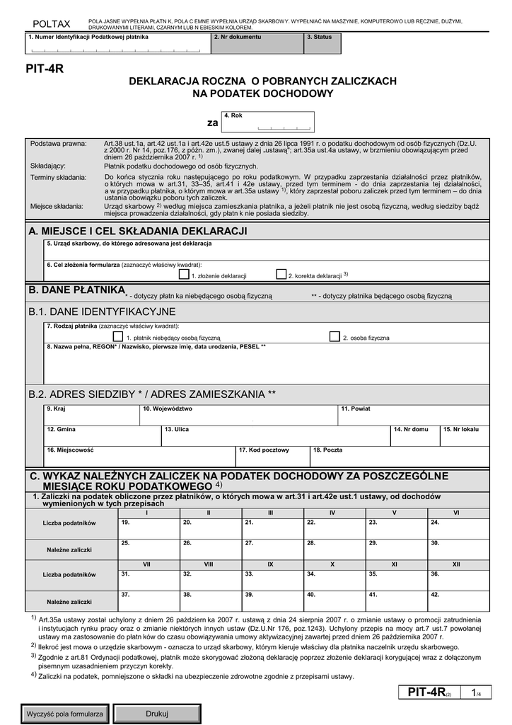 POLTAX POLA JASNE WYPEŁNIA PŁATN K, POLA C EMNE WYPEŁNIA URZĄD SKARBOWY. WYPEŁNIAĆ NA MASZYNIE, KOMPUTEROWO LUB RĘCZNIE, DUŻYMI, DRUKOWANYMI LITERAMI, CZARNYM LUB N EBIESKIM KOLOREM. 1. Numer Identyfikacji Podatkowej płatnika 2. Nr dokumentu 3. Status └────┴────┴────┴────┴────┴────┴────┴────┴────┴────┴────┴────┴────┘ PIT-4R DEKLARACJA ROCZNA O POBRANYCH ZALICZKACH NA PODATEK DOCHODOWY za Podstawa prawna: Składający: Terminy składania: Miejsce składania: 4. Rok └────┴────┴────┴────┘ Art.38 ust.1a, art.42 ust.1a i art.42e ust.5 ustawy z dnia 26 lipca 1991 r. o podatku dochodowym od osób fizycznych (Dz.U. z 2000 r. Nr 14, poz.176, z późn. zm.), zwanej dalej ”ustawą"; art.35a ust.4a ustawy, w brzmieniu obowiązującym przed dniem 26 października 2007 r. 1) Płatnik podatku dochodowego od osób fizycznych. Do końca stycznia roku następującego po roku podatkowym. W przypadku zaprzestania działalności przez płatników, o których mowa w art.31, 33–35, art.41 i 42e ustawy, przed tym terminem - do dnia zaprzestania tej działalności, a w przypadku płatnika, o którym mowa w art.35a ustawy 1), który zaprzestał poboru zaliczek przed tym terminem – do dnia ustania obowiązku poboru tych zaliczek. Urząd skarbowy 2) według miejsca zamieszkania płatnika, a jeżeli płatnik nie jest osobą fizyczną, według siedziby bądź miejsca prowadzenia działalności, gdy płatn k nie posiada siedziby. A. MIEJSCE I CEL SKŁADANIA DEKLARACJI 5. Urząd skarbowy, do którego adresowana jest deklaracja 6. Cel złożenia formularza (zaznaczyć właściwy kwadrat): q1. złożenie deklaracji q2. korekta deklaracji 3) B. DANE PŁATNIKA * - dotyczy płatn ka niebędącego osobą fizyczną ** - dotyczy płatnika będącego osobą fizyczną B.1. DANE IDENTYFIKACYJNE 7. Rodzaj płatnika (zaznaczyć właściwy kwadrat): q q 2. osoba fizyczna 1. płatnik niebędący osobą fizyczną 8. Nazwa pełna, REGON* / Nazwisko, pierwsze imię, data urodzenia, PESEL ** B.2. ADRES SIEDZIBY * / ADRES ZAMIESZKANIA ** 9. Kraj 10. Województwo 12. Gmina 11. Powiat 13. Ulica 14. Nr domu 16. Miejscowość 17. Kod pocztowy 15. Nr lokalu 18. Poczta C. WYKAZ NALEŻNYCH ZALICZEK NA PODATEK DOCHODOWY ZA POSZCZEGÓLNE MIESIĄCE ROKU PODATKOWEGO 4) 1. Zaliczki na podatek obliczone przez płatników, o których mowa w art.31 i art.42e ust.1 ustawy, od dochodów wymienionych w tych przepisach I Liczba podatników II III IV V VI 19. 20. 21. 22. 23. 24. 25. 26. 27. 28. 29. 30. Należne zaliczki VII Liczba podatników VIII IX X XI XII 31. 32. 33. 34. 35. 36. 37. 38. 39. 40. 41. 42. Należne zaliczki 1) Art.35a ustawy został uchylony z dniem 26 październ ka 2007 r. ustawą z dnia 24 sierpnia 2007 r. o zmianie ustawy o promocji zatrudnienia i instytucjach rynku pracy oraz o zmianie niektórych innych ustaw (Dz.U.Nr 176, poz.1243). Uchylony przepis na mocy art.7 ust.7 powołanej ustawy ma zastosowanie do płatn ków do czasu obowiązywania umowy aktywizacyjnej zawartej przed dniem 26 października 2007 r. 2) Ilekroć jest mowa o urzędzie skarbowym - oznacza to urząd skarbowy, którym kieruje właściwy dla płatnika naczelnik urzędu skarbowego. 3) Zgodnie z art.81 Ordynacji podatkowej, płatnik może skorygować złożoną deklarację poprzez złożenie deklaracji korygującej wraz z dołączonym pisemnym uzasadnieniem przyczyn korekty. 4) Zaliczki na podatek, pomniejszone o składki na ubezpieczenie zdrowotne zgodnie z przepisami ustawy. PIT-4R (2) Wyczyść pola formularza Drukuj 1/4 POLTAX POLA JASNE WYPEŁNIA PŁATNIK, POLA CIEMNE WYPEŁNIA URZĄD SKARBOWY. WYPEŁNIAĆ NA MASZYNIE, KOMPUTEROWO LUB RĘCZN E, DUŻYMI, DRUKOWANYMI LITERAMI, CZARNYM LUB NIEBIESK M KOLOREM. 2. Zaliczki na podatek obliczone przez płatników, o których mowa w art.33-35 ustawy, od dochodów wymienionych w tych przepisach I 43. II 44. III 45. IV 46. V 47. VI 48. Należne zaliczki VII 49. VIII 50. IX 51. X 52. XII XI 53. 54. 3. Suma należnych zaliczek za poszczególne miesiące roku podatkowego wykazanych w wierszach 1 i 2 I 55. II 56. VII Suma należnych zaliczek 61. III 57. VIII 62. IV 58. IX 63. X 64. VI V 59. 60. XII XI 65. 66. 4. Zaliczki na podatek, których pobór został ograniczony na podstawie art.32 ust.2 ustawy I 67. II 68. VII Kwoty zaliczek 73. III 69. VIII 74. IV 70. IX 75. X 76. VI V 71. 72. XII XI 77. 78. 5. Zaliczki, które przypadały do pobrania w związku z ograniczeniem poboru zaliczek w poprzednich miesiącach na podstawie art.32 ust.2 ustawy I 79. II 80. VII Kwoty zaliczek 85. III 81. VIII 86. IV 82. IX 87. X 88. VI V 83. 84. XII XI 89. 90. 6. Dodatkowo pobrany podatek wynikający z rozliczenia za rok ubiegły I 91. II 92. III 93. IV V VI X XI XII 94. Kwoty podatku VII VIII IX 7. Nadpłaty wynikające z rozliczenia za rok ubiegły oraz zwrot nadpłat w gotówce zaliczone na poczet należnej zaliczki I 95. II 96. III 97. IV 98. VI V 99. 100. Kwota nadpłaty zaliczonej oraz zwróconej w gotówce VII 101. PIT-4R (2) 2/4 Wyczyść pola formularza VIII 102. Drukuj IX 103. X 104. XII XI 105. 106. POLTAX POLA JASNE WYPEŁNIA PŁATNIK, POLA CIEMNE WYPEŁNIA URZĄD SKARBOWY. WYPEŁNIAĆ NA MASZYNIE, KOMPUTEROWO LUB RĘCZNIE, DUŻYMI, DRUKOWANYMI LITERAMI, CZARNYM LUB NIEBIESKIM KOLOREM. 8. Pobrany podatek, przekazany na PFRON oraz zakładowy fundusz rehabilitacji osób niepełnosprawnych I 107. II 108. III 109. IV 110. VI V 111. 112. Kwoty podatku VII 113. VIII 114. IX 115. X 116. XII XI 117. 118. 9. Zaliczki na podatek pobrane od świadczeń z tytułu działalności określonej w art.13 pkt 2 i 4-9 oraz art.18 ustawy 4) I 119. II 120. VII Kwoty zaliczek 125. III 121. VIII 126. IV 122. IX 127. V VI 123. X 128. 124. XII XI 129. 130. 10. Zaliczki na podatek pobrane od innych należności, w tym wynikających z umowy aktywizacyjnej 4) I 131. II 132. VII 
