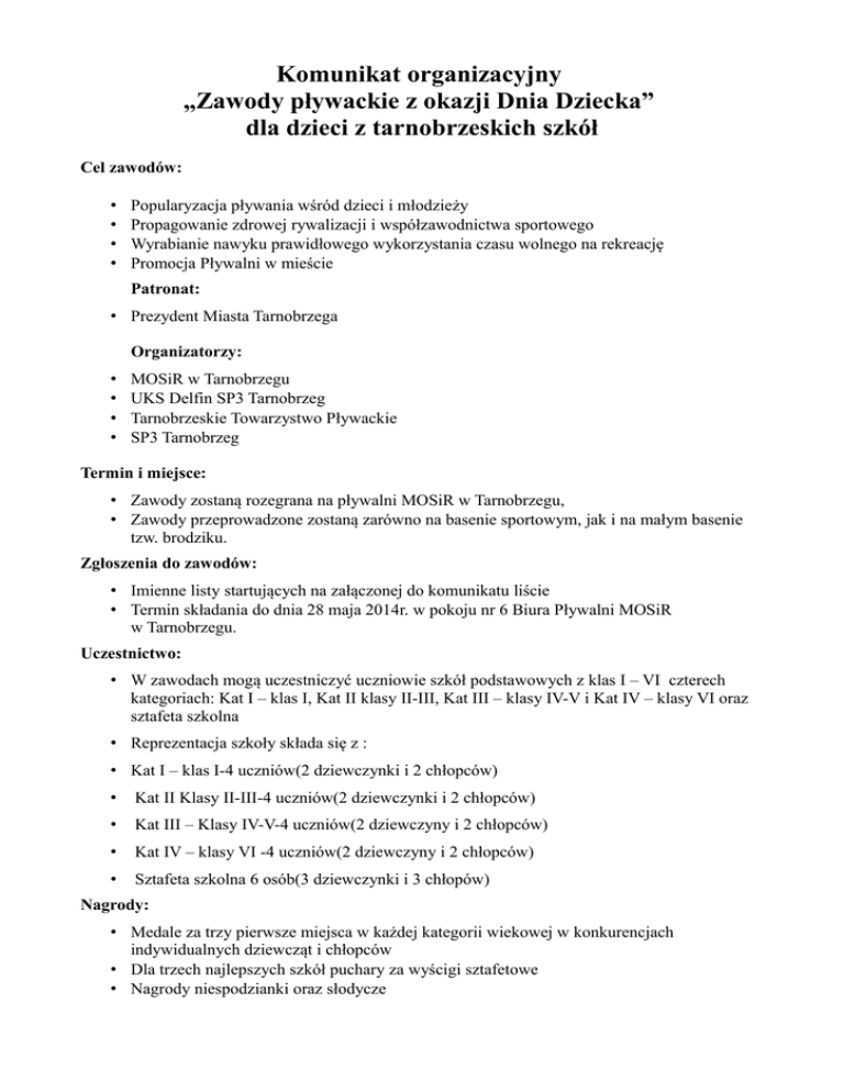 Komunikat organizacyjny „Zawody pływackie z okazji Dnia Dziecka” dla dzieci z tarnobrzeskich szkół Cel zawodów: • • • • Popularyzacja pływania wśród dzieci i młodzieży Propagowanie zdrowej rywalizacji i współzawodnictwa sportowego Wyrabianie nawyku prawidłowego wykorzystania czasu wolnego na rekreację Promocja Pływalni w mieście Patronat: • Prezydent Miasta Tarnobrzega Organizatorzy: • • • • MOSiR w Tarnobrzegu UKS Delfin SP3 Tarnobrzeg Tarnobrzeskie Towarzystwo Pływackie SP3 Tarnobrzeg Termin i miejsce: • Zawody zostaną rozegrana na pływalni MOSiR w Tarnobrzegu, • Zawody przeprowadzone zostaną zarówno na basenie sportowym, jak i na małym basenie tzw. brodziku. Zgłoszenia do zawodów: • Imienne listy startujących na załączonej do komunikatu liście • Termin składania do dnia 28 maja 2014r. w pokoju nr 6 Biura Pływalni MOSiR w Tarnobrzegu. Uczestnictwo: • W zawodach mogą uczestniczyć uczniowie szkół podstawowych z klas I – VI czterech kategoriach: Kat I – klas I, Kat II klasy II-III, Kat III – klasy IV-V i Kat IV – klasy VI oraz sztafeta szkolna • Reprezentacja szkoły składa się z : • Kat I – klas I-4 uczniów(2 dziewczynki i 2 chłopców) • Kat II Klasy II-III-4 uczniów(2 dziewczynki i 2 chłopców) • Kat III – Klasy IV-V-4 uczniów(2 dziewczyny i 2 chłopców) • Kat IV – klasy VI -4 uczniów(2 dziewczyny i 2 chłopców) • Sztafeta szkolna 6 osób(3 dziewczynki i 3 chłopów) Nagrody: • Medale za trzy pierwsze miejsca w każdej kategorii wiekowej w konkurencjach indywidualnych dziewcząt i chłopców • Dla trzech najlepszych szkół puchary za wyścigi sztafetowe • Nagrody niespodzianki oraz słodycze Zasady finansowania: • Koszty organizacyjne pokrywają organizatorzy zawodów oraz sponsorzy : OPIS KONKURENCJI SZKÓŁ PODSTAWOWYCH • Kategoria I - KLASA I - konkurencje na brodziku Przepłynięcie 2 długości „brodzika”.Pierwsza długość z deską NN (nogi) do kraula na piersiach,druga z deską NN na plecach(nogi do grzbietu). Liczy się czas wykonanego zadania oraz precyzja. Konkurencja indywidualna. • Kategoria II - KLASY II-III Zawodnicy pokonują dystans 25m samymi nogami do dowolnie wybranego stylu z przyborem(makaronem)do pływania. Liczy się czas wykonania zadania oraz precyzja. Konkurencja indywidualna. • Kategoria III - KLASY IV-V Zawodnicy pokonują dystans 50m samymi nogami do dowolnie wybranego stylu z przyborem(makaronem)do pływania. Liczy się czas wykonania zadania oraz precyzja. Konkurencja indywidualna. • Kategoria IV - KLASY VI Zawodnicy pokonują dystans 50m samymi nogami do dowolnie wybranego stylu z przyborem do pływania, pierwsze 25m z deską ,kolejne 25m z makaronem umieszczonym pod pachami. Liczy się czas wykonania zadania oraz precyzja. Konkurencja indywidualna. • SZTAFETA – zespół składa się z uczniów klas II – VI (3 dziewczynki i 3chłopców). Każdy zawodnik pokonuje dystans 25m dowolnie wybranym stylem trzymając przedmioty(pałeczka sztafetowa) po jednym w ręce i przekazanie ich kolejnemu zawodnikowi. Liczy się łączny czas wykonania zadania. Konkurencja grupowa. Postanowienia końcowe: • Zgłoszenie do zawodów jest równoznaczne z akceptacją niniejszego regulaminu. • Prawo interpretacji regulaminu przysługuje organizatorom . • Serdecznie zapraszamy do udziału w zawodach – zabawie. ORGANIZATORZY Zgłoszenie do „Zawodów pływackich z okazji Dnia Dziecka” Opiekun-.................................................................. Kategoria I – Klasy I szkół podstawowych Dziewczęta Chłopcy Zawodnicy rezerwowi: Kategoria II – Klasy II – III szkół podstawowych Dziewczęta Chłopcy Zawodnicy rezerwowi: Kategoria III – Klasy IV – V szkół podstawowych Dziewczęta Zawodnicy rezerwowi: Chłopcy Kategoria IV – Klasy VI szkół podstawowych Dziewczęta Chłopcy Zawodnicy rezerwowi: Sztafeta - szkół podstawowych Dziewczęta Chłopcy