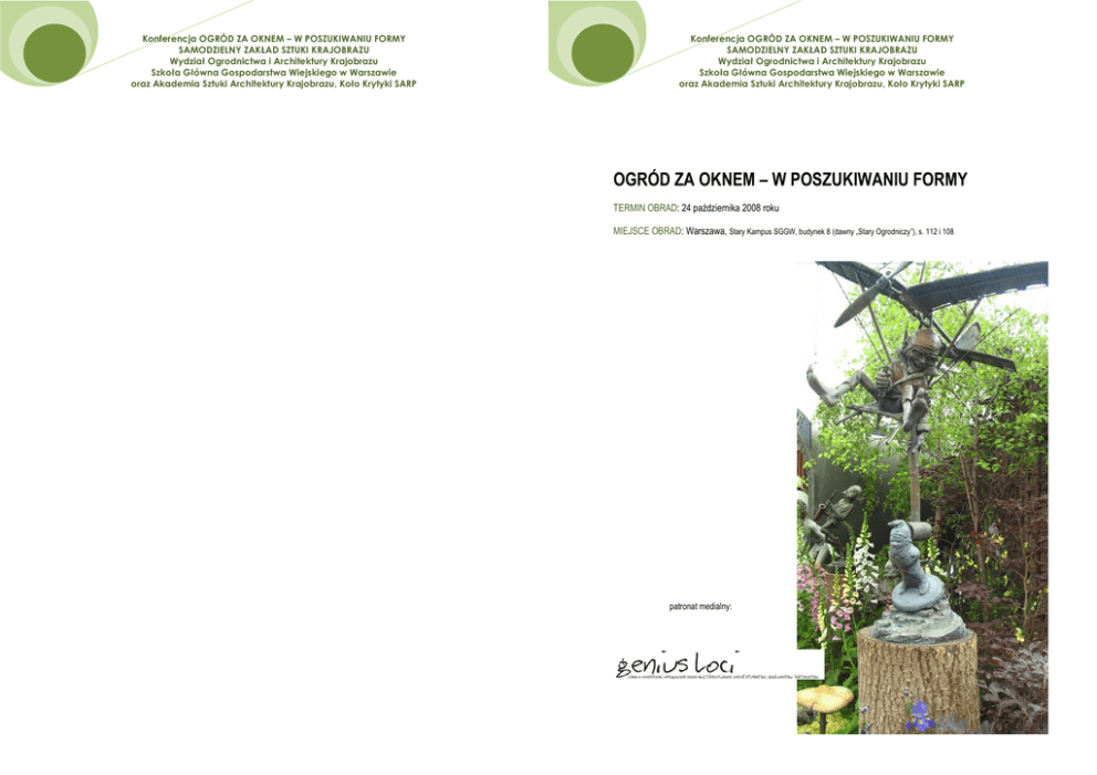 Konferencja OGRÓD ZA OKNEM – W POSZUKIWANIU FORMY SAMODZIELNY ZAKŁAD SZTUKI KRAJOBRAZU Wydział Ogrodnictwa i Architektury Krajobrazu Szkoła Główna Gospodarstwa Wiejskiego w Warszawie oraz Akademia Sztuki Architektury Krajobrazu, Koło Krytyki SARP Konferencja OGRÓD ZA OKNEM – W POSZUKIWANIU FORMY SAMODZIELNY ZAKŁAD SZTUKI KRAJOBRAZU Wydział Ogrodnictwa i Architektury Krajobrazu Szkoła Główna Gospodarstwa Wiejskiego w Warszawie oraz Akademia Sztuki Architektury Krajobrazu, Koło Krytyki SARP OGRÓD ZA OKNEM – W POSZUKIWANIU FORMY TERMIN OBRAD: 24 października 2008 roku MIEJSCE OBRAD: Warszawa, Stary Kampus SGGW, budynek 8 (dawny „Stary Ogrodniczy”), s. 112 i 108 patronat medialny: Konferencja OGRÓD ZA OKNEM – W POSZUKIWANIU FORMY SAMODZIELNY ZAKŁAD SZTUKI KRAJOBRAZU Wydział Ogrodnictwa i Architektury Krajobrazu Szkoła Główna Gospodarstwa Wiejskiego w Warszawie oraz Akademia Sztuki Architektury Krajobrazu, Koło Krytyki SARP Konferencja OGRÓD ZA OKNEM – W POSZUKIWANIU FORMY SAMODZIELNY ZAKŁAD SZTUKI KRAJOBRAZU Wydział Ogrodnictwa i Architektury Krajobrazu Szkoła Główna Gospodarstwa Wiejskiego w Warszawie oraz Akademia Sztuki Architektury Krajobrazu, Koło Krytyki SARP PROGRAM KONFERENCJI: 14:15 – 14:35 od 9:00 10:00 SESJA PLENARNA GODZINA PRELEGENT 10:05 – 10:35 Anna Mitkowska 10:40 – 11:10 Beata J. Gawryszewska TEMAT WYSTĄPIENIA Ogród przydomowy jako odzwierciedlenie tradycji miejsca (Politechnika Krakowska) (SGGW) 11:15 – 11:45 Agata Zachariasz Kształtowanie ogrodu rodzinnego jako etap w procesie zamieszkiwania miejsca. Refleksje na bazie doświadczeń Podyplomowych Studiów Projektowanie Ogrodu z Domem Rodzinnym w SGGW w Warszawie. Ogród modernistyczny – przemiany formy dyskusja 15:00 – 15:30 zakończenie panelu, przerwa obiadowa do 15:30 15:35 Wojciech Grąbczewski PANEL 2A Jerzy Wojtatowicz Lidia Ozimkowska 16:00 – 16:20 Małgorzata Pietrzak, Marek Angiel 16:25 – 16:45 Jarosław Szewczyk (WSEiZ) Projekt i realizacja ogrodu oczyma szkółkarza rozpoczęcie Paneli 1. (Politechnika Krakowska) 13:00 – 13:20 Anna RóŜańska Wpływ elementów infrastruktury oraz braku ochrony wartości przyrodniczo-kulturowych na aranŜację terenu towarzyszącego zabudowie Tradycyjny ogród wiejski w krajobrazie pogórzy karpackich Poszukiwanie swojskości (Politechnika Białostocka) PRELEGENT Katarzyna Hodor TEMAT WYSTĄPIENIA (Uniwersytet Jagielloński) PANEL 1A 12:35 – 12:55 PRELEGENT 15:35 – 15:55 (Szkółka Grąbczewscy) GODZINA rozpoczęcie Paneli 2. GODZINA zakończenie sesji plenarnej, przerwa do 12:30 12:30 Ogrody przydomowe w mieście 14:40 – 15:00 (Politechnika Krakowska) 11:50 – 12:20 Patrycja Korczak – Wodnicka („Zielony Zakątek”) rejestracja uczestników rozpoczęcie obrad 16:50 – 17:10 Beata Rothimel „Rangoli” (SGGW) TEMAT WYSTĄPIENIA Koncepcje rewaloryzacji załoŜeń rezydencjonalno – ogrodowych(na wybranych przykładach opartych na pracach dyplomowych wykonywanych w Zakładzie Sztuki Ogrodowej i Terenów Zielonych Instytutu Architektury Krajobrazu Politechniki Krakowskiej) 17:40 – 18:00 dyskusja Ogród przy dworze wiejskim w teorii projektowania XIX wieku 18:05 – 18:15 zakończenie panelu, przerwa Współczesne ogrody przy rezydencjach oraz przy obiektach uŜyteczności publicznej w miastach europejskich GODZINA 17:15 – 17:35 Katarzyna Kuzaka (Zielone Studio) Ogród przydomowy – wizja projektanta czy spełnienie marzeń inwestora? (SGGW) PANEL 2B 13:25 – 13:45 Katarzyna Płuta (Politechnika Warszawska) 15:35 – 15:55 13:50 – 14:10 Anna Jagoda (STUDIO ACER) Porządek a swoboda, czyli w poszukiwaniu formy ogrodu przydomowego." 14:15 – 14:35 Magdalena Ziółkowska Ogród naturalistyczny i inne (firma „Ogrody Magdaleny”) 14:40 – 15:00 15:00 – 15:30 16:00 – 16:20 zakończenie panelu, przerwa obiadowa do 15:30 PANEL 1B 12:35 – 12:55 Ewa Kosiacka – Beck (SGGW) 13:00 – 13:20 Anna Komorowska 13:25 – 13:45 Wojciech Januszczyk Jan Kamiński 13:50 – 14:10 Romuald K. Bochyński (Mazowieckie (Małopolski Ośrodek Kultury) (KUL) Centrum Sztuki Współczesnej Elektrownia) „Pracująca roślina” – wykorzystanie roślin w projektowaniu jednorodzinnych domów pro – ekologicznych (Alternature) 16:25 – 16:45 PRELEGENT Agnieszka Dudzińska – Jarmolińska TEMAT WYSTĄPIENIA Monika Latkowska Barwa, kształt, faktura - byliny w ogrodzie (SGGW) dyskusja GODZINA PRELEGENT TEMAT WYSTĄPIENIA Jak uładzić przestrzeń zgodnie z gustem. Elementy kompozycji ogrodu przydomowego ich porządkowanie, róŜnicowanie, przestrzenne i strukturalne organizowanie się Jadalny plac zabaw i ogród, którego dzieci naprawdę chcą. Chelsea Flower Show dla dzieci Relacja architekt krajobrazu - inwestor jako proces podnoszenia standardów pracy oraz zmian świadomości społecznej Ogród w muzeum, sztuka w ogrodzie 16:50 – 17:10 17:15 – 17:30 Wojciech Podstolski (PAN) Współczesne trendy w stosowaniu odmian roślin ozdobnych w ogrodach Wojciech Puchalski Zuzanna Podgórska Ogród przydomowy w dobie zmian klimatycznych Irlandzkie ogrody (KUL) 17:30 – 18:00 18:00 – 18:15 dyskusja zakończenie panelu, przerwa 18:15 – 19:00 dyskusja podsumowująca zakończenie konferencji