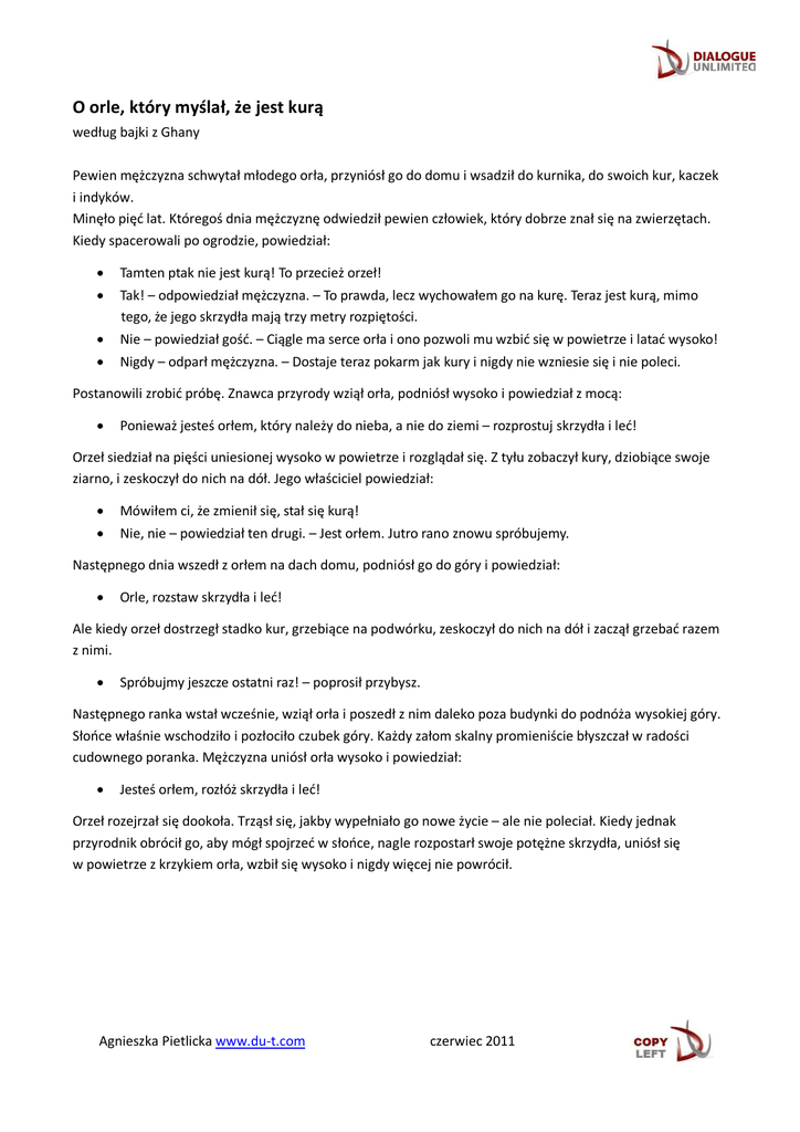 O orle, który myślał, że jest kurą według bajki z Ghany Pewien mężczyzna schwytał młodego orła, przyniósł go do domu i wsadził do kurnika, do swoich kur, kaczek i indyków. Minęło pięć lat. Któregoś dnia mężczyznę odwiedził pewien człowiek, który dobrze znał się na zwierzętach. Kiedy spacerowali po ogrodzie, powiedział: Tamten ptak nie jest kurą! To przecież orzeł! Tak! – odpowiedział mężczyzna. – To prawda, lecz wychowałem go na kurę. Teraz jest kurą, mimo tego, że jego skrzydła mają trzy metry rozpiętości. Nie – powiedział gość. – Ciągle ma serce orła i ono pozwoli mu wzbić się w powietrze i latać wysoko! Nigdy – odparł mężczyzna. – Dostaje teraz pokarm jak kury i nigdy nie wzniesie się i nie poleci. Postanowili zrobić próbę. Znawca przyrody wziął orła, podniósł wysoko i powiedział z mocą: Ponieważ jesteś orłem, który należy do nieba, a nie do ziemi – rozprostuj skrzydła i leć! Orzeł siedział na pięści uniesionej wysoko w powietrze i rozglądał się. Z tyłu zobaczył kury, dziobiące swoje ziarno, i zeskoczył do nich na dół. Jego właściciel powiedział: Mówiłem ci, że zmienił się, stał się kurą! Nie, nie – powiedział ten drugi. – Jest orłem. Jutro rano znowu spróbujemy. Następnego dnia wszedł z orłem na dach domu, podniósł go do góry i powiedział: Orle, rozstaw skrzydła i leć! Ale kiedy orzeł dostrzegł stadko kur, grzebiące na podwórku, zeskoczył do nich na dół i zaczął grzebać razem z nimi. Spróbujmy jeszcze ostatni raz! – poprosił przybysz. Następnego ranka wstał wcześnie, wziął orła i poszedł z nim daleko poza budynki do podnóża wysokiej góry. Słońce właśnie wschodziło i pozłociło czubek góry. Każdy załom skalny promieniście błyszczał w radości cudownego poranka. Mężczyzna uniósł orła wysoko i powiedział: Jesteś orłem, rozłóż skrzydła i leć! Orzeł rozejrzał się dookoła. Trząsł się, jakby wypełniało go nowe życie – ale nie poleciał. Kiedy jednak przyrodnik obrócił go, aby mógł spojrzeć w słońce, nagle rozpostarł swoje potężne skrzydła, uniósł się w powietrze z krzykiem orła, wzbił się wysoko i nigdy więcej nie powrócił. Agnieszka Pietlicka www.du-t.com czerwiec 2011