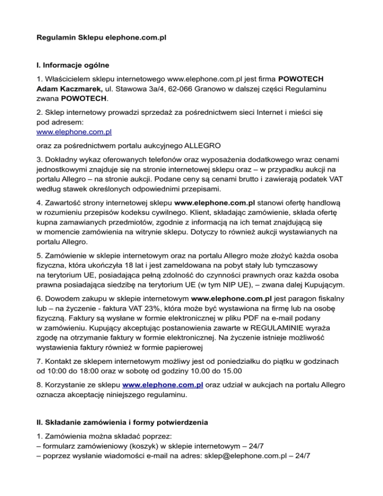 Regulamin Sklepu elephone.com.pl I. Informacje ogólne 1. Właścicielem sklepu internetowego www.elephone.com.pl jest firma POWOTECH Adam Kaczmarek, ul. Stawowa 3a/4, 62-066 Granowo w dalszej części Regulaminu zwana POWOTECH. 2. Sklep internetowy prowadzi sprzedaż za pośrednictwem sieci Internet i mieści się pod adresem: www.elephone.com.pl oraz za pośrednictwem portalu aukcyjnego ALLEGRO 3. Dokładny wykaz oferowanych telefonów oraz wyposażenia dodatkowego wraz cenami jednostkowymi znajduje się na stronie internetowej sklepu oraz – w przypadku aukcji na portalu Allegro – na stronie aukcji. Podane ceny są cenami brutto i zawierają podatek VAT według stawek określonych odpowiednimi przepisami. 4. Zawartość strony internetowej sklepu www.elephone.com.pl stanowi ofertę handlową w rozumieniu przepisów kodeksu cywilnego. Klient, składając zamówienie, składa ofertę kupna zamawianych przedmiotów, zgodnie z informacją na ich temat znajdującą się w momencie zamówienia na witrynie sklepu. Dotyczy to również aukcji wystawianych na portalu Allegro. 5. Zamówienie w sklepie internetowym oraz na portalu Allegro może złożyć każda osoba fizyczna, która ukończyła 18 lat i jest zameldowana na pobyt stały lub tymczasowy na terytorium UE, posiadająca pełną zdolność do czynności prawnych oraz każda osoba prawna posiadająca siedzibę na terytorium UE (w tym NIP UE), – zwana dalej Kupującym. 6. Dowodem zakupu w sklepie internetowym www.elephone.com.pl jest paragon fiskalny lub – na życzenie - faktura VAT 23%, która może być wystawiona na firmę lub na osobę fizyczną. Faktury są wysłane w formie elektronicznej w pliku PDF na e-mail podany w zamówieniu. Kupujący akceptując postanowienia zawarte w REGULAMINIE wyraża zgodę na otrzymanie faktury w formie elektronicznej. Na życzenie istnieje możliwość wystawienia faktury również w formie papierowej 7. Kontakt ze sklepem internetowym możliwy jest od poniedziałku do piątku w godzinach od 10:00 do 18:00 oraz w sobotę od godziny 10.00 do 15.00 8. Korzystanie ze sklepu www.elephone.com.pl oraz udział w aukcjach na portalu Allegro oznacza akceptację niniejszego regulaminu. II. Składanie zamówienia i formy potwierdzenia 1. Zamówienia można składać poprzez: – formularz zamówieniowy (koszyk) w sklepie internetowym – 24/7 – poprzez wysłanie wiadomości e-mail na adres: [email protected] – 24/7 – telefonicznie – dzwoniąc pod numer 784 811 013 (od poniedziałku do piątku w godzinach od 10.00 do 18.00 oraz w sobotę od godziny 10.00 do 15.00) 2. Kupujący musi posiadać aktywne konto e-mail oraz telefon umożliwiający potwierdzenie zamówienia. 3. Po złożeniu zamówienia przez klienta otrzyma on potwierdzenie przyjęcia zamówienia przez sklep ELEPHONE.COM.PL 4. Z chwilą otrzymania maila potwierdzającego przez firmę POWOTECH przyjęcia zamówienia do realizacji umowę sprzedaży towaru pomiędzy Kupującym a sklepem internetowym ELEPHONE.COM.PL uznaje się za zawartą 5. Jeśli potwierdzenie zamówienia okaże się niemożliwe z powodu błędnego numeru telefonu i nieprawidłowego adresu e-mail - zamówienie zostanie anulowane po upływie 3 dni od daty zakupu. 6. W przypadku zaistnienia sytuacji uniemożliwiającej realizację złożonego zamówienia firma POWOTECH zastrzega sobie prawo do zawieszenia jego realizacji. Kupujący zostanie o takiej sytuacji niezwłocznie poinformowany przed przyjęciem zamówienia do realizacji. 7. W przypadku pozycji, których termin dostawy określono jako „Do ustalenia” - firma POWOTECH zastrzega sobie prawo do indywidualnego ustalenia terminu dostawy z Klientem, ewentualnie ustalenia możliwej zmiany lub anulowania zamówienia. 8. Zastrzegamy sobie prawo do zmiany cen. Jeśli cena ulegnie zmianie po złożeniu zamówienia, a przed jego przyjęciem do realizacji, firma POWOTECH zobowiązuje się niezwłocznego poinformowania Klienta o takiej sytuacji. W przypadku braku akceptacji nowej ceny zamówienie zostanie anulowane. 9. Walutą obowiązującą w sklepie www.elephone.com.pl jest Złoty Polski (PLN). Ceny zawierają podatek VAT (cena brutto). 10. Na życzenie firma POWOTECH wystawia faktury VAT. O chęci otrzymania Faktury VAT należy poinformować sprzedającego w momencie składaniu zamówienia i podać odpowiednie dane do wystawienia Faktury VAT. Klient wyraża zgodę na otrzymanie faktury drogą elektroniczną w formacie pliku PDF na adres e-mail, który został podany w zamówieniu. Na życzenie faktura może zostać wysłana w formie papierowej wraz z zamówionym towarem. IV. Wysyłka i płatności 1. Dokładamy wszelkich starań, aby termin wysyłki był jak najkrótszy. Najczęściej wynosi on od 1 do 2 dni roboczych od daty potwierdzenia zamówienia. W przypadku dłuższego czasu dostawy Klient zostanie poinformowany przez firmę POWOTECH o tym fakcie oraz o przewidywanym terminie dostawy. 2. W przypadku wyboru przez Kupującego przedpłaty przelewem jako formy płatności, zamówienie zostanie zrealizowane po otrzymaniu przelewu na konto firmy POWOTECH. 3. Akceptujemy następujące formy płatności: – pobranie: płatność przy odbiorze zamówionego produktu kurierowi – przedpłata – przelew na konto bankowe: zapłata przelewem na konto firmy POWOTECH na podstawie wysłanej Klientowi wiadomości e-mail z danymi do wpłaty (na życzenie – faktura pro-forma) – płatności PayU: szybkie przelewy międzybankowe (Allegro) - płatności transferuj.pl – szybkie przelewy międzybankowe (www.elephone.com.pl) – płatność kartami kredytowymi za pośrednictwem serwisu PayU (Allegro) – gotówka: płatność gotówką przy odbiorze osobistym w siedzibie firmy POWOTECH – raty w PayU (Allegro) Dane do wykonania przelewu bankowego w PLN: nr konta: 46 1440 1387 0000 0000 1168 0542 Bank PKO BP POWOTECH Adam Kaczmarek ul. Stawowa 3a/4 62-066 Granowo 4. Dostawy realizowane są za pośrednictwem firmy kurierskiej lub Po