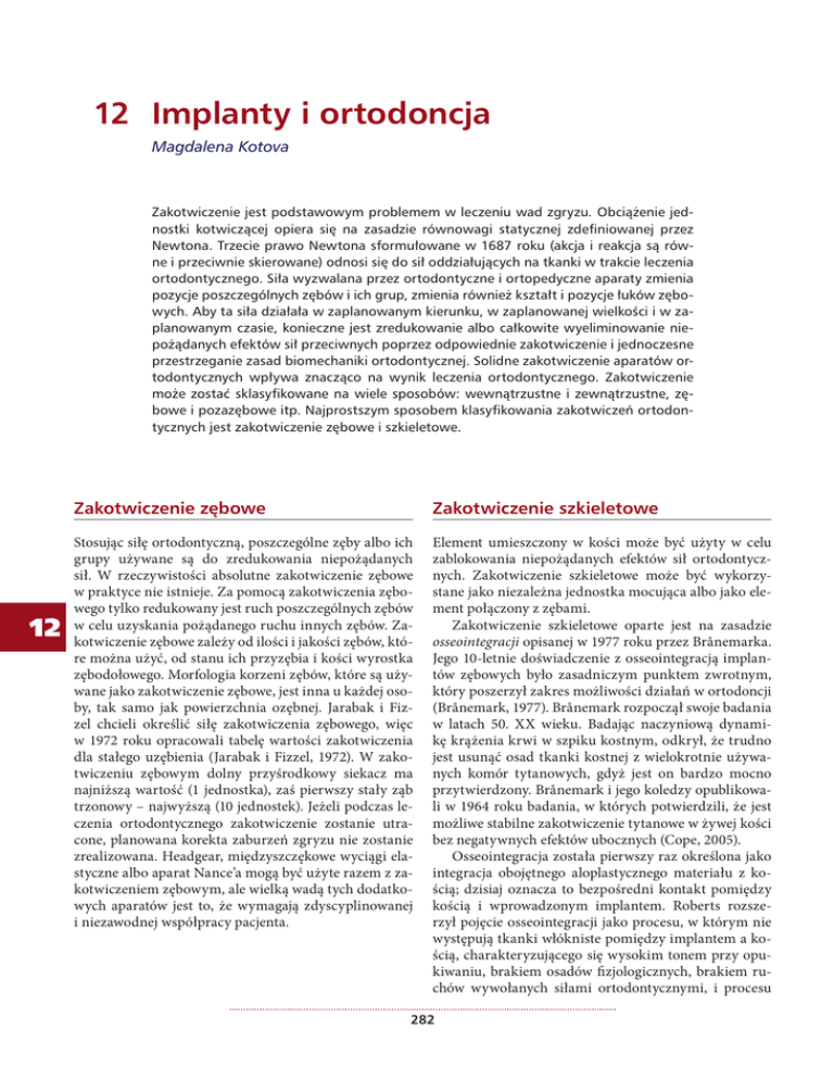 12 Implanty i ortodoncja Magdalena Kotova Zakotwiczenie jest podstawowym problemem w leczeniu wad zgryzu. Obciążenie jednostki kotwiczącej opiera się na zasadzie równowagi statycznej zdefiniowanej przez Newtona. Trzecie prawo Newtona sformułowane w 1687 roku (akcja i reakcja są równe i przeciwnie skierowane) odnosi się do sił oddziałujących na tkanki w trakcie leczenia ortodontycznego. Siła wyzwalana przez ortodontyczne i ortopedyczne aparaty zmienia pozycje poszczególnych zębów i ich grup, zmienia również kształt i pozycje łuków zębowych. Aby ta siła działała w zaplanowanym kierunku, w zaplanowanej wielkości i w zaplanowanym czasie, konieczne jest zredukowanie albo całkowite wyeliminowanie niepożądanych efektów sił przeciwnych poprzez odpowiednie zakotwiczenie i jednoczesne przestrzeganie zasad biomechaniki ortodontycznej. Solidne zakotwiczenie aparatów ortodontycznych wpływa znacząco na wynik leczenia ortodontycznego. Zakotwiczenie może zostać sklasyfikowane na wiele sposobów: wewnątrzustne i zewnątrzustne, zębowe i pozazębowe itp. Najprostszym sposobem klasyfikowania zakotwiczeń ortodontycznych jest zakotwiczenie zębowe i szkieletowe. 12 Zakotwiczenie zębowe Zakotwiczenie szkieletowe Stosując siłę ortodontyczną, poszczególne zęby albo ich grupy używane są do zredukowania niepożądanych sił. W rzeczywistości absolutne zakotwiczenie zębowe w praktyce nie istnieje. Za pomocą zakotwiczenia zębowego tylko redukowany jest ruch poszczególnych zębów w celu uzyskania pożądanego ruchu innych zębów. Zakotwiczenie zębowe zależy od ilości i jakości zębów, które można użyć, od stanu ich przyzębia i kości wyrostka zębodołowego. Morfologia korzeni zębów, które są używane jako zakotwiczenie zębowe, jest inna u każdej osoby, tak samo jak powierzchnia ozębnej. Jarabak i Fizzel chcieli określić siłę zakotwiczenia zębowego, więc w 1972 roku opracowali tabelę wartości zakotwiczenia dla stałego uzębienia (Jarabak i Fizzel, 1972). W zakotwiczeniu zębowym dolny przyśrodkowy siekacz ma najniższą wartość (1 jednostka), zaś pierwszy stały ząb trzonowy – najwyższą (10 jednostek). Jeżeli podczas leczenia ortodontycznego zakotwiczenie zostanie utracone, planowana korekta zaburzeń zgryzu nie zostanie zrealizowana. Headgear, międzyszczękowe wyciągi elastyczne albo aparat Nance’a mogą być użyte razem z zakotwiczeniem zębowym, ale wielką wadą tych dodatkowych aparatów jest to, że wymagają zdyscyplinowanej i niezawodnej współpracy pacjenta. Element umieszczony w kości może być użyty w celu zablokowania niepożądanych efektów sił ortodontycznych. Zakotwiczenie szkieletowe może być wykorzystane jako niezależna jednostka mocująca albo jako element połączony z zębami. Zakotwiczenie szkieletowe oparte jest na zasadzie osseointegracji opisanej w 1977 roku przez Brånemarka. Jego 10-letnie doświadczenie z osseointegracją implantów zębowych było zasadniczym punktem zwrotnym, który poszerzył zakres możliwości działań w ortodoncji (Brånemark, 1977). Brånemark rozpoczął swoje badania w latach 50. XX wieku. Badając naczyniową dynamikę krążenia krwi w szpiku kostnym, odkrył, że trudno jest usunąć osad tkanki kostnej z wielokrotnie używanych komór tytanowych, gdyż jest on bardzo mocno przytwierdzony. Brånemark i jego koledzy opublikowali w 1964 roku badania, w których potwierdzili, że jest możliwe stabilne zakotwiczenie tytanowe w żywej kości bez negatywnych efektów ubocznych (Cope, 2005). Osseointegracja została pierwszy raz określona jako integracja obojętnego aloplastycznego materiału z kością; dzisiaj oznacza to bezpośredni kontakt pomiędzy kością i wprowadzonym implantem. Roberts rozszerzył pojęcie osseointegracji jako procesu, w którym nie występują tkanki włókniste pomiędzy implantem a kością, charakteryzującego się wysokim tonem przy opukiwaniu, brakiem osadów fizjologicznych, brakiem ruchów wywołanych siłami ortodontycznymi, i procesu 282 Z AKOTWICZENIE SZKIELETOWE będącego czynnościowym odpowiednikiem ankylozy zębów. Implant spełniający te kryteria jest ideałem absolutnego zakotwiczenia, które przeciwstawia się siłom zarówno ortodontycznym, jak i ortopedycznym, utrzymuje się nieruchomo i nie wywiera wpływu na zęby. Pierwsza próba zastosowania w ortodoncji zakotwiczenia szkieletowego sięga 1945 roku. Gainsforth i Highley (1945) badali sześć psów. Umocowali śruby zrobione z Vitallium w otworze zlokalizowanym w gałęzi żuchwy i dystalnie przesunęli kieł w szczęce. Jednak wszystkie śruby zostały utracone w ciągu 16-31 dni. Ten eksperyment nie udał się, ale badania kontynuowano. W 1969 roku Linkow poradził użyć płytki kostnej jako implantu umieszczonego w okolicy pierwszego stałego zęba trzonowego, który mógłby być używany zarówno do rehabilitacji protetycznej, jak i tymczasowych zakotwiczeń ortodontycznych (Linkow, 1970). W 1980 roku Creekmore i Eklund byli prawdopodobnie pierwszymi, którzy zastosowali tymczasowo umieszczoną chirurgiczną śrubę kostną zrobioną z Vitallium u pacjenta wyłącznie dla zakotwiczenia ortodontycznego. Śrubę umieścili poniżej przedniego kolca nosowego w celu intruzji górnych zębów siecznych. Efektem była ich 6 mm intruzja (Creekmore i Eklund, 1983). Block i Hoffman użyli onplantu jako zakotwiczenia ortodontycznego w 1989 roku, a Wehrbein i Merz wprowadzili w 1996 roku implanty podniebienne, które użyte były do retrakcji przedniego segmentu szczęki (Wehrbein, Merz i wsp., 1996). Obecnie oprócz implantów, które mogą być użyte jako zakotwiczenie ortodontyczne oparte na osseointegracji, można korzystać z wielu tymczasowych urządzeń zakotwiczających, które powstały jako bezpośrednia modyfikacja ortopedycznych metod zespoleń kostnych. Obejmują one zakotwiczenia w formie drucianych ligatur i system umocowań szkieletowych z płytkam