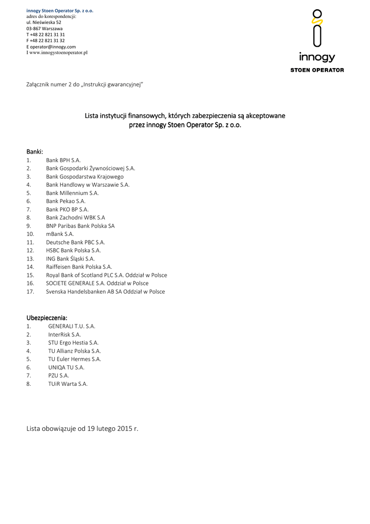 innogy Stoen Operator Sp. z o.o. adres do korespondencji: ul. Nieświeska 52 03-867 Warszawa T +48 22 821 31 31 F +48 22 821 31 32 E [email protected] I www.innogystoenoperator.pl Załącznik numer 2 do „Instrukcji gwarancyjnej” Lista instytucji finansowych, których zabezpieczenia są akceptowane przez innogy Stoen Operator Sp. z o.o. Banki: 1. 2. 3. 4. 5. 6. 7. 8. 9. 10. 11. 12. 13. 14. 15. 16. 17. Bank BPH S.A. Bank Gospodarki Żywnościowej S.A. Bank Gospodarstwa Krajowego Bank Handlowy w Warszawie S.A. Bank Millennium S.A. Bank Pekao S.A. Bank PKO BP S.A. Bank Zachodni WBK S.A BNP Paribas Bank Polska SA mBank S.A. Deutsche Bank PBC S.A. HSBC Bank Polska S.A. ING Bank Śląski S.A. Raiffeisen Bank Polska S.A. Royal Bank of Scotland PLC S.A. Oddział w Polsce SOCIETE GENERALE S.A. Oddział w Polsce Svenska Handelsbanken AB SA Oddział w Polsce Ubezpieczenia: 1. 2. 3. 4. 5. 6. 7. 8. GENERALI T.U. S.A. InterRisk S.A. STU Ergo Hestia S.A. TU Allianz Polska S.A. TU Euler Hermes S.A. UNIQA TU S.A. PZU S.A. TUiR Warta S.A. Lista obowiązuje od 19 lutego 2015 r.
