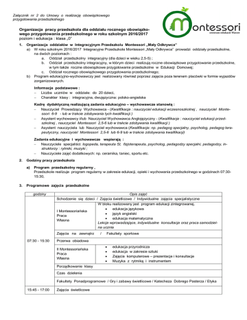 Załącznik nr 2 do Umowy o realizację obowiązkowego przygotowania przedszkolnego Organizacja pracy przedszkola dla oddziału rocznego obowiązkowego przygotowania przedszkolnego w roku szkolnym 2016/2017 poziom i edukacja : klasa „0” 1. Organizacja oddziałów w Integracyjnym Przedszkolu Montessori „Mały Odkrywca” a) W roku szkolnym 2016/2017 Integracyjne Przedszkole Montessori „Mały Odkrywca” prowadzi oddziały przedszkolne, na dwóch poziomach : a. Oddział przedszkolny integracyjny (dla dzieci w wieku 2,5-5) ; b. Oddział przedszkolny integracyjny, w którym dzieci realizują roczne obowiązkowe przygotowanie przedszkolne, w tym także roczne obowiązkowe przygotowanie przedszkolne w Edukacji Domowej; c. Oddział rocznego obowiązkowego przygotowania przedszkolnego; b) Program edukacyjno-wychowawczy jest realizowany również poprzez zajęcia poza terenem placówki w formie wyjazdów zorganizowanych. Informacje podstawowe : Liczba uczniów w oddziale: do 20 dzieci, Charakter klasy : integracyjna, dwujęzyczna: polsko-angielska Kadrę dydaktyczną realizującą zadania edukacyjno – wychowawcze stanowią : Nauczyciel Prowadzący Wychowawca - (Kwalifikacje : nauczyciel edukacji wczesnoszkolnej , nauczyciel Montessori 6-9 - lub w trakcie zdobywania tych kwalifikacji ) Asystent wychowawcy i/lub Nauczyciel Wychowawca Anglojęzyczny - (Kwalifikacje : nauczyciel edukacji przedszkolnej , nauczyciel Montessori 2,5-6 lub w trakcie zdobywania kwalifikacji ) Asystent nauczyciela lub Nauczyciel wychowawca (Kwalifikacje: np. pedagog specjalny, psycholog, pedagog terapeutyczny, nauczyciel Montessori 2,5-6 lub 6-9 lub w trakcie zdobywania kwalifikacji) Zadania edukacyjne i wychowawcze wspierają : Nauczyciele specjaliści: logopeda, terapeuta SI, fizjoterapeuta, psycholog, pedagodzy specjalni, pedagodzy, instruktorzy : rytmiki, muzyki ; Nauczyciele zajęć dodatkowych: np. ceramika, taniec, sportu etc. 2. Godziny pracy przedszkola a) 3. Program przedszkolny regularny , Przedszkole realizuje program regularny w zakresie edukacji, opieki i wychowania przedszkolnego w godzinach 07:3015:30, Programowe zajęcia przedszkolne godziny Opis zajęć Schodzenie się dzieci / Zajęcia świetlicowe / Indywidualne zajęcia specjalistyczne I Montessoriańska Praca Własna Zajęcia na zewnątrz 07:30 - 15:30 W bloku realizowany jest program edukacji zintegrowanej, edukacja językowa język angielski edukacja matematyczna Lekcje wprowadzające, indywidualne konsultacje oraz praca samodzielna ucznia / Fakultety sportowe Przerwa obiadowa II Montessoriańska Praca Własna edukacja przyrodnicza edukacja w zakresie sztuki Zajęcia komputerowe – prezentacje i konsultacje Muzyka z rytmiką i instrumentem Porządkowanie klasy Czas dzielenia Fakultety Ponadprogramowe / Gry i zabawy świetlicowe / Katecheza Dobrego Pasterza / Etyka 15:45 - 17:00 Zajęcia świetlicowe 4. Edukacyjny program przedszkola obejmuje: a) Podstawowe ścieżki edukacyjne Przedmiot Praktyczne życie dnia codziennego, czyli zajęcia i ćwiczenia w zakresie samoobsługi , Kształcenie zmysłów Edukacja matematyczna , Edukacja językowa , Edukacja przyrodnicza , Język angielski , Edukacja muzyczna , wraz z ćwiczeniem słuchu i nauką nut , ćwiczenia rytmiczno-muzyczne na linii, Edukacja artystyczna , w tym poznawanie różnych narzędzi malarskich, technik plastycznych, projekty techniczno-plastyczne. Edukacja prozdrowotna i ruchowa , Katecheza Dobrego Pasterza wg. wyboru rodziców b) Programowe zajęcia przedszkolne Opis zajęć Montessoriańska Praca Własna ; Codzienne Lekcje ciszy, codzienne Ćwiczenia rytmiczno-muzyczne na linii , Codzienne czytanie książek; Cotygodniowa wizyta w bibliotece szkolnej wraz z wypożyczaniem książek ; Muzyka z rytmiką , Nauka gra na dzwonkach chromatycznych, flażolecie lub bębnach oraz nauka nut , Zajęcia ruchowo-sportowe, w tym gry i zabawy zespołowe oraz fakultety sportowe do wyboru , Codzienne zajęcia na zewnątrz, bez względu na pogodę - spacery, zabawy na łące i w ogrodzie; Wizyty gości, koncerty muzyczne , Edukacyjne wycieczki tematyczne; Wycieczki tematyczne z nocowaniem; Imprezy i wydarzenia wynikające z Rocznego Kalendarza Przedszkola; c) Programowe zajęcia przedszkolne dla dzieci z orzeczeniem o specjalnych potrzebach edukacyjnych Opis zajęć Edukacyjne zajęcia - Montessoriańska Praca Własna wg. potrzeb i możliwości dziecka, Lekcje ciszy, Czytanie i cotygodniowa wizyta w bibliotece szkolnej wraz z wypożyczaniem książek; Rytmika z orkiestrą – dzieci 2,5-4 letnie , Rytmika – dzieci 5 – 6 letnie , Nauka gra na dzwonkach montessoriańskich i chromatycznych i nauka nut – dzieci 5 – 6 letnie ; Zajęcia korekcyjno-kompensacyjne i socjoterapeutyczne, dla dzieci w normie intelektualnej ; Terapia logopedyczna wg. zaleceń zawartych w orzeczeniu , Terapia Integracji Sensorycznej wg. zaleceń zawartych w orzeczeniu , Fizjoterapia wg. zaleceń zawartych w orzeczeniu , Zajęcia kompensacyjno-korekcyjne , w tym: Zajęcia terapeutyczne typu : Trening ręki , Zajęcia socjoterapeutyczne, dla dzieci w normie intelektualnej oraz z upośledzenie w stopniu lekkim i umiarkowanym Trening umiejętności społecznych , Trening komunikacji oraz komunikacji wspomagającym , Zajęcia rewalidacyjne dla dzieci z upośledzenie w stopniu lekkim i/lub umiarkowanym ; Terapia logopedyczna wg. zaleceń zawartych w orzeczeniu , Terapia Integracji Sensorycznej wg. zaleceń zawartych w orzeczeniu , Fizjoterapia wg. zaleceń zawartych w orzeczeniu , Zajęcia rewalidacyjne , w tym: Zajęcia terapeutyczne typu : Trening ręki , Komunikacja zastępcza , Zajęcia specjalistyczne Muzykoterapia Artteterapia Dogoterapia* Hipoterapia* * zajęcia dodatkowo płatne _________________________________________________________________________________________________ Integracyjne Przedszkole Montessori – Organizacja oddziału rocznego obowiązkowego przygotowania przedszkolnego Strona 2 z 5 (v16.0.0) 5. Pr