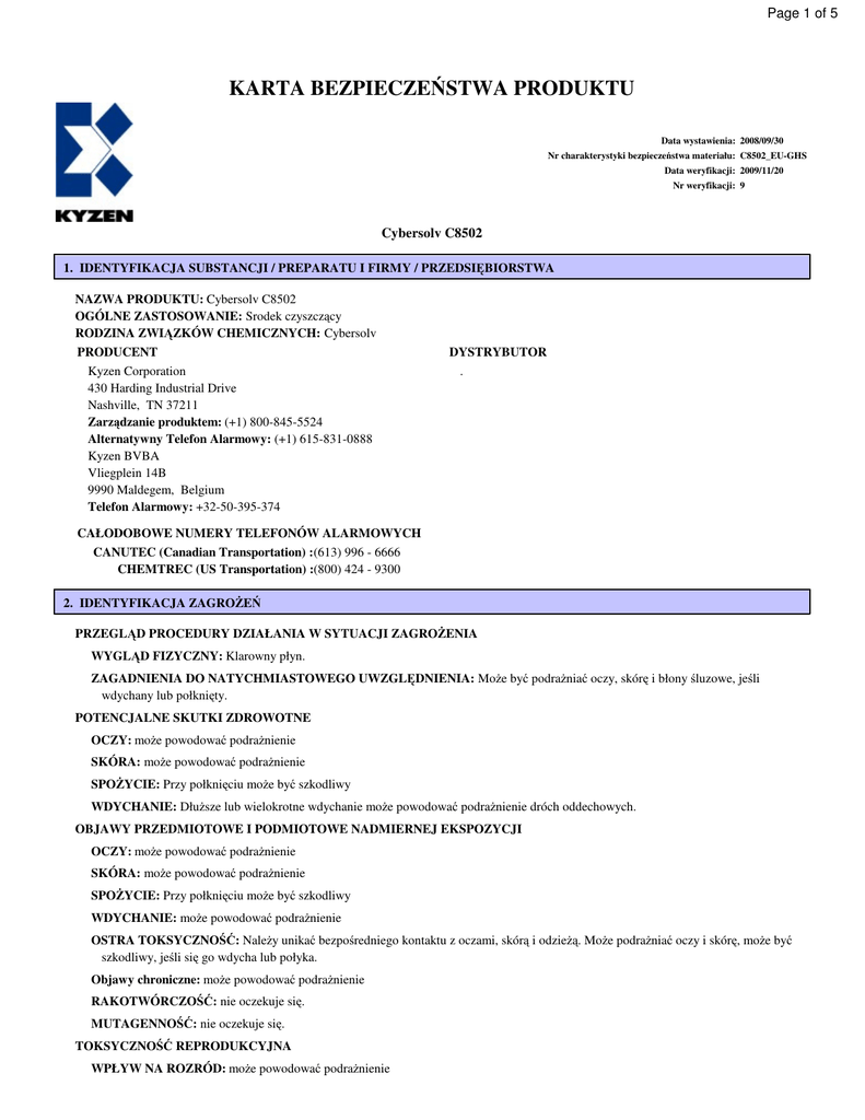 Page 1 of 5 KARTA BEZPIECZEŃSTWA PRODUKTU Data wystawienia: 2008/09/30 Nr charakterystyki bezpieczeństwa materiału: C8502_EU-GHS Data weryfikacji: 2009/11/20 Nr weryfikacji: 9 Cybersolv C8502 1. IDENTYFIKACJA SUBSTANCJI / PREPARATU I FIRMY / PRZEDSIĘBIORSTWA NAZWA PRODUKTU: Cybersolv C8502 OGÓLNE ZASTOSOWANIE: Srodek czyszczący RODZINA ZWIĄZKÓW CHEMICZNYCH: Cybersolv PRODUCENT Kyzen Corporation 430 Harding Industrial Drive Nashville, TN 37211 Zarządzanie produktem: (+1) 800-845-5524 Alternatywny Telefon Alarmowy: (+1) 615-831-0888 Kyzen BVBA Vliegplein 14B 9990 Maldegem, Belgium Telefon Alarmowy: +32-50-395-374 DYSTRYBUTOR . CAŁODOBOWE NUMERY TELEFONÓW ALARMOWYCH CANUTEC (Canadian Transportation) :(613) 996 - 6666 CHEMTREC (US Transportation) :(800) 424 - 9300 2. IDENTYFIKACJA ZAGROŻEŃ PRZEGLĄD PROCEDURY DZIAŁANIA W SYTUACJI ZAGROŻENIA WYGLĄD FIZYCZNY: Klarowny płyn. ZAGADNIENIA DO NATYCHMIASTOWEGO UWZGLĘDNIENIA: Może być podrażniać oczy, skórę i błony śluzowe, jeśli wdychany lub połknięty. POTENCJALNE SKUTKI ZDROWOTNE OCZY: może powodować podrażnienie SKÓRA: może powodować podrażnienie SPOŻYCIE: Przy połknięciu może być szkodliwy WDYCHANIE: Dłuższe lub wielokrotne wdychanie może powodować podrażnienie dróch oddechowych. OBJAWY PRZEDMIOTOWE I PODMIOTOWE NADMIERNEJ EKSPOZYCJI OCZY: może powodować podrażnienie SKÓRA: może powodować podrażnienie SPOŻYCIE: Przy połknięciu może być szkodliwy WDYCHANIE: może powodować podrażnienie OSTRA TOKSYCZNOŚĆ: Należy unikać bezpośredniego kontaktu z oczami, skórą i odzieżą. Może podrażniać oczy i skórę, może być szkodliwy, jeśli się go wdycha lub połyka. Objawy chroniczne: może powodować podrażnienie RAKOTWÓRCZOŚĆ: nie oczekuje się. MUTAGENNOŚĆ: nie oczekuje się. TOKSYCZNOŚĆ REPRODUKCYJNA WPŁYW NA ROZRÓD: może powodować podrażnienie Cybersolv C8502 Page 2 of 5 STANY CHOROBOWE ULEGAJĄCE ZAOSTRZENIU: Może przyczynić się do podrażnienia skóry, dróg oddechowych lub układu nerwowego. DROGI PRZENIKANIA: Oczy, skóra, drogi oddechowe i połykanie DEKLARACJA O RAKOTWÓRCZOŚCI: nie oczekuje się. WŁAŚCIWOŚCI DRAŻNIĄCE: może powodować podrażnienie ETYKIETY OSTRZEGAWCZE: Unikaj kontaktu ze skórą, oczami i odzieżą. Nie wdychać uparów. Unikać długotrwałej lub częstej ekspozycji w otoczeniu produktu. Użyj odpowiedniego sprzętu ochronnego, nie jedz, nie pij, nie pal podczas kontaktu z substancją UWAGI DOTYCZĄCE SKUTKÓW ZDROWOTNYCH: Może być podrażniać oczy, skórę i błony śluzowe, jeśli wdychany lub połknięty. ZAGROŻENIA DLA ZDROWIA: może powodować podrażnienie 3. SKŁAD / INFORMACJE O SKŁADNIKACH Nazwa chemiczna See comments CAS 00-00-0 UWAGI: Preparat nie zawiera składników określonych jako niebezpieczne przez OSHA (29CFR1910.1200) lub zaklasyfikowanych jako niebezpieczne przez ESIS zgodnie z dyrektywą 1999/45/WE i jej zmianami oraz w załączniku 1 dyrektywy 67/548/EEC 4. ŚRODKI PIERWSZEJ POMOCY OCZY: Natychmiast przepłukać oczy dużą ilością wody. Jeśli podrażnienie się utrzymuje, udać się po pomoc lekarską. SKÓRA: zmywać wodą z mydłem, jeśli podrażnienia nie ustąpią skontaktowac się z lekarzem SPOŻYCIE: Niezwłocznie skonsultować się z lekarzem. W międzyczasie podać 1 lub 2 szklanki i ułozyć wygodnie. Nigdy nie podawać płynów nieprzytomnej osobie WDYCHANIE: Przenieść osobę na świeże powietrze. Jeśli to konieczne, przywrócić oddychanie. Jeśli oddychanie jest utrudnione, podać tlen. Natychmiast wezwać pomoc medyczną. 5. ŚRODKI W RAZIE POŻARU KLASA PALNOŚCI: Non-Flammable ROZPRZESTRZENIANIE SIĘ OGNIA LUB TEMPO SPALANIA SUBSTANCJI STAŁYCH: NOT ESTABLISHED OGÓLNE ZAGROŻENIE: nie oczekuje się. ŚRODKI GAŚNICZE: gasić za pomocą gaśnic: wodnych, CO2 lub pianowych ZAGROŻENIA WYBUCHOWE: NOT ESTABLISHED PROCEDURY GASZENIA POŻARU: Chłodzić wodą pojemniki w zasięgu ognia SPRZĘT GAŚNICZY: Strażacy powinni mieć ochronę oczu i nosić aparaty oddechowe. POŻAR - WYBUCH: nie oczekuje się. NIEBEZPIECZNE PRODUKTY ROZKŁADU: Produkty rozkładu będzią się składać głównie z węgla, mogą zawierać cząstki nieorganiczne sole i tlenki. 6. ŚRODKI W RAZIE PRZYPADKOWEGO WYCIEKU NIEWIELKI WYCIEK: Bezzwłocznie usunąć wycieki, zachowując środki ostrożności określone w sekcji 'Sprzęt ochronny'. DUŻY WYCIEK: Posypać wyciek piaskiem, ziemią lub innym niepalnym materiałem pochłaniającym. Aby usunąć ostatnie ślady spłukać i zetrzeć plamę wodą. Zebrać wodę / materiał do pojemników. Założyć wszelkie właściwe środki ochrony osobistej. ŚRODKI OSTROŻNOŚCI W ZAKRESIE OCHRONY ŚRODOWISKA WYCIEK DO WÓD: Unikać spuszczania do kanalizacji burzowej i rowów prowadzących do cieków wodnych. WYCIEK DO GLEBY: odizolować obszar wycieku, przedsięwziąć środki, aby zapobiec zakażeniu gleby lub wód powierzchniowych. Zebrać substacje przy uzyciu absorbentów np.: trociny i bezpiecznie usunąć do szczelnych pojemników. Po usunięciu wszystkich widocznych dokładnie odkurzyć powierzchnie. Nie spłukiwać do kanalizacji. OGÓLNE PROCEDURY: Natychmiast wezwać własciwy personel, a osoby postronne ewakuować. Użyć odpowiednich urządzeń ochronnych (§ 8); śledzić wszystkie procedury gaszenia pożarów (sekcja 5). Cybersolv C8502 Page 3 of 5 UWAGI DOTYCZĄCE UWOLNIENIA SUBSTANCJI: Patrz sekcja 13 - usuwanie odpadów. SPECJALNY SPRZĘT OCHRONNY: Patrz Sekcja 8 - do wyposażenia ochrony osobistej. 7. SPOSÓB OBCHODZENIA SIĘ I PRZECHOWYWANIA MATERIAŁU OGÓLNE PROCEDURY: Przestrzegaj regulacji postępowania w kontakcie z substancjami chemicznymi SPOSÓB OBCHODZENIA SIĘ: Unikaj kontaktu ze skórą, oczami i odzieżą. Nie wdychać uparów. Unikać długotrwałej lub częstej ekspozycji w otoczeniu produktu. Użyj odpowiedniego sprzętu ochronnego, nie jedz, nie pij, nie pal podczas kontaktu z substancją PRZECHOWYWANIE: Przechowywać w chłodnym, suc