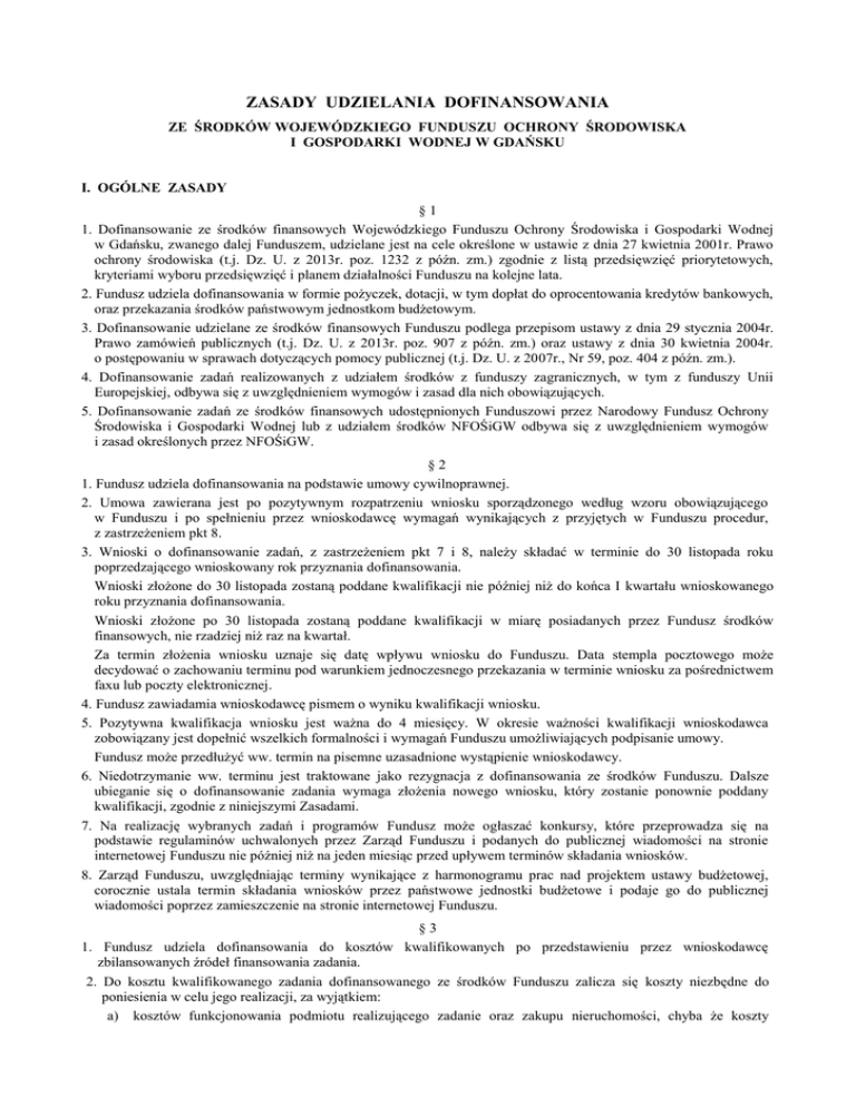 ZASADY UDZIELANIA DOFINANSOWANIA ZE ŚRODKÓW WOJEWÓDZKIEGO FUNDUSZU OCHRONY ŚRODOWISKA I GOSPODARKI WODNEJ W GDAŃSKU I. OGÓLNE ZASADY §1 1. Dofinansowanie ze środków finansowych Wojewódzkiego Funduszu Ochrony Środowiska i Gospodarki Wodnej w Gdańsku, zwanego dalej Funduszem, udzielane jest na cele określone w ustawie z dnia 27 kwietnia 2001r. Prawo ochrony środowiska (t.j. Dz. U. z 2013r. poz. 1232 z późn. zm.) zgodnie z listą przedsięwzięć priorytetowych, kryteriami wyboru przedsięwzięć i planem działalności Funduszu na kolejne lata. 2. Fundusz udziela dofinansowania w formie pożyczek, dotacji, w tym dopłat do oprocentowania kredytów bankowych, oraz przekazania środków państwowym jednostkom budżetowym. 3. Dofinansowanie udzielane ze środków finansowych Funduszu podlega przepisom ustawy z dnia 29 stycznia 2004r. Prawo zamówień publicznych (t.j. Dz. U. z 2013r. poz. 907 z późn. zm.) oraz ustawy z dnia 30 kwietnia 2004r. o postępowaniu w sprawach dotyczących pomocy publicznej (t.j. Dz. U. z 2007r., Nr 59, poz. 404 z późn. zm.). 4. Dofinansowanie zadań realizowanych z udziałem środków z funduszy zagranicznych, w tym z funduszy Unii Europejskiej, odbywa się z uwzględnieniem wymogów i zasad dla nich obowiązujących. 5. Dofinansowanie zadań ze środków finansowych udostępnionych Funduszowi przez Narodowy Fundusz Ochrony Środowiska i Gospodarki Wodnej lub z udziałem środków NFOŚiGW odbywa się z uwzględnieniem wymogów i zasad określonych przez NFOŚiGW. §2 1. Fundusz udziela dofinansowania na podstawie umowy cywilnoprawnej. 2. Umowa zawierana jest po pozytywnym rozpatrzeniu wniosku sporządzonego według wzoru obowiązującego w Funduszu i po spełnieniu przez wnioskodawcę wymagań wynikających z przyjętych w Funduszu procedur, z zastrzeżeniem pkt 8. 3. Wnioski o dofinansowanie zadań, z zastrzeżeniem pkt 7 i 8, należy składać w terminie do 30 listopada roku poprzedzającego wnioskowany rok przyznania dofinansowania. Wnioski złożone do 30 listopada zostaną poddane kwalifikacji nie później niż do końca I kwartału wnioskowanego roku przyznania dofinansowania. Wnioski złożone po 30 listopada zostaną poddane kwalifikacji w miarę posiadanych przez Fundusz środków finansowych, nie rzadziej niż raz na kwartał. Za termin złożenia wniosku uznaje się datę wpływu wniosku do Funduszu. Data stempla pocztowego może decydować o zachowaniu terminu pod warunkiem jednoczesnego przekazania w terminie wniosku za pośrednictwem faxu lub poczty elektronicznej. 4. Fundusz zawiadamia wnioskodawcę pismem o wyniku kwalifikacji wniosku. 5. Pozytywna kwalifikacja wniosku jest ważna do 4 miesięcy. W okresie ważności kwalifikacji wnioskodawca zobowiązany jest dopełnić wszelkich formalności i wymagań Funduszu umożliwiających podpisanie umowy. Fundusz może przedłużyć ww. termin na pisemne uzasadnione wystąpienie wnioskodawcy. 6. Niedotrzymanie ww. terminu jest traktowane jako rezygnacja z dofinansowania ze środków Funduszu. Dalsze ubieganie się o dofinansowanie zadania wymaga złożenia nowego wniosku, który zostanie ponownie poddany kwalifikacji, zgodnie z niniejszymi Zasadami. 7. Na realizację wybranych zadań i programów Fundusz może ogłaszać konkursy, które przeprowadza się na podstawie regulaminów uchwalonych przez Zarząd Funduszu i podanych do publicznej wiadomości na stronie internetowej Funduszu nie później niż na jeden miesiąc przed upływem terminów składania wniosków. 8. Zarząd Funduszu, uwzględniając terminy wynikające z harmonogramu prac nad projektem ustawy budżetowej, corocznie ustala termin składania wniosków przez państwowe jednostki budżetowe i podaje go do publicznej wiadomości poprzez zamieszczenie na stronie internetowej Funduszu. §3 1. Fundusz udziela dofinansowania do kosztów kwalifikowanych po przedstawieniu przez wnioskodawcę zbilansowanych źródeł finansowania zadania. 2. Do kosztu kwalifikowanego zadania dofinansowanego ze środków Funduszu zalicza się koszty niezbędne do poniesienia w celu jego realizacji, za wyjątkiem: a) kosztów funkcjonowania podmiotu realizującego zadanie oraz zakupu nieruchomości, chyba że koszty dotyczą zarządzania zadaniem (np. nadzór techniczny i merytoryczny), b) kosztów finansowych obsługi zadania, w tym odsetek od zadłużenia, 3. Udzielanie dofinansowania jest uzależnione od wywiązania się przez wnioskodawcę z obowiązku uiszczania opłat za korzystanie ze środowiska i administracyjnych kar pieniężnych wynikających z ustawy Prawo ochrony środowiska oraz od wywiązania się ze zobowiązań w stosunku do Funduszu wynikających z wcześniej zawartych umów, a także od stosowania kryteriów i/lub wymagań ekologicznych ograniczających negatywny wpływ zamawianych produktów/usług na środowisko. 4. Fundusz może pokryć koszty poniesione przez wnioskodawcę przed datą zawarcia umowy o dofinansowanie, jeżeli zostały one poniesione po podjęciu przez Zarząd Funduszu decyzji o zakwalifikowaniu zadania do dofinansowania. 5. Udzielone przez Fundusz dofinansowanie nie może przekroczyć 80% kosztów kwalifikowanych zadania, z zastrzeżeniem pkt 6. 6. Dofinansowanie może wynosić do 100% kosztów kwalifikowanych zadania w przypadku zadań z zakresu edukacji ekologicznej i ochrony przyrody, a także zadań, o których mowa w § 2 pkt 7, lub w szczególnych przypadkach zadań realizowanych przez podmioty sektora finansów publicznych i organizacje pozarządowe. 7. Fundusz nie udziela dofinansowania na zadania zakończone, z zastrzeżeniem pkt 8. 8. W szczególnych przypadkach takich jak: a) zadania związane z usuwaniem skutków klęsk żywiołowych, zdarzeń losowych czy sytuacji zagrażających życiu lub zdrowiu ludzi, b) zadania, które uzyskały dofinansowanie z funduszy zagranicznych, w tym z funduszy Unii Europejskiej, dopuszcza się możliwość dokonania przez Fundusz refundacji kosztów zadań zakońc