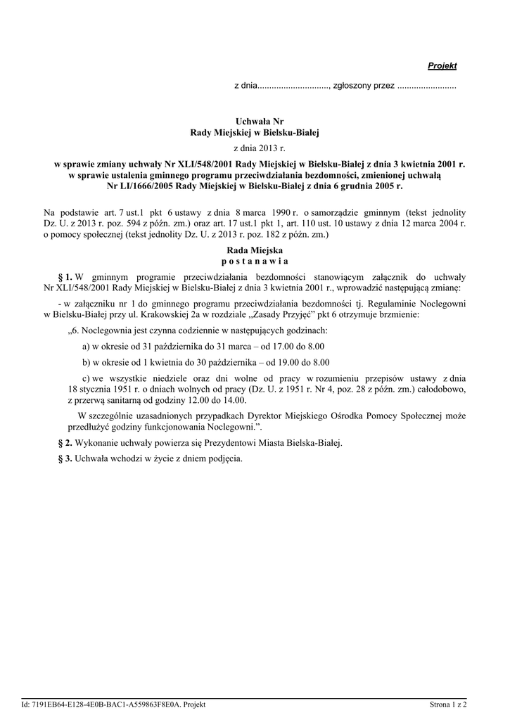 Projekt z dnia.............................., zgłoszony przez ......................... Uchwała Nr Rady Miejskiej w Bielsku-Białej z dnia 2013 r. w sprawie zmiany uchwały Nr XLI/548/2001 Rady Miejskiej w Bielsku-Białej z dnia 3 kwietnia 2001 r. w sprawie ustalenia gminnego programu przeciwdziałania bezdomności, zmienionej uchwałą Nr LI/1666/2005 Rady Miejskiej w Bielsku-Białej z dnia 6 grudnia 2005 r. Na podstawie art. 7 ust.1 pkt 6 ustawy z dnia 8 marca 1990 r. o samorządzie gminnym (tekst jednolity Dz. U. z 2013 r. poz. 594 z późn. zm.) oraz art. 17 ust.1 pkt 1, art. 110 ust. 10 ustawy z dnia 12 marca 2004 r. o pomocy społecznej (tekst jednolity Dz. U. z 2013 r. poz. 182 z późn. zm.) Rada Miejska postanawia § 1. W gminnym programie przeciwdziałania bezdomności stanowiącym załącznik do uchwały Nr XLI/548/2001 Rady Miejskiej w Bielsku-Białej z dnia 3 kwietnia 2001 r., wprowadzić następującą zmianę: - w załączniku nr 1 do gminnego programu przeciwdziałania bezdomności tj. Regulaminie Noclegowni w Bielsku-Białej przy ul. Krakowskiej 2a w rozdziale ,,Zasady Przyjęć” pkt 6 otrzymuje brzmienie: „6. Noclegownia jest czynna codziennie w następujących godzinach: a) w okresie od 31 października do 31 marca – od 17.00 do 8.00 b) w okresie od 1 kwietnia do 30 października – od 19.00 do 8.00 c) we wszystkie niedziele oraz dni wolne od pracy w rozumieniu przepisów ustawy z dnia 18 stycznia 1951 r. o dniach wolnych od pracy (Dz. U. z 1951 r. Nr 4, poz. 28 z późn. zm.) całodobowo, z przerwą sanitarną od godziny 12.00 do 14.00. W szczególnie uzasadnionych przypadkach Dyrektor Miejskiego Ośrodka Pomocy Społecznej może przedłużyć godziny funkcjonowania Noclegowni.”. § 2. Wykonanie uchwały powierza się Prezydentowi Miasta Bielska-Białej. § 3. Uchwała wchodzi w życie z dniem podjęcia. Id: 7191EB64-E128-4E0B-BAC1-A559863F8E0A. Projekt Strona 1 z 2 Uzasadnienie W uchwale Nr XLI/548/2001 Rady Miejskiej w Bielsku-Białej z dnia 3 kwietnia 2001 r. w sprawie ustalenia gminnego programu przeciwdziałania bezdomności, znowelizowanej uchwałą Nr LI/1666/2005 Rady Miejskiej w Bielsku-Białej z dnia 6 grudnia 2005 r., w Regulaminie Noclegowni przy ul. Krakowskiej 2a w Bielsku-Białej, który stanowi załącznik nr 1 do przedmiotowego programu określono funkcjonowanie tej placówki w rozdziale ,,Zasady przyjęć”. Zgodnie z przyjętą regulacją w niedziele i święta przypadające w okresie od 1 listopada – Wszystkich Świętych do drugiego dnia Wielkiej Nocy mieszkańcy Noclegowni korzystali z całodobowego pobytu w placówce, z ograniczeniem na przerwę sanitarną od 12.00 do 14.00. W przedłożonej uchwale wprowadza się zmianę dotyczącą uprawnień do pobytu w Noclegowni w niedziele i święta, która umożliwi osobom bezdomnym korzystanie z pobytu całodobowego w tej placówce we wszystkie dni ustawowo wolne od pracy określone w odrębnych przepisach. Z wnioskiem o rozszerzenie uprawnień do pobytu w Noclegowni w każdą niedzielę i wszystkie święta w ciągu całego roku wystąpiła grupa 40 osób bezdomnych korzystających ze schronienia w Noclegowni. Po przeprowadzeniu analizy skutków finansowych postulowanego rozwiązania, z dniem 7 lipca 2013 r. pilotażowo rozszerzono uprawnienia do pobytu osób bezdomnych w Noclegowni. Według prognozy skutków finansowych, wprowadzona zmiana spowoduje wzrost kosztów funkcjonowania Noclegowni w bieżącym roku kalendarzowym o kwotę 4 606 ,00 zł. Id: 7191EB64-E128-4E0B-BAC1-A559863F8E0A. Projekt Strona 2 z 2