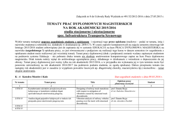 Załącznik nr 8 do Uchwały Rady Wydziału nr 491/32/2012-2016 z dnia 27.05.2015 r. TEMATY PRAC DYPLOMOWYCH MAGISTERSKICH NA ROK AKADEMICKI 2015/2016 studia stacjonarne i niestacjonarne spec. Infrastruktura Transportu Szynowego Wybór tematu następuje poprzez uzgodnienie studenta z opiekunem i rejestracji tego przez opiekuna (mailowo – podać nr tematu, imię i nazwisko studenta) u referentki d.s. dydaktyki w dziekanacie (p. 205b C7). W czasie zapisów komputerowych na zajęcia semestru zimowego lub letniego 2015/2016 student zobowiązany jest do zapisania się w systemie EDUKACJA na kurs PRACA DYPLOMOWA MAGISTERSKA na nazwisko (uzgodnionego !) opiekuna pracy, co jest równoznaczne z podjęciem się realizacji tego kursu w danym semestrze (w uzgodnieniu z opiekunem student może realizować już wcześniej temat). Temat pracy dyplomowej (druk z podpisami) zostanie wydany zapisanym studentom na podstawie systemu Edukacja – nie pobranie druku tematu nie skutkuje anulowaniem komputerowego zapisu na kurs Praca dyplomowa magisterska. Druk tematu należy wpiąć do archiwalnego egzemplarza pracy, składanego w dziekanacie z wnioskiem o dopuszczenie do jej obrony. Temat pracy dyplomowej jest ważny tylko na rok akademicki 2015/2016, a w przypadku nie wykonania jej w tym terminie może być ponownie zatwierdzony na rok akademicki 2016/2017 (na podstawie podania studenta, ze zgodą opiekuna). Dalsze przepisanie tematu (na następny rok akademicki) jest w zasadzie (z wyjątkiem powodów losowych np. długotrwałej choroby, macierzyństwa itp.) niemożliwe – temat ulegnie anulowaniu. K - 4 Katedra Mostów i Kole Nr tematu 1 1/ITS/15 2/ITS/15 3/ITS/15 4/ITS/15 Temat pracy 2 Kształtowanie odcinków przejściowych toru kolejowego w kontekście redukcji drgań spowodowanych nierównością progową Analiza drgań pojazdów kolejowych w trakcie ich przejazdu przez nierówność progową toru Stan uzgodnień studentów z dnia 09.03.2016 r. Title 3 Designing of railway track transitions with respect to mitigation of vibrations caused by structural track discontinuity Vibration analysis of railway vehicles passing over the track with structural discontinuity Opiekun pracy planowany recenzent 4 prof. Danuta Bryja dr inż. Radosław Mazurkiewicz prof. Danuta Bryja dr inż. Jarosław Zwolski Student 5 5/ITS/15 Kolej przemysłowa w SSE Żarów 6/ITS/15 Trasa tramwajowa Sołtysowice – Gaj i stacja przesiadkowa Sołtysowice 7/ITS/15 8/ITS/15 9/ITS/15 10/ITS/15 11/ITS/15 Modernizacja kolei wąskotorowej na odcinku Bytom – Miasteczko Śląskie Połączenie transportem szynowym stacji i miasta Środa Śląska Analiza i propozycje poprawy warunków ruchu tramwajów na przykładzie wybranej linii we Wrocławiu Analiza możliwości budowy nowej linii tramwajowej wzdłuż ul. Królewieckiej we Wrocławiu 12/ITS/15 Analiza możliwości modernizacji linii tramwajowej wzdłuż ul. Grabiszyńskiej między ul. Fiołkową a Oporowem we Wrocławiu 13/ITS/15 Analiza możliwości budowy nowej linii tramwajowej wzdłuż Al. Wiśniowej i Armii Krajowej od ul. Powstańców Śl. do ul. Bardzkiej we Wrocławiu 14/ITS/15 Analiza możliwości budowy nowej linii tramwajowej wzdłuż Al. Armii Krajowej i projektowanej trasy mostu wschodniego od ul. Tarnogajskiej do ul. Olszewskiego we Wrocławiu 15/ITS/15 Analiza możliwości budowy nowej linii tramwajowej do Bartoszowic wzdłuż ul. Dembowskiego i Bacciarellego we Wrocławiu 16/ITS/15 Analiza możliwości budowy nowej linii tramwajowej do Psiego Pola wzdłuż ul. Kromera i Krzywoustego we Wrocławiu Industrial railway in Special Economic Zone in Żarów Tramway line Sołtysowice – Gaj and transfer station Sołtysowice dr inż. Igor Gisterek prof. Danuta Bryja dr inż. Igor Gisterek prof. Danuta Bryja Temat zajęty Modernization of narrow gauge railway Bytom – Miasteczko Śląskie Rail transport connecting Środa Śląska town and station Research and proposals of improving tramway traffic basing on a chosen line in Wrocław Possibility analysis of new tram line construction along Królewiecka street in Wrocław Possibility analysis of tram line modernization along Grabiszyńska street between Fiołkowa street and Oporów in Wrocław Possibility analysis of new tram line construction along Wiśniowa and Armii Krajowej streets from Powstańców Śl. street to Bardzka street in Wrocław Possibility analysis of new tram line construction along Armii Krajowej street and planned east bridge route from Tarnogajska street to Olszewskiego street in Wrocław Possibility analysis of new tram line construction to Bartoszowice along Dembowskiego and Baccarellego streets in Wrocław dr inż. Igor Gisterek prof. Danuta Bryja dr inż. Igor Gisterek prof. Danuta Bryja dr inż. Igor Gisterek prof. Danuta Bryja Temat zajęty dr inż. Jacek Makuch prof. Danuta Bryja Temat zajęty dr inż. Jacek Makuch prof. Danuta Bryja Temat zajęty Possibility analysis of new tram line construction to Psie Pole along Kromera and Krzywoustego streets in Temat zajęty Temat zajęty Temat zajęty dr inż. Jacek Makuch prof. Danuta Bryja dr inż. Jacek Makuch prof. Danuta Bryja Temat zajęty dr inż. Jacek Makuch prof. Danuta Bryja Temat zajęty dr inż. Jacek Makuch prof. Danuta Bryja Temat zajęty 25/ITS/15 Modernizacja stacji Szewce 26/ITS/15 Modernizacja stacji Gryfów Śląski 27/ITS/15 Modernizacja stacji Lubawka 28/ITS/15 Bocznica kolejowa Skokowa – Peleszyn Wrocław Possibility analysis of new tram-train line construction between Poświętne and Karłowice using non operated rail track in Wrocław Rebuilding of the railway station Henryków Modernization of the equipmenttransportation base Modernization of the railway station Kozłów with its adaptation to TSI Infrastructure requirements Building of the nodal railway station Oleśnica Wschodnia Conception of improvement of the railway connection between Wrocław and Berlin on border area Revitalization and modernization of the railway line no. 31