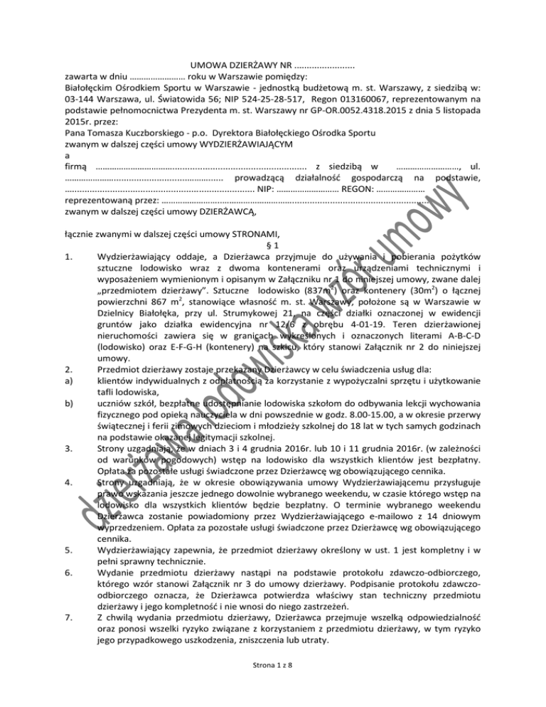 UMOWA DZIERŻAWY NR ........................ zawarta w dniu …………………… roku w Warszawie pomiędzy: Białołęckim Ośrodkiem Sportu w Warszawie - jednostką budżetową m. st. Warszawy, z siedzibą w: 03-144 Warszawa, ul. Światowida 56; NIP 524-25-28-517, Regon 013160067, reprezentowanym na podstawie pełnomocnictwa Prezydenta m. st. Warszawy nr GP-OR.0052.4318.2015 z dnia 5 listopada 2015r. przez: Pana Tomasza Kuczborskiego - p.o. Dyrektora Białołęckiego Ośrodka Sportu zwanym w dalszej części umowy WYDZIERŻAWIAJĄCYM a firmą ……………………………..................................................... z siedzibą w ………………………, ul. ………………….............................………...... prowadzącą działalność gospodarczą na podstawie, …........................................................................ NIP: ……………………… REGON: ………………… reprezentowaną przez: ……………………..…………………………...................................................... zwanym w dalszej części umowy DZIERŻAWCĄ, łącznie zwanymi w dalszej części umowy STRONAMI, §1 1. Wydzierżawiający oddaje, a Dzierżawca przyjmuje do używania i pobierania pożytków sztuczne lodowisko wraz z dwoma kontenerami oraz urządzeniami technicznymi i wyposażeniem wymienionym i opisanym w Załączniku nr 1 do niniejszej umowy, zwane dalej „przedmiotem dzierżawy”. Sztuczne lodowisko (837m2) oraz kontenery (30m2) o łącznej powierzchni 867 m2, stanowiące własność m. st. Warszawy, położone są w Warszawie w Dzielnicy Białołęka, przy ul. Strumykowej 21, na części działki oznaczonej w ewidencji gruntów jako działka ewidencyjna nr 12/6 z obrębu 4-01-19. Teren dzierżawionej nieruchomości zawiera się w granicach wykreślonych i oznaczonych literami A-B-C-D (lodowisko) oraz E-F-G-H (kontenery) na szkicu, który stanowi Załącznik nr 2 do niniejszej umowy. 2. Przedmiot dzierżawy zostaje przekazany Dzierżawcy w celu świadczenia usług dla: a) klientów indywidualnych z odpłatnością za korzystanie z wypożyczalni sprzętu i użytkowanie tafli lodowiska, b) uczniów szkół, bezpłatne udostępnianie lodowiska szkołom do odbywania lekcji wychowania fizycznego pod opieką nauczyciela w dni powszednie w godz. 8.00-15.00, a w okresie przerwy świątecznej i ferii zimowych dzieciom i młodzieży szkolnej do 18 lat w tych samych godzinach na podstawie okazanej legitymacji szkolnej. 3. Strony uzgadniają, że w dniach 3 i 4 grudnia 2016r. lub 10 i 11 grudnia 2016r. (w zależności od warunków pogodowych) wstęp na lodowisko dla wszystkich klientów jest bezpłatny. Opłata za pozostałe usługi świadczone przez Dzierżawcę wg obowiązującego cennika. 4. Strony uzgadniają, że w okresie obowiązywania umowy Wydzierżawiającemu przysługuje prawo wskazania jeszcze jednego dowolnie wybranego weekendu, w czasie którego wstęp na lodowisko dla wszystkich klientów będzie bezpłatny. O terminie wybranego weekendu Dzierżawca zostanie powiadomiony przez Wydzierżawiającego e-mailowo z 14 dniowym wyprzedzeniem. Opłata za pozostałe usługi świadczone przez Dzierżawcę wg obowiązującego cennika. 5. Wydzierżawiający zapewnia, że przedmiot dzierżawy określony w ust. 1 jest kompletny i w pełni sprawny technicznie. 6. Wydanie przedmiotu dzierżawy nastąpi na podstawie protokołu zdawczo-odbiorczego, którego wzór stanowi Załącznik nr 3 do umowy dzierżawy. Podpisanie protokołu zdawczoodbiorczego oznacza, że Dzierżawca potwierdza właściwy stan techniczny przedmiotu dzierżawy i jego kompletność i nie wnosi do niego zastrzeżeń. 7. Z chwilą wydania przedmiotu dzierżawy, Dzierżawca przejmuje wszelką odpowiedzialność oraz ponosi wszelki ryzyko związane z korzystaniem z przedmiotu dzierżawy, w tym ryzyko jego przypadkowego uszkodzenia, zniszczenia lub utraty. Strona 1 z 8 1. 2. a) b) c) d) 3. 4. 5. 1. 2. 3. 4. 5. 6. 7. 8. 9. 10. §2 Okres obowiązywania umowy Strony ustalają od dnia 3 grudnia 2016 r. do dnia 5 marca 2017 r. Termin zakończenia umowy może ulec zmianie w przypadku wystąpienia niekorzystnych warunków atmosferycznych nie pozwalających na prawidłowe funkcjonowanie lodowiska tj. w przypadku: przekroczenia temperatury otoczenia powyżej +10°C, przekroczenia wilgotności względnej powietrza powyżej 70%, ruchu powietrza nad taflą powyżej 2,0 m/s, wystąpienia intensywnych opadów atmosferycznych. W przypadku wystąpienia niekorzystnych warunków atmosferycznych, Strony dopuszczają możliwość czasowego wyłączenia lodowiska z eksploatacji nie powodującego konieczności zakończenia umowy. Czasowe wyłączenie lodowiska z eksploatacji możliwe jest jedynie na podstawie zgodnego oświadczenia woli Stron zawartego w formie pisemnego aneksu do umowy. Rozbudowa lub przebudowa przedmiotu dzierżawy oraz wzniesienie jakichkolwiek obiektów trwale i nietrwale związanych z gruntem wymaga pisemnej zgody Wydzierżawiającego. Zgoda wydzierżawiającego nie zwalnia Dzierżawcy z obowiązku uzyskania wymaganych zgód, pozwoleń, zezwoleń i uzgodnień w tym zakresie. Wysokość ani charakter nakładów poniesionych na zagospodarowanie terenu nie będzie stanowić podstawy do domagania się zawarcia kolejnej umowy dzierżawy, jak również zgłaszania przez Dzierżawcę jakichkolwiek innych roszczeń majątkowych wobec Wydzierżawiającego po wygaśnięciu umowy. §3 Strony ustalają miesięczny czynsz dzierżawny w kwocie netto …………..,….zł (słownie złotych:…………………………………………….……………………………….), co odpowiada stawce netto ……….,…. zł (słownie złotych: ………………………….) za 1m² dzierżawionej powierzchni. Kwota czynszu będzie każdorazowo powiększona o podatek VAT, ustalony według obowiązującej stawki, która w dniu zawarcia umowy wynosi 23 %. Kwota miesięcznego czynsz