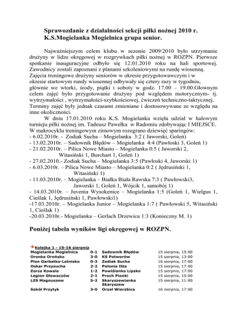 Sprawozdanie z działalności sekcji piłki nożnej 2010 r. K.S.Mogielanka Mogielnica grupa senior. Najważniejszym celem klubu w sezonie 2009/2010 było utrzymanie drużyny w lidze okręgowej w rozgrywkach piłki nożnej w ROZPN. Pierwsze spotkanie inauguracyjne odbyło się 12.01.2010 roku na hali sportowej. Zawodnicy zostali zapoznani z planami szkoleniowymi na rundę wiosenną. Zajęcia treningowe drużyny seniorów w okresie przygotowawczym i w okresie startowym rundy wiosennej odbywały się cztery razy w tygodniu, głównie we wtorki, środy, piątki i soboty w godz. 17.00 – 19.00.Głownym celem zajęć było przygotowanie drużyny pod względem motorycznym- tj. wytrzymałości , wytrzymałości-szybkościowej, ćwiczeń techniczno-taktycznej. Terminy zajęć były jednak czasami zmieniane i dostosowywane ze względu na inne okoliczności. W dniu 17.01.2010 roku K.S. Mogielanka wzięła udział w halowym turnieju piłki nożnej im. Tadeusz Pawełka w Radomiu zdobywając I MIEJSCE. W makrocyklu treningowym zimowym rozegrano dziewięć sparingów: - 6.02.2010r. - Zodiak Sucha – Mogielanka 3:2 ( Jaworski, Goleń) - 13.02.2010r. – Sadownik Błędów – Mogielanka 4:4 (Pawłoski 3, Goleń 1) - 21.02.2010r. – Pilica Nowe Miasto – Mogielanka 0:5 ( Jaworski 2, Witasiński 1, Burchart 1, Goleń 1) - 27.02.2010.- Zodiak Sucha – Mogielanka 3:5 (Pawłoski 4, Jaworski 1) - 6.03.2010r. – Pilica Nowe Miasto – Mogielanka 0:2 ( Jędrusiński 1, Witasiński 1) - 11.03.2010r. – Mogielanka – Białka Biała Rawska 7:3 ( Pawłowski3, Jaworski 1, Goleń 1, Wójcik 1, samobój 1) - 14.03.2010r. – Juvenia Wysokenice – Mogielanka 1:5 (Goleń 1, Wielgus 1, Cieślak 1, Jędrusiński 1, Pawłowski1) -17.03.2010r. – Mogielanka Junior – Mogielanka 1:7 ( Pawłowski 5, Witasiński 1, Cieślak 1) -20.03.2010r.- Mogielanka – Gerlach Drzewica 1:3 (Konieczny M. 1) Poniżej tabela wyników ligi okręgowej w ROZPN. Kolejka 1 - 15-16 sierpnia Mogielanka Mogielnica 0-1 Oronka Orońsko 3-0 Plon Garbatka-Letnisko 0-3 Oskar Przysucha 2-2 Zorza Kowala 1-2 Legion Głowaczów 2-1 LZS Magnuszew 5-2 Sokół Przytyk 3-0 Sadownik Błędów KS Potworów Zodiak Sucha Polonia Iłża Powiślanka Lipsko Proch Pionki Skaryszewianka Skaryszew Orzeł Wierzbica 15 15 16 15 15 15 15 sierpnia, sierpnia, sierpnia, sierpnia, sierpnia, sierpnia, sierpnia, 15:00 13:00 17:00 17:00 17:00 15:00 11:00 16 sierpnia, 17:00 (wo) Kolejka 2 - 22-23 sierpnia Skaryszewianka 3-1 Skaryszew Proch Pionki 5-0 Powiślanka Lipsko 3-4 w Ciepielowie Polonia Iłża 2-0 Zodiak Sucha 2-1 KS Potworów 3-1 Sokół Przytyk 0-1 Sadownik Błędów 2-0 Kolejka 3 - 26 sierpnia Oronka Orońsko Plon Garbatka-Letnisko Oskar Przysucha Zorza Kowala Legion Głowaczów LZS Magnuszew Skaryszewianka Skaryszew Orzeł Wierzbica Mogielanka Mogielnica 23 sierpnia, 17:00 LZS Magnuszew Legion Głowaczów 23 sierpnia, 17:00 22 sierpnia, 17:00 Zorza Kowala Oskar Przysucha Plon Garbatka-Letnisko Oronka Orońsko Orzeł Wierzbica 23 23 23 23 23 sierpnia, sierpnia, sierpnia, sierpnia, sierpnia, 17:00 16:00 17:00 17:00 17:00 0-1 1-2 1-2 0-0 2-2 3-3 0-1 Sadownik Błędów Sokół Przytyk KS Potworów Zodiak Sucha Polonia Iłża Powiślanka Lipsko Proch Pionki 26 26 26 26 26 26 26 sierpnia, sierpnia, sierpnia, sierpnia, sierpnia, sierpnia, sierpnia, 17:30 17:30 17:30 17:30 17:30 17:30 17:30 1-0 Mogielanka Mogielnica 26 sierpnia, 17:30 Skaryszewianka Skaryszew LZS Magnuszew Legion Głowaczów Zorza Kowala Oskar Przysucha Plon Garbatka-Letnisko Oronka Orońsko Proch Pionki 30 sierpnia, 17:30 Orzeł Wierzbica Sadownik Błędów Sokół Przytyk KS Potworów Zodiak Sucha 6 6 5 6 6 Polonia Iłża 6 września, 16:00 Powiślanka Lipsko Mogielanka Mogielnica 9 września, 17:00 5 września, 16:00 Proch Pionki Skaryszewianka Skaryszew LZS Magnuszew Legion Głowaczów Zorza Kowala Oskar Przysucha Plon Garbatka-Letnisko Powiślanka Lipsko 13 września, 16:00 13 września, 15:00 Oronka Orońsko 20 września, 16:00 Kolejka 4 - 29-30 sierpnia Powiślanka Lipsko 2-1 Polonia Iłża Zodiak Sucha KS Potworów Sokół Przytyk Sadownik Błędów Orzeł Wierzbica Mogielanka Mogielnica Kolejka 5 - 5-6 września Plon Garbatka-Letnisko Oskar Przysucha Zorza Kowala Legion Głowaczów LZS Magnuszew Skaryszewianka Skaryszew Proch Pionki Oronka Orońsko 1-1 0-0 4-1 1-1 0-0 5-0 0-3 1-2 1-3 1-0 2-0 0-3 (wo) 2-3 3-3 2-1 Kolejka 6 - 12-13 września Polonia Iłża 3-0 Zodiak Sucha 1-0 KS Potworów Sokół Przytyk Sadownik Błędów Orzeł Wierzbica Oronka Orońsko Mogielanka Mogielnica 7-2 0-0 1-0 6-0 0-1 0-2 Kolejka 7 - 19-20 września Oskar Przysucha 0-3 30 30 30 30 30 29 30 sierpnia, sierpnia, sierpnia, sierpnia, sierpnia, sierpnia, sierpnia, 17:00 16:00 17:00 17:00 17:00 17:00 17:00 września, września, września, września, września, 17:00 17:00 17:00 16:00 16:00 13 13 13 12 12 13 września, września, września, września, września, września, 17:00 16:00 16:00 16:00 17:00 17:00 Zorza Kowala Legion Głowaczów LZS Magnuszew Skaryszewianka Skaryszew Proch Pionki Powiślanka Lipsko Plon Garbatka-Letnisko 0-2 1-1 3-3 3-3 Orzeł Wierzbica Sadownik Błędów Sokół Przytyk KS Potworów 20 20 20 20 3-1 1-2 3-2 Zodiak Sucha Polonia Iłża Mogielanka Mogielnica 20 września, 16:00 19 września, 16:00 20 września, 16:00 Powiślanka Lipsko Proch Pionki Skaryszewianka Skaryszew LZS Magnuszew Legion Głowaczów Zorza Kowala Oskar Przysucha Polonia Iłża 27 września, 15:00 27 września, 16:00 27 września, 16:00 Plon Garbatka-Letnisko Oronka Orońsko Orzeł Wierzbica Sadownik Błędów 4 4 4 4 października, października, października, października, 15:00 14:00 16:00 15:00 Sokół Przytyk KS Potworów Zodiak Sucha Mogielanka Mogielnica 4 3 4 4 października, października, października, października, 15:00 15:00 15:00 15:00 Kolejka 8 - 26-27 września Zodiak Sucha 3-1 KS Potworów 3-2 Sokół Przytyk 5-1 Sadownik Błędów Orzeł Wierzbica Oronka Orońsko Plon Garbatka-Letnisko Mogielanka Mogielnic
