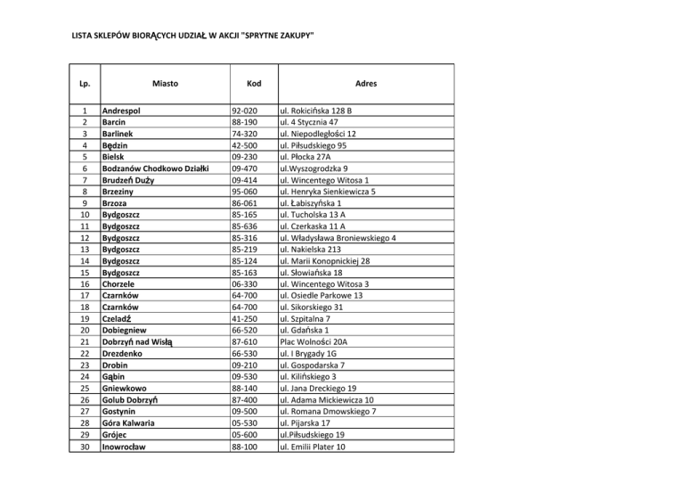 LISTA SKLEPÓW BIORĄCYCH UDZIAŁ W AKCJI "SPRYTNE ZAKUPY" Lp. 1 2 3 4 5 6 7 8 9 10 11 12 13 14 15 16 17 18 19 20 21 22 23 24 25 26 27 28 29 30 Miasto Andrespol Barcin Barlinek Będzin Bielsk Bodzanów Chodkowo Działki Brudzeń Duży Brzeziny Brzoza Bydgoszcz Bydgoszcz Bydgoszcz Bydgoszcz Bydgoszcz Bydgoszcz Chorzele Czarnków Czarnków Czeladź Dobiegniew Dobrzyń nad Wisłą Drezdenko Drobin Gąbin Gniewkowo Golub Dobrzyń Gostynin Góra Kalwaria Grójec Inowrocław Kod 92-020 88-190 74-320 42-500 09-230 09-470 09-414 95-060 86-061 85-165 85-636 85-316 85-219 85-124 85-163 06-330 64-700 64-700 41-250 66-520 87-610 66-530 09-210 09-530 88-140 87-400 09-500 05-530 05-600 88-100 Adres ul. Rokicińska 128 B ul. 4 Stycznia 47 ul. Niepodległości 12 ul. Piłsudskiego 95 ul. Płocka 27A ul.Wyszogrodzka 9 ul. Wincentego Witosa 1 ul. Henryka Sienkiewicza 5 ul. Łabiszyńska 1 ul. Tucholska 13 A ul. Czerkaska 11 A ul. Władysława Broniewskiego 4 ul. Nakielska 213 ul. Marii Konopnickiej 28 ul. Słowiańska 18 ul. Wincentego Witosa 3 ul. Osiedle Parkowe 13 ul. Sikorskiego 31 ul. Szpitalna 7 ul. Gdańska 1 Plac Wolności 20A ul. I Brygady 1G ul. Gospodarska 7 ul. Kilińskiego 3 ul. Jana Dreckiego 19 ul. Adama Mickiewicza 10 ul. Romana Dmowskiego 7 ul. Pijarska 17 ul.Piłsudskiego 19 ul. Emilii Plater 10 31 32 33 34 35 36 37 38 39 40 41 42 43 44 45 46 47 48 49 50 51 52 53 54 55 56 57 58 59 60 61 62 63 64 65 66 Inowrocław Inowrocław Inowrocław Inowrocław Inowrocław Inowrocław Inowrocław Janikowo Janikowo Kadzidło Kargowa Kaźmierz Kielce Końskie Kosów Lacki Kostrzyn nad Odrą Kostrzyn nad Odrą Kowal Kraków Kraków Kraków Kraków Kraków Kraków Kraków Kraków Kraków Kraków Kraków Kraków Kruszwica Kruszwica Krzyż Wielkopolski Kutno Kutno Kwidzyn 88-100 88-100 88-100 88-100 88-100 88-100 88-100 88-160 88-160 07-420 66-120 64-530 25-014 26-200 08-330 66-470 66-470 87-200 30-334 30-836 30-833 30-833 31-711 31-621 31-630 31-624 31-927 31-844 31-311 31-046 88-150 88-150 64-761 99-300 99-300 82-500 ul. Jacewska 25 ul. Niepodległości 70 ul. Gabriela Narutowicza 64 ul. Jagiellońska 26 ul. Władysława Łokietka 29 ul. Antoniego Laubitza 8 ul. Andrzeja 19 ul. Dworcowa 9 ul. Klonowa 7 ul. Kościuszki 6A Rynek 3 ul. Rynek 5 ul. Żelazna 22 ul. Kilińskiego 21 ul. Pańska 8 ul. Mikołaja Kopernika 3/5 ul. Drzewicka 1A ul. Zamkowa 8 os. Komandosów 8 ul. Erazma Jerzmanowskiego 38 ul. Lilli Wenedy 1 ul. Na Stoku 1 ul. Władysława Jagiełły 31A os. Bohaterów Września 26 os. Kombatantów 14 os. Piastów 21 os. Centrum B5 os. Kazimierzowskie 34 ul. Józefa Elsnera 3 ul. Św. Gertrudy 5 ul. Kujawska 9 ul. Zamkowa 3 ul. Plac Zwycięstwa 1 ul. Norberta Barlickiego 22B ul. Warszawskie Przedmieście 12 ul. Jana Brzechwy 5 67 68 69 70 71 72 73 74 75 76 77 78 79 80 81 82 83 84 85 86 87 88 89 90 91 92 93 94 95 96 97 98 99 100 101 102 Legionowo Limanowa Lipno Lubień Kujawski Lubraniec Łochowo Łomża Łomża Łowicz Łowicz Łowicz Łódź Łódź Łódź Maków Mazowiecki Maków Podhalański Małkinia Górna Mielec Międzychód Mława Mogilno Murowana Goślina Myszków Myślibórz Nakło n/Notecią Nieporęt Nowy Dwór Mazowiecki Oborniki Opatów Opoczno Ostrołęka Ostrołęka Ostrołęka Ostrowiec Świętokrzyski Ozorków Pabianice 05-119 34-600 87-600 87-840 87-890 86-065 18-400 18-400 09-400 99-400 99-400 92-543 94-042 91-445 06-200 34-220 07-320 39-300 64-400 06-500 88-300 62-095 42-300 74-300 89-100 05-126 05-100 64-600 27-500 26-300 07-410 07-410 07-410 27-400 95-035 95-200 ul. Warszawska 66 ul. Zygmunta Augusta 14 ul. 3-go Maja 3 ul. 1-go Maja 3 ul. Brzeska 35 ul. Grabowa 1 ul. Wojska Polskiego 22a ul. Ks. Kard. Wyszyńskiego 30 ul. Stanisława Stanisławskiego 1 ul. Koński Targ 9 ul. Warszawska 4 ul. Czernika 10 ul. Wyszyńskiego 7A ul. Łagiewnicka 18 ul. Stanisława Moniuszki 46 ul. Wolności 29-31 ul. Nurska 45 ul. Edwarda Biernackiego 2 ul. Józefa Piłsudskiego 45 ul. Zduńska 23 ul. Józefa Hallera 13 ul. Długa 25 ul. Tadeusza Kościuszki 60A ul. Łużycka 1 A ul. Dąbrowskiego 7 Plac Wolności 3A ul. Gen. Zygmunta Berlinga 21 ul. Józefa Piłsudskiego 41 ul. Sienkiewicza 19 ul. Piotrkowska 74 ul. 11 Listopada 72 ul. Króla Jana Sobieskiego 1 ul. Gen. Józefa Hallera 27 Os. Stawki 44 ul. Starzyńskiego 9H ul. Stefana Grota-Roweckiego 24 103 104 105 106 107 108 109 110 111 112 113 114 115 116 117 118 119 120 121 122 123 124 125 126 127 128 129 130 131 132 133 134 135 136 137 138 Pabianice Pakość Piechcin Piła Piotrków Kujawski Płock Płock Płock Płock Płock Płock Płock Płock Płońsk Płońsk Pobiedziska Połaniec Poręba Przasnysz Przedbórz Raciąż Radom Radom Radomsko Radziejów Różan Rzepin Sanniki Siedlce Sierpc Skoki Skwierzyna Słońsk Stargard Szczeciński Staroźreby Staszów 95-200 88-170 88-192 64-920 88-230 09-400 09-407 09-400 09-400 09-400 09-400 09-400 09-401 09-100 09-100 62-010 28-230 42-480 06-300 97-570 09-140 26-605 26-310 97-500 88-200 06-230 69-110 09-540 08-110 09-200 62-085 66-440 66-436 77-110 09-440 28-200 ul. Łaska 52 ul. Św. Jana 15 ul. 11-go Listopada 2A ul. Ludowa 35 ul. Krótka 11 ul. Zygmunta Padlewskiego 18C ul. Otolińska 11 ul. Tysiąclecia 14 ul. Czwartaków 4 ul. Wyszogrodzka 163 ul. Stanisława Jachowicza 37 ul. Dobrzyńska 56 ul. Kolejowa 41 ul. Grunwaldzka 58 ul. Kolejowa 1C ul. Królowej Jadwigi 4 ul. Żapniowska 3 ul. Ludowego Wojska Polskiego 22 ul. Leszno 6 ul. Rynek 14 ul. Tadeusza Kościuszki 11 ul. Sempołowskiej 5 ul Główna 11 ul. Krakowska 29-37 ul. Brzeska 25 ul. Ostrowska 3 ul. Słubicka 27 ul. Warszawska 181A ul. Starowiejska 10 ul. Płocka 41 ul. Wągrowiecka 4B ul. Stefana Batorego 10 ul. 3-go Lutego 60 ul. Szczecińska 45 ul. Mostowa 2 ul. Opatowska 28 139 140 141 142 143 144 145 146 147 148 149 150 151 152 153 154 155 156 157 158 159 160 161 162 163 164 165 166 Stąporków Strzegowo Strzelno Szamotuły Szubin Szydłowiec Tarnowo Podgórne Trzcianka Warszawa Wągrowiec Węgrów Więcbork Włocławek Włocła