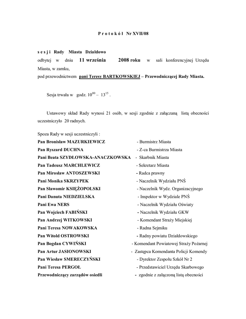 P r o t o k ó ł Nr XVII/08 s e s j i Rady Miasta Działdowo odbytej w dniu 11 września 2008 roku w sali konferencyjnej Urzędu Miasta, w zamku, pod przewodnictwem pani Teresy BARTKOWSKIEJ – Przewodniczącej Rady Miasta. Sesja trwała w godz. 10 00 – 1315 . Ustawowy skład Rady wynosi 21 osób, w sesji zgodnie z załączaną listą obecności uczestniczyło 20 radnych. Spoza Rady w sesji uczestniczyli : Pan Bronisław MAZURKIEWICZ - Burmistrz Miasta Pan Ryszard DUCHNA - Z-ca Burmistrza Miasta Pani Beata SZYDŁOWSKA-ANACZKOWSKA - Skarbnik Miasta Pan Tadeusz MARCHLEWICZ - Sekretarz Miasta Pan Mirosław ANTOSZEWSKI - Radca prawny Pani Monika SKRZYPEK - Naczelnik Wydziału PNŚ Pan Sławomir KSIĘŻOPOLSKI - Naczelnik Wydz. Organizacyjnego Pani Danuta NIEDZIELSKA - Inspektor w Wydziale PNŚ Pani Ewa NERS - Naczelnik Wydziału Oświaty Pan Wojciech FABIŃSKI - Naczelnik Wydziału GKW Pan Andrzej WITKOWSKI - Komendant Straży Miejskiej Pani Teresa NOWAKOWSKA - Radna Sejmiku Pan Witold OSTROWSKI - Radny powiatu Działdowskiego Pan Bogdan CYWIŃSKI - Komendant Powiatowej Straży Pożarnej Pan Artur JASIONOWSKI - Zastępca Komendanta Policji Komendy Pan Wiesław SMERECZYŃSKI - Dyrektor Zespołu Szkół Nr 2 Pani Teresa PERGOŁ - Przedstawiciel Urzędu Skarbowego Przewodniczący zarządów osiedli - zgodnie z załączoną listą obecności 2 Kilku mieszkańców miasta Przedstawiciele lokalnych mediów Przebieg sesji Pkt 1 Pani Teresa BARTKOWSKA – Przewodnicząca Rady Miasta otworzyła sesję, powitała jej uczestników oraz stwierdziła prawomocność obrad. Po czym poinformowała, że otrzymała przykrą wiadomość o śmierci naszego byłego proboszcza, księdza prałata Jerzego Deji. Ksiądz prałat Jerzy Deja pracował w naszym mieście, zawdzięczamy mu wiele jako społeczność miasta, jako społeczność katolicka. Jego śmierć nie ukrywam przyjęłam osobiście z ogromnym bólem. Proponuje uczczenie jego pamięci minutą ciszy - proszę o powstanie. Uczestniczy sesji uczcili minutą ciszy pamięć księdza Jerzego Deji. Ad pkt 2 Zmiany w porządku dziennym sesji: Pan Bronisław MAZURKIEWICZ – Burmistrz Miasta: Pani przewodnicząca, Wysoka Rado, bardzo proszę o zdjęcie z porządku dziennego dzisiejszej sesji punktu 10 – podjęcie uchwały w sprawie wyrażenia zgody na zawarcie umowy najmu pomiędzy Gminą-Miasto Działdowo a Działdowską Agencją Rozwoju S.A. dotyczącej nieruchomości wykorzystywanej na prowadzenie Centrum Kształcenia Ustawicznego, położonej w Działdowie przy ul. Polnej 11. Proszę państwa, dnia 9 czerwca 2008 roku DAR zwróciła się do mnie o zawarcie umowy najmu lokali zajmowanych do prowadzenia działalności przez CKU i taka propozycja umowy została wypracowana przez obie strony. Ale 9 września, a więc dwa dni temu, otrzymaliśmy pismo, żebyśmy zamiast umowy najmu zawarli z nimi umowę dzierżawy. Myślę, że ta propozycja zasadna i korzystniejsza dla stron – w związku z tym wnoszę o zdjęcie z porządku obrad. Rada 20 głosami „za”, tj. jednomyślnie zdjęła ten punkt z porządku obrad. jest bardziej tego punktu 3 Radny pan Grzegorz MROWIŃSKI: Szanowni państwo, w imieniu Klubu Radnych Działdowa składam wniosek, aby osobom, które zapisały się do głosu w punkcie 21 „wolne wnioski i informacje” udzielić głosu w punkcie 8, czyli interpelacje radnych i zapytania. Klub Radnych Miasta Działdowa motywuje swój wniosek tym, że mieszkańcy, którzy przychodzą na posiedzenie Miejskiej często zwalniają udział w sesji się z pracy, często Rady biorą dzień wolny po to, żeby wziąć Rady i niestety myślę, że jest to pewną nieprzyzwoitością, że przetrzymujemy te osoby czasami po 6, 7 godzin po to, żeby udzielić im głosu – stąd też ten wniosek. Pani Teresa BARTKOWSKA– Przewodnicząca Rady: Dziękuję , mówimy o porządku dziennym sesji. Radny pan Bogdan KASZUBSKI : Popieram wniosek pana Grzegorza. Chciałbym jeszcze nadmienić, że mieszkańcy między innymi mówią o tym, że jeśli jest to punkt 21, to nie ma już na sesji telewizji kablowej i prasy , tak więc nie ma odzwierciedlenia ich wniosków w lokalnych mediach. Rada przystąpiła do realizacji porządku dziennego sesji, w następującym brzmieniu : 1. Otwarcie sesji i stwierdzenie jej prawomocności. 2. Zmiany w porządku dziennym sesji. 3. Przyjęcie protokółu poprzedniej sesji. 4. Sprawozdanie Przewodniczącej Rady o działaniach podejmowanych w okresie międzysesyjnym. 5. Sprawozdanie z działalności Burmistrza w okresie międzysesyjnym, zwłaszcza z wykonania uchwał Rady. 6. Sprawozdanie przedstawicieli Gminy z działalności związków międzygminnych i stowarzyszenia gmin. 7. Sprawozdanie z prac Komisji w okresie międzysesyjnym. 8. Interpelacje radnych i zapytania. 9. Podjecie uchwały w sprawie wyrażenia zgody na dokonanie zamiany nieruchomości. 4 10. Podjęcie uchwały w sprawie powierzenia Burmistrzowi Miasta Działdowo uprawnień do ustalenia opłat za korzystanie z szaletów miejskich. 11. Podjecie uchwały w sprawie wyrażenia zgody Zespołowi Szkół Nr 2 im. Jana Pawła II na oddanie w najem części nieruchomości położonej w Działdowie przy ul. Polnej 11. 12. Podjecie 2 uchwał w sprawie przyjęcia darowizny przez Gminę-Miasto Działdowo. 13. Podjecie uchwały w sprawie wyrażenia zgody na nieodpłatne przejecie na własność Gminy-Miasto Działdowo do gminnego zasobu nieruchomości, działek będących własnością Skarbu Państwa, stanowiących drogi. 14. Podjęcie uchwały w sprawie wyrażenia zgody na przeniesienie na rzecz GminyMiasto Działdowo prawa własności nieruchomości położonych w Działdowie przy ul. 11 Listopada 11. 15. Podjecie uchwały w sprawie wyrażenia zgody na przekazanie w formie darowizny na rzecz Powiatu Działdowskiego nieruchomości stanowiących własność Gminy-Miasto Działdowo. 16. Podjęcie uchwały w sprawie wyrażenia zgody na sprzedaż w trybie bezprzetargowym nieruchomości, po