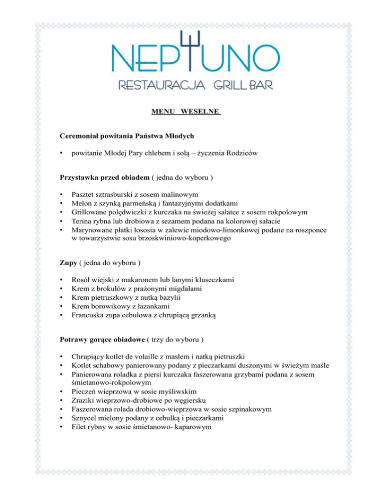 MENU WESELNE Ceremoniał powitania Państwa Młodych • powitanie Młodej Pary chlebem i solą – życzenia Rodziców Przystawka przed obiadem ( jedna do wyboru ) • • • • • Pasztet sztrasburski z sosem malinowym Melon z szynką parmeńską i fantazyjnymi dodatkami Grillowane polędwiczki z kurczaka na świeżej sałatce z sosem rokpolowym Terina rybna lub drobiowa z sezamem podana na kolorowej sałacie Marynowane płatki łososia w zalewie miodowo-limonkowej podane na roszponce w towarzystwie sosu brzoskwiniowo-koperkowego Zupy ( jedna do wyboru ) • • • • • Rosół wiejski z makaronem lub lanymi kluseczkami Krem z brokułów z prażonymi migdałami Krem pietruszkowy z nutką bazylii Krem borowikowy z łazankami Francuska zupa cebulowa z chrupiącą grzanką Potrawy gorące obiadowe ( trzy do wyboru ) • • • • • • • • Chrupiący kotlet de volaille z masłem i natką pietruszki Kotlet schabowy panierowany podany z pieczarkami duszonymi w świeżym maśle Panierowana roladka z piersi kurczaka faszerowana grzybami podana z sosem śmietanowo-rokpolowym Pieczeń wieprzowa w sosie myśliwskim Zraziki wieprzowo-drobiowe po węgiersku Faszerowana rolada drobiowo-wieprzowa w sosie szpinakowym Sznycel mielony podany z cebulką i pieczarkami Filet rybny w sosie śmietanowo- kaparowym Dodatki • • • • • Ziemniaki gotowane – kuleczki z koperkiem ( młode sezonowo ) Ziemniaki pieczone w ziołach Kluseczki śląskie Zestaw surówek do wyboru Bukiet warzyw blanszowanych z masełkiem ziołowym Sałatki • • • Sałatka brokułowa z kurczakiem Sałatka grecka z serem feta i oliwkami Sałatka wiosenna z papryką, jajkiem i czerwoną cebulą Przystawki • • • • • • • • • Jajko z kawiorem na sałatce jarzynowej Roladki szynkowe w galaretce Tymbalik drobiowy Indyk z owocami w maladze Ogórek z masą serową Trio śledziowe Mięsa pieczyste wg staropolskich przepisów Bogaty wybór wędlin Befsztyk tatarski ze świeżą cebulką, ogórkiem marynowanym i marynowanymi pieczarkami Dodatki • • • • Patery wykwintnych ciast – 10 rodzai Owoce – 6 rodzai Kawa, herbata bez ograniczeń Duży wybór pieczywa Płonąca niespodzianka godz.22:00 ( jedna opcja do wyboru ) • • Szynka pieczona w całości serwowana przez Szefa Kuchni Płonący szaszłyk wieprzowy i filet drobiowy na grzance po meksykańsku Godzina 24:00 • Weselny tort piętrowy z płonącą fontanną Godzina 1:00 • Zupa gulaszowa lub bigos myśliwski z pieczoną kiełbaską Godzina 3:00 • Barszcz czerwony z pasztecikiem Cena menu na wesele: 190 zł/osoba STÓŁ WIEJSKI Cena 1.000 zł staropolskie kiełbasy szynka, boczek pieczony pasztet z żurawiną salcesony, galaretka z nóżek i golonki smalec, chrzan chleb wiejski STÓŁ RYBNY Cena 1.000 zł śledzie pod pierzynką rolmopsy ryby wędzone łosoś w galarecie ryba po grecku MENU NA POPRAWINY Dania gorące Żurek staropolski z jajkiem i kiełbasą Pierogi z kapustą i grzybami Pierogi z mięsem Pierogi ruskie Pieczeń z karkówki w sosie własnym Kapusta zasmażana na ciepło Ziemniaki z koperkiem Cena menu na poprawiny: 50 zł /osoba
