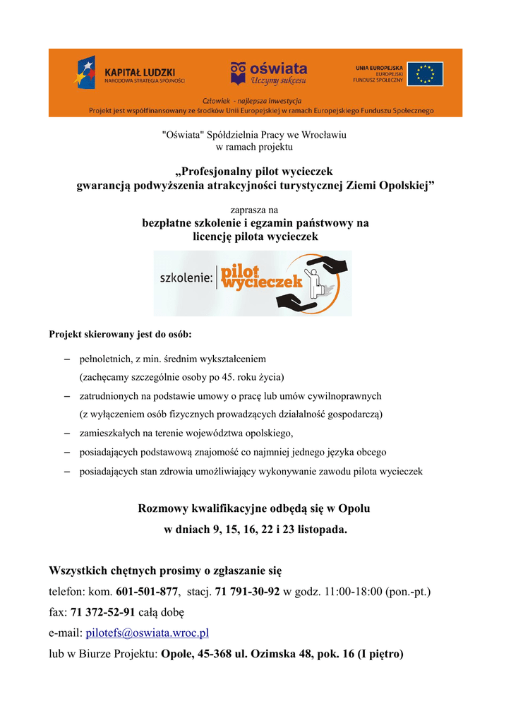 "Oświata" Spółdzielnia Pracy we Wrocławiu w ramach projektu „Profesjonalny pilot wycieczek gwarancją podwyższenia atrakcyjności turystycznej Ziemi Opolskiej” zaprasza na bezpłatne szkolenie i egzamin państwowy na licencję pilota wycieczek Projekt skierowany jest do osób: – pełnoletnich, z min. średnim wykształceniem (zachęcamy szczególnie osoby po 45. roku życia) – zatrudnionych na podstawie umowy o pracę lub umów cywilnoprawnych (z wyłączeniem osób fizycznych prowadzących działalność gospodarczą) – zamieszkałych na terenie województwa opolskiego, – posiadających podstawową znajomość co najmniej jednego języka obcego – posiadających stan zdrowia umożliwiający wykonywanie zawodu pilota wycieczek Rozmowy kwalifikacyjne odbędą się w Opolu w dniach 9, 15, 16, 22 i 23 listopada. Wszystkich chętnych prosimy o zgłaszanie się telefon: kom. 601-501-877, stacj. 71 791-30-92 w godz. 11:00-18:00 (pon.-pt.) fax: 71 372-52-91 całą dobę e-mail: [email protected] lub w Biurze Projektu: Opole, 45-368 ul. Ozimska 48, pok. 16 (I piętro) „Profesjonalny pilot wycieczek gwarancją podwyższenia atrakcyjności turystycznej Ziemi Opolskiej” Informacje szczegółowe Zajęcia odbywać się będą w soboty i niedziele, w godzinach 9:30-16:00 przy ul. Ozimskiej 48 w Opolu Czas trwania kursu: listopad 2010 – czerwiec 2011 Uczestnicy i uczestniczki projektu otrzymują bezpłatnie: - profesjonalny kurs pilota wycieczek (wykłady, ćwiczenia, zajęcia praktyczne w terenie) - 3-dniową wycieczkę terenową (transport, noclegi, wyżywienie) - opłacony egzamin państwowy w Urzędzie Marszałkowskim Województwa Opolskiego - materiały szkoleniowe (przewodnik, atlas, vademecum pilota, oraz inne) - ubezpieczenie NNW - dwie przerwy kawowe oraz obiad w pobliskiej restauracji każdego dnia szkoleniowego W zakres działalności pilota wycieczek wchodzą: - obsługa grup krajowych w Polsce - obsługa grup krajowych wyjeżdżających za granicę - obsługa zagranicznych grup przyjazdowych do Polski - pilot-rezydent, przedstawiciel biur podróży - obsługa kolonii i obozów w kraju i za granicą Licencja pilota wycieczek uprawnia do pracy na terenie całej Unii Europejskiej. Daje możliwość pracy dla polskich i zagranicznych przedsiębiorstw turystycznych i hotelarskich. Projekt realizuje Biuro projektu "Oświata" Spółdzielnia Pracy ul. Ruska 46b 50-079 Wrocław 45-368 Opole ul. Ozimska 48 pok. 16 (I piętro)