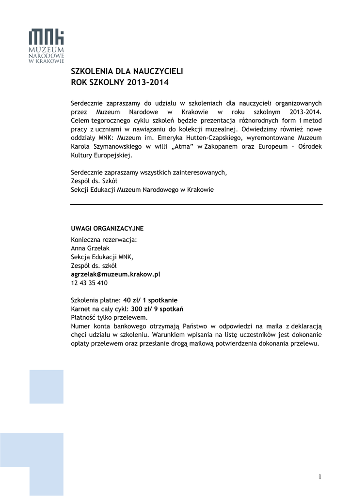 SZKOLENIA DLA NAUCZYCIELI ROK SZKOLNY 2013-2014 Serdecznie zapraszamy do udziału w szkoleniach dla nauczycieli organizowanych przez Muzeum Narodowe w Krakowie w roku szkolnym 2013-2014. Celem tegorocznego cyklu szkoleń będzie prezentacja różnorodnych form i metod pracy z uczniami w nawiązaniu do kolekcji muzealnej. Odwiedzimy również nowe oddziały MNK: Muzeum im. Emeryka Hutten-Czapskiego, wyremontowane Muzeum Karola Szymanowskiego w willi „Atma” w Zakopanem oraz Europeum - Ośrodek Kultury Europejskiej. Serdecznie zapraszamy wszystkich zainteresowanych, Zespół ds. Szkół Sekcji Edukacji Muzeum Narodowego w Krakowie UWAGI ORGANIZACYJNE Konieczna rezerwacja: Anna Grzelak Sekcja Edukacji MNK, Zespół ds. szkół [email protected] 12 43 35 410 Szkolenia płatne: 40 zł/ 1 spotkanie Karnet na cały cykl: 300 zł/ 9 spotkań Płatność tylko przelewem. Numer konta bankowego otrzymają Państwo w odpowiedzi na maila z deklaracją chęci udziału w szkoleniu. Warunkiem wpisania na listę uczestników jest dokonanie opłaty przelewem oraz przesłanie drogą mailową potwierdzenia dokonania przelewu. 1 HARMONOGRAM SZKOLEŃ 2013-2014 Październik 2013 29.10.2013 (wtorek) godz.14.00-18.00 „Historia alternatywna pisana z użyciem analizy SWOT” Muzeum im. Emeryka Hutten-Czapskiego ul. Piłsudskiego 10-12 Kolekcja eksponowana w Muzeum im. Emeryka Hutten-Czapskiego stanie się punktem wyjścia do wspólnego snucia rozważań na temat historii alternatywnej. Czy współczesna literatura fantastyczna może pomóc w nauczaniu historii, w rozwoju kreatywnego myślenia i własnego warsztatu literackiego? Stosując metodę analizy SWOT, wspólnie stworzymy opowiadanie kontrfaktyczne znanego powszechnie zdarzenia historycznego. Listopad 2013 27.11.2013 (środa) godz.14.00-18.00 „Sztuka w akcji – o metodzie arte-terapii w pracy z uczniem trudnym” Gmach Główny al. 3 Maja 1 Terapia sztuką jest uznaną metodą psychoterapii, pozwalającą na posłużenie się twórczością artystyczną w celach terapeutycznych i diagnostycznych. Szkolenie służyć będzie przedstawieniu możliwości wykorzystania doświadczeń terapeutów w pracy z dziećmi i młodzieżą szkolną – przede wszystkim w odniesieniu do pracy z zespołem uczniów, w których występują problemy o charakterze społecznym, psychicznym lub związanym z agresją czy nadpobudliwością. Kolekcja Muzeum Narodowego w Krakowie będzie pretekstem do omówienia sposobów twórczego przetwarzania bodźców i wykorzystania przestrzeni wystawienniczej dla integracji zespołu. Grudzień 2013 20.12.3013 (piątek) godz.14.00-18.00 „Obraz – reaktywacja. Narzędzia wizualne w edukacji” Galeria Sztuki Polskiej XIX wieku w Sukiennicach Rynek Główny 3 Punktem wyjścia spotkania w Sukiennicach będą niezwykle popularne w XIX i na początku XX wieku widowiska zwane „żywymi obrazami”. W czasie szkolenia wnikliwie przyjrzymy się dziełom z naszej kolekcji, by poszukać ich późniejszych i współczesnych wizualnych odniesień. Będziemy odwoływać się do klasycznych oraz nieoczywistych kontekstów funkcjonowania dzieł sztuki w kulturze wysokiej (teatrze, filmie) oraz masowej (reklamie i teledysku). Poddamy analizie oraz interpretacji różnorodne teksty kultury, odnosząc się do wizualnych źródeł ich inspiracji. 2 Wykorzystując siłę oddziaływania obrazów, spróbujemy wspólnie wypracować metody i narzędzia pracy bliskie współczesnemu uczniowi. Styczeń 2014 16.01.2014 (czwartek) godz.14.00-18.00 „Metoda dramy w muzeum w odniesieniu do sztuki średniowiecza” Pałac Biskupa Erazma Ciołka ul. Kanonicza 17 Sztuka epoki średniowiecza – symboliczna i ekspresyjna, a zarazem posługująca się bogatą narracją – miała silne związki z teatrem. Niektóre z obiektów obecnych w zbiorach muzealnych służyły jako rekwizyty dramatyczne. Układy postaci i mowa gestów przedstawiane w malarstwie tablicowym, znajdują bezpośrednie odniesienie w misteriach i dramatach liturgicznych. Źródłem obrazowania sztuk plastycznych była Biblia, lecz także apokryfy i legendy. Praca metodą dramy może służyć dzieciom i młodzieży w zrozumieniu odległej kultury, jej znaczeń i ekspresji. Może także pomóc w wyrażeniu treści ogólnoludzkich, uniwersalnych, jakie sztuka tej epoki stale niesie. Luty 2014 25.02.2014 (wtorek) godz.14.00-18.00 „Kolekcja w szufladzie. O metodzie projektu edukacyjnego” Kamienica Szołayskich pl. Szczepański 9 Spotkanie odbędzie się w przestrzeni dwóch wystaw: „Szuflada Szymborskiej” i „Zawsze Młoda! Polska sztuka około 1900”. Na zajęciach opowiemy o pasji kolekcjonerskiej znanego młodopolskiego zbieracza Feliksa Jasieńskiego „Mangghi” i poetki Wisławy Szymborskiej. W trakcie warsztatów spróbujemy odpowiedzieć na pytanie, czy wystawa muzealna i eksponowane na niej dzieła sztuki z epoki oraz współczesne bibeloty i pamiątki mogą stać się inspiracją dla nauczycieli i uczniów do stworzenia/opracowania projektu. Spotkanie będzie okazją do omówienia założeń i znaczenia metody projektu w praktyce. Marzec 2014 27.03.2014 (czwartek) godz.14.00-18.00 „WebQuest w Domu Józefa Mehoffera – wiedza wyłowiona z sieci” Dom Józefa Mehoffera ul. Krupnicza 26 Tematem warsztatów będzie wykorzystanie w pracy z uczniami Web-Questu – metody tworzenia projektów polegającej na wyszukiwaniu w Internecie potrzebnych informacji oraz krytycznej i konstruktywnej ich ocenie. Przy tej okazji poruszymy również zagadnienie prawa autorskiego i ochrony własności intelektualnej. 3 Spróbujemy odpowiedzieć na pytania, w jaki sposób przygotować uczniów do funkcjonowania w społeczeństwie informacyjnym i gdzie szukać legalnych i wartościowych źródeł informacji. Zasady korzystania ze zbiorów Muzeum Narodowego w Krakowie posłużą jak punkt wyjścia do rozmowy na temat legalnego czerpania z zasobów kultury i wykorzystywania ich w procesie dydaktycznym. 