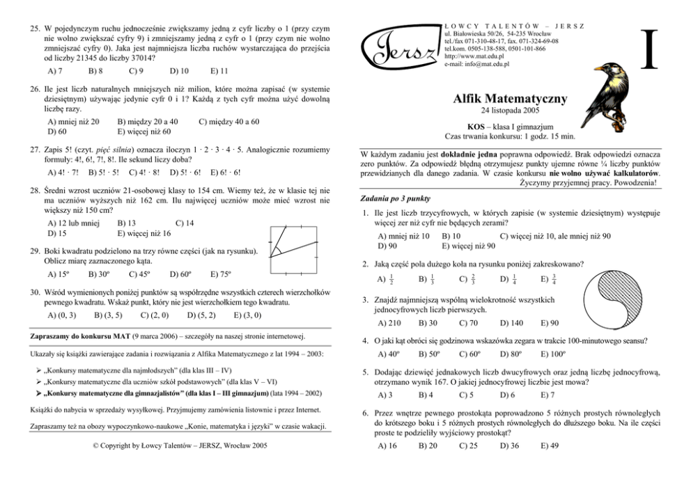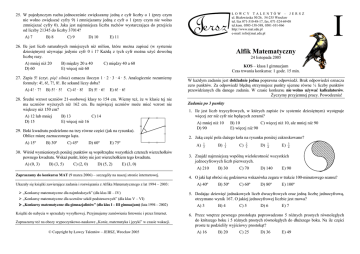 ŁOWCY TALENTÓW – JERSZ ul. Białowieska 50/26, 54-235 Wrocław tel./fax 071-310-48-17, fax. 071-324-69-08 tel.kom. 0505-138-588, 0501-101-866 http://www.mat.edu.pl e-mail: [email protected] 25. W pojedynczym ruchu jednocześnie zwiększamy jedną z cyfr liczby o 1 (przy czym nie wolno zwiększać cyfry 9) i zmniejszamy jedną z cyfr o 1 (przy czym nie wolno zmniejszać cyfry 0). Jaka jest najmniejsza liczba ruchów wystarczająca do przejścia od liczby 21345 do liczby 37014? A) 7 B) 8 C) 9 D) 10 E) 11 26. Ile jest liczb naturalnych mniejszych niż milion, które można zapisać (w systemie dziesiętnym) używając jedynie cyfr 0 i 1? Każdą z tych cyfr można użyć dowolną liczbę razy. A) mniej niż 20 D) 60 B) między 20 a 40 E) więcej niż 60 A) 4! · 7! B) 5! · 5! C) 4! · 8! D) 5! · 6! E) 6! · 6! 28. Średni wzrost uczniów 21-osobowej klasy to 154 cm. Wiemy też, że w klasie tej nie ma uczniów wyższych niż 162 cm. Ilu najwięcej uczniów może mieć wzrost nie większy niż 150 cm? A) 12 lub mniej D) 15 B) 13 C) 14 E) więcej niż 16 29. Boki kwadratu podzielono na trzy równe części (jak na rysunku). Oblicz miarę zaznaczonego kąta. A) 15º B) 30º C) 45º D) 60º E) 75º B) (3, 5) C) (2, 0) 24 listopada 2005 D) (5, 2) KOS – klasa I gimnazjum Czas trwania konkursu: 1 godz. 15 min. W każdym zadaniu jest dokładnie jedna poprawna odpowiedź. Brak odpowiedzi oznacza zero punktów. Za odpowiedź błędną otrzymujesz punkty ujemne równe ¼ liczby punktów przewidzianych dla danego zadania. W czasie konkursu nie wolno używać kalkulatorów. Życzymy przyjemnej pracy. Powodzenia! Zadania po 3 punkty 1. Ile jest liczb trzycyfrowych, w których zapisie (w systemie dziesiętnym) występuje więcej zer niż cyfr nie będących zerami? A) mniej niż 10 D) 90 E) (3, 0) 1 2 Ukazały się książki zawierające zadania i rozwiązania z Alfika Matematycznego z lat 1994 – 2003: „Konkursy matematyczne dla najmłodszych” (dla klas III – IV) „Konkursy matematyczne dla uczniów szkół podstawowych” (dla klas V – VI) „Konkursy matematyczne dla gimnazjalistów” (dla klas I – III gimnazjum) (lata 1994 – 2002) Książki do nabycia w sprzedaży wysyłkowej. Przyjmujemy zamówienia listownie i przez Internet. Zapraszamy też na obozy wypoczynkowo-naukowe „Konie, matematyka i języki” w czasie wakacji. © Copyright by Łowcy Talentów – JERSZ, Wrocław 2005 B) 1 3 C) 2 3 D) 1 4 E) 3 4 3. Znajdź najmniejszą wspólną wielokrotność wszystkich jednocyfrowych liczb pierwszych. A) 210 Zapraszamy do konkursu MAT (9 marca 2006) – szczegóły na naszej stronie internetowej. B) 10 C) więcej niż 10, ale mniej niż 90 E) więcej niż 90 2. Jaką część pola dużego koła na rysunku poniżej zakreskowano? A) 30. Wśród wymienionych poniżej punktów są współrzędne wszystkich czterech wierzchołków pewnego kwadratu. Wskaż punkt, który nie jest wierzchołkiem tego kwadratu. A) (0, 3) Alfik Matematyczny C) między 40 a 60 27. Zapis 5! (czyt. pięć silnia) oznacza iloczyn 1 · 2 · 3 · 4 · 5. Analogicznie rozumiemy formuły: 4!, 6!, 7!, 8!. Ile sekund liczy doba? I B) 30 C) 70 D) 140 E) 90 4. O jaki kąt obróci się godzinowa wskazówka zegara w trakcie 100-minutowego seansu? A) 40º B) 50º C) 60º D) 80º E) 100º 5. Dodając dziewięć jednakowych liczb dwucyfrowych oraz jedną liczbę jednocyfrową, otrzymano wynik 167. O jakiej jednocyfrowej liczbie jest mowa? A) 3 B) 4 C) 5 D) 6 E) 7 6. Przez wnętrze pewnego prostokąta poprowadzono 5 różnych prostych równoległych do krótszego boku i 5 różnych prostych równoległych do dłuższego boku. Na ile części proste te podzieliły wyjściowy prostokąt? A) 16 B) 20 C) 25 D) 36 E) 49 7. Ile razy liczba 5 · 5 · 5 · 5 · 5 jest większa od liczby 5 + 5 + 5 + 5 + 5? A) 5 razy B) 25 razy C) 125 razy D) 625 razy E) 3125 razy 8. Na ile części dzielą płaszczyznę cztery proste będące przedłużeniami boków trapezu, który nie jest równoległobokiem? A) 7 B) 8 C) 9 D) 10 E) 11 9. Ile najwięcej osób może zmieścić się na kwadratowym placu o boku długości 200 metrów, jeśli na jednym metrze kwadratowym mieszczą się 4 osoby? A) mniej niż 10 tys. B) 10 tys. C) 40 tys. D) 160 tys. E) 400 tys. 10. Chłopcy stanowią 20% uczniów pewnej klasy. Ile dziewcząt przypada na jednego chłopca w tej klasie? A) 1 B) 2 C) 3 D) 4 E) 5 11. Jaka jest prędkość samochodu (poruszającego się ze stałą prędkością), który w ciągu każdej minuty pokonuje odległość 750 metrów? B) 45 km/h C) 60 km/h D) 75 km/h E) 100 km/h 12. Ile jest trójkątów, których długości boków są trzema kolejnymi liczbami naturalnymi? A) 1 B) 2 D) więcej niż 3 C) 3 E) nie ma takich trójkątów 13. Z 60-kartkowej broszury wyrwano kartkę ze stroną o numerze 12, na skutek czego z drugiej strony broszury wypadła jeszcze jedna kartka. Zawierała ona stronę o numerze: A) 45 B) 47 C) 49 D) 107 E) 109 14. Każdy bok kwadratu o polu 1 podzielono na trzy równe części (jak na rysunku obok). Znajdź pole zakreskowanego kwadracika. A) 2 9 B) 1 3 C) 4 9 D) 5 9 E) 2 3 15. Pewna liczba dwucyfrowa ma jednakowe cyfry dziesiątek i jedności. Podnosząc tę liczbę do kwadratu otrzymamy liczbę trzycyfrową, która ma równe cyfry setek i jedności. Jaki jest stosunek cyfry dziesiątek do cyfry jedności w tej liczbie trzycyfrowej? A) 0,5 B) 1 C) 1,5 D) 2 A) 0,36 E) 2,5 A) 1 4 A) 1 B) 2 C) 3 D) 4 E) 6 C) 0,17 D) 0,32 E) 0,70 B) 2 5 C) 1 5 D) 3 8 E) 1 6 19. Mamy do dyspozycji 248 jednostkowych sześcianików: 124 zielone i 124 żółte. Chcemy z nich zbudować kilka sześcianów (o krawędzi dłuższej niż 1), tak by żadne dwa nie były tego samego rozmiaru i powierzchnia każdego sześcianu była w całości pomalowana jednym kolorem. Ile najwięcej sześcianów możemy w ten sposób zbudować? Nie potrzeba wykorzystywać wszystkich klocków. B) 2 C) 3 D) 4 E) 5 20. Za pewną ustawą głosowało 60% obecnych na sali