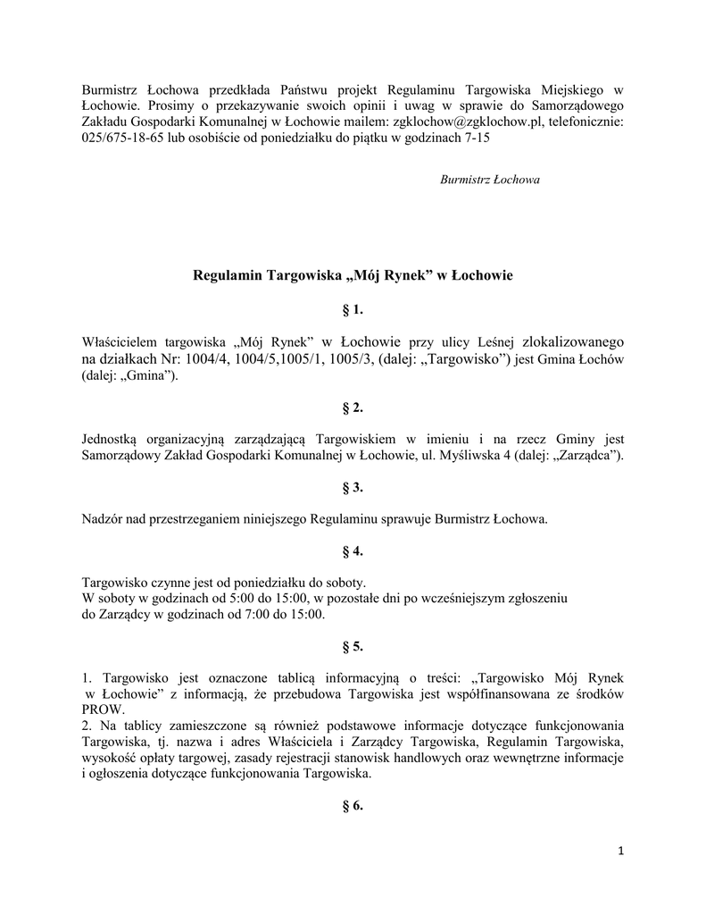 Burmistrz Łochowa przedkłada Państwu projekt Regulaminu Targowiska Miejskiego w Łochowie. Prosimy o przekazywanie swoich opinii i uwag w sprawie do Samorządowego Zakładu Gospodarki Komunalnej w Łochowie mailem: [email protected], telefonicznie: 025/675-18-65 lub osobiście od poniedziałku do piątku w godzinach 7-15 Burmistrz Łochowa Regulamin Targowiska „Mój Rynek” w Łochowie § 1. Właścicielem targowiska „Mój Rynek” w Łochowie przy ulicy Leśnej zlokalizowanego na działkach Nr: 1004/4, 1004/5,1005/1, 1005/3, (dalej: „Targowisko”) jest Gmina Łochów (dalej: „Gmina”). § 2. Jednostką organizacyjną zarządzającą Targowiskiem w imieniu i na rzecz Gminy jest Samorządowy Zakład Gospodarki Komunalnej w Łochowie, ul. Myśliwska 4 (dalej: „Zarządca”). § 3. Nadzór nad przestrzeganiem niniejszego Regulaminu sprawuje Burmistrz Łochowa. § 4. Targowisko czynne jest od poniedziałku do soboty. W soboty w godzinach od 5:00 do 15:00, w pozostałe dni po wcześniejszym zgłoszeniu do Zarządcy w godzinach od 7:00 do 15:00. § 5. 1. Targowisko jest oznaczone tablicą informacyjną o treści: „Targowisko Mój Rynek w Łochowie” z informacją, że przebudowa Targowiska jest współfinansowana ze środków PROW. 2. Na tablicy zamieszczone są również podstawowe informacje dotyczące funkcjonowania Targowiska, tj. nazwa i adres Właściciela i Zarządcy Targowiska, Regulamin Targowiska, wysokość opłaty targowej, zasady rejestracji stanowisk handlowych oraz wewnętrzne informacje i ogłoszenia dotyczące funkcjonowania Targowiska. § 6. 1 1. Targowisko posiada trzy rodzaje stanowisk: zadaszone (wiata) w ilości 32 szt. o łącznej powierzchni 924,34 m2 co stanowi 39,4% całkowitej powierzchni handlowej, namioty 74szt. (74 szt. - 3mx3m) o łącznej powierzchni 666 m2 co stanowi 28,4% całkowitej powierzchni handlowej oraz niezadaszone w ilości 55 szt. ( 26 szt. - 3mx3m i 29 szt. - 3mx6m) o łącznej powierzchni 756m2 co stanowi 32,2% całkowitej powierzchni. 2. Spośród istniejących stanowisk min. 50,0% zarezerwowane jest do sprzedaży produktów rolno-spożywczych. 3. W przypadku braku zainteresowania sprzedażą towarów rolno-spożywczych, dopuszcza się możliwość zagospodarowania niewykorzystanych miejsc poprzez sprzedaż pozostałych towarów. § 7. Uprawnionymi do prowadzenia handlu na Targowisku są osoby fizyczne, osoby prawne i jednostki organizacyjne nieposiadające osobowości prawnej mogące uczestniczyć w obrocie towarowym. § 8. 1. Na Targowisku mogą być sprzedawane wszystkie towary, z wyłączeniem: 1) spirytusu i napojów alkoholowych; 2) produktów ropopochodnych niekonfekcjonowanych; 3) środków farmakologicznych, materiałów medycznych; 4) broni, amunicji oraz materiałów wybuchowych i pirotechnicznych; 5) zagranicznych banknotów i monet będących w obiegu oraz papierów wartościowych,; 6) mięsa i wędlin oraz przetworów rybnych, sprzedawanych poza pawilonami handlowymi; 7) grzybów świeżych i suszonych nieposiadających atestów określonych przez odrębne przepisy; 8) innych artykułów, których sprzedaż jest zabroniona lub regulowana w sposób szczególny przez odrębne przepisy; 9) zwierząt w tym psów, kotów i gołębi; 2. Sprzedaż artykułów spożywczych powinna odbywać się zgodnie z wymogami zawartymi w odrębnych przepisach, a w szczególności zgodnie z przepisami dotyczącymi bezpieczeństwa żywności i żywienia oraz jakości handlowej artykułów rolno-spożywczych; § 9. Na Targowisku zabrania się: 1) zakłócania porządku publicznego i spokoju; 2) wprowadzania psów (nie dotyczy psów przewodników) 3) spożywania napojów alkoholowych i używania innych środków odurzających a także prowadzenia działalności przez osoby będące pod ich wpływem; 4) prowadzenia gier hazardowych i losowych bez zezwolenia wydanego na podstawie odrębnych przepisów; 5) wnoszenia oraz używania materiałów i substancji niebezpiecznych; 6) sprzedaży towarów w drodze publicznych losowań i przetargów; 7) samowolnego zajmowania, zmiany usytuowania stoiska handlowego i wydzielonej powierzchni sprzedaży oraz zmiany i zamiany miejsca sprzedaży, a także odstępowania miejsca sprzedaży; 2 8) jeżdżenia rowerami; 9) wjeżdżania pojazdami przez kupujących na teren Targowiska. § 10. Osoby prowadzące handel na Targowisku zobowiązane są do: 1) przestrzegania niniejszego Regulaminu; 2) przestrzegania przepisów sanitarno-epidemiologicznych i przeciwpożarowych oraz innych obowiązujących w obrocie towarowym; 3) zajmowania i korzystania do celów handlowych wyłącznie z miejsc sprzedaży wyznaczonych przez Zarządcę Targowiska; 4) utrzymania porządku i czystości miejsc, na których prowadzą sprzedaż oraz po zakończeniu sprzedaży zebranie i usunięcie odpadów w miejsce do tego wyznaczone na terenie Targowiska. W przypadku niewykonania tego obowiązku prace zostaną wykonane zastępczo, a kosztami zostanie obciążona osoba zajmująca dane miejsce. 5) posiadania przy sobie dokumentu umożliwiającego ustalenie ich tożsamości przez Zarządcę oraz innych dokumentów umożliwiających określenie legalności prowadzonej działalności handlowej; 6) niezwłocznego wniesienia opłaty targowej oraz okazywania dowodu opłaty na każde żądanie Zarządcy; 7) używania urządzeń pomiarowych posiadających ważną cechę legalizacji oraz ustawienia ich w taki sposób, aby kupujący mieli możliwość stwierdzenia prawidłowości i rzetelności ważenia lub mierzenia towarów. Wielkości sprzedawanych produktów powinny być wyrażone w następujących jednostkach miar: litr, metr, kilogram i ich pochodnych; 8) odstawienia w miejsce specjalnie do tego wyznaczone pojazdu po zajęciu stanowiska handlowego (nie dotyczy osób prowadzących handel na stanowiskach zadaszonych –pod wiatą) § 11. Zarządca wyznacza miejsca sprzedaży oraz czuwa nad prawidłowym ich wykorzystaniem, a osoby prowadzące handel n