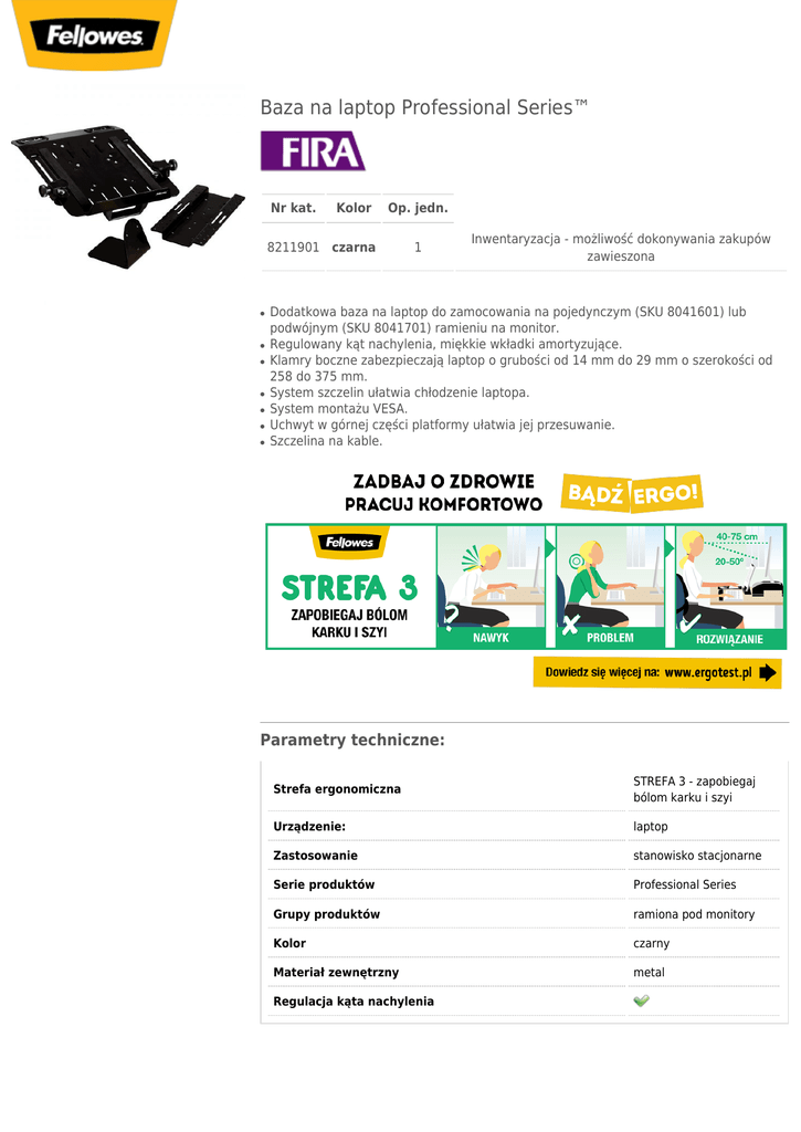 Baza na laptop Professional Series™ Nr kat. Kolor Op. jedn. 8211901 czarna ● ● ● ● ● ● ● 1 Inwentaryzacja - możliwość dokonywania zakupów zawieszona Dodatkowa baza na laptop do zamocowania na pojedynczym (SKU 8041601) lub podwójnym (SKU 8041701) ramieniu na monitor. Regulowany kąt nachylenia, miękkie wkładki amortyzujące. Klamry boczne zabezpieczają laptop o grubości od 14 mm do 29 mm o szerokości od 258 do 375 mm. System szczelin ułatwia chłodzenie laptopa. System montażu VESA. Uchwyt w górnej części platformy ułatwia jej przesuwanie. Szczelina na kable. Parametry techniczne: Strefa ergonomiczna STREFA 3 - zapobiegaj bólom karku i szyi Urządzenie: laptop Zastosowanie stanowisko stacjonarne Serie produktów Professional Series Grupy produktów ramiona pod monitory Kolor czarny Materiał zewnętrzny metal Regulacja kąta nachylenia