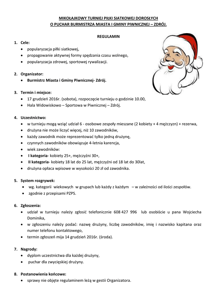 MIKOŁAJKOWY TURNIEJ PIŁKI SIATKOWEJ DOROSŁYCH O PUCHAR BURMISTRZA MIASTA I GMINY PIWNICZNEJ – ZDRÓJ. REGULAMIN 1. Cele: popularyzacja piłki siatkowej, propagowanie aktywnej formy spędzania czasu wolnego, popularyzacja zdrowej, sportowej rywalizacji. 2. Organizator: Burmistrz Miasta i Gminy Piwnicznej- Zdrój. 3. Termin i miejsce: 17 grudzień 2016r. (sobota), rozpoczęcie turnieju o godzinie 10.00, Hala Widowiskowo – Sportowa w Piwnicznej – Zdrój. 4. Uczestnictwo: w turnieju mogą wziąć udział 6 - osobowe zespoły mieszane (2 kobiety + 4 mężczyzn) + rezerwa, drużyna nie może liczyć więcej, niż 10 zawodników, każdy zawodnik może reprezentować tylko jedną drużynę, czynnych zawodników obowiązuje 4-letnia karencja, wiek zawodników: I kategoria- kobiety 25+, mężczyźni 30+, II kategoria- kobiety 18 lat do 25 lat, mężczyźni od 18 lat do 30lat, drużyna opłaca wpisowe w wysokości 20 zł od zawodnika. 5. System rozgrywek: wg. kategorii wiekowych w grupach lub każdy z każdym – w zależności od ilości zespołów. zgodnie z przepisami PZPS. 6. Zgłoszenia: udział w turnieju należy zgłosić telefonicznie 608 427 996 lub osobiście u pana Wojciecha Dominika, w zgłoszeniu należy podać: nazwę drużyny, liczbę zawodników, imię i nazwisko kapitana oraz numer telefonu kontaktowego, termin zgłoszeń mija 14 grudzień 2016r. (środa). 7. Nagrody: dyplom uczestnictwa dla każdej drużyny, puchar dla zwycięskiej drużyny. 8. Postanowienia końcowe: sprawy nie objęte regulaminem leżą w gestii Organizatora.