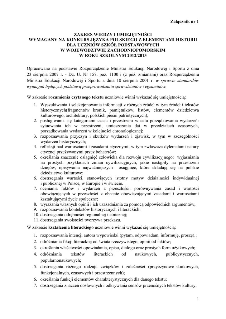 Załącznik nr 1 ZAKRES WIEDZY I UMIEJĘTNOŚCI WYMAGANY NA KONKURS JĘZYKA POLSKIEGO Z ELEMENTAMI HISTORII DLA UCZNIÓW SZKÓŁ PODSTAWOWYCH W WOJEWÓDZTWIE ZACHODNIOPOMORSKIM W ROKU SZKOLNYM 2012/2013 Opracowano na podstawie Rozporządzenie Ministra Edukacji Narodowej i Sportu z dnia 23 sierpnia 2007 r. - Dz. U. Nr 157, poz. 1100 i (z póź. zmianami) oraz Rozporządzeniu Ministra Edukacji Narodowej i Sportu z dnia 10 sierpnia 2001 r. w sprawie standardów wymagań będących podstawą przeprowadzania sprawdzianów i egzaminów. W zakresie rozumienia czytanego tekstu uczniowie winni wykazać się umiejętnością: 1. Wyszukiwania i selekcjonowania informacji z różnych źródeł w tym źródeł i tekstów historycznych(fragmentów kronik, pamiętników, listów, elementów dziedzictwa kulturowego, architektury, polskich pieśni patriotycznych); 2. posługiwania się kategoriami czasu i przestrzeni w celu porządkowania wydarzeń: sytuowania ich w przestrzeni, umieszczania dat w przedziałach czasowych, porządkowania wydarzeń w kolejności chronologicznej; 3. rozpoznawania przyczyn i skutków wydarzeń i zjawisk, w tym w szczególności wydarzeń historycznych; 4. refleksji nad wartościami i zasadami etycznymi, w tym zwłaszcza dylematami natury etycznej przeżywanymi przez bohaterów; 5. określania znaczenie osiągnięć człowieka dla rozwoju cywilizacyjnego: wyjaśniania na prostych przykładach zmian cywilizacyjnych, jakie nastąpiły na przestrzeni dziejów, opisywania najważniejszych osiągnięć, które składają się na polskie dziedzictwo kulturowe; 6. dostrzegania wartości, stanowiących istotny motyw działalności indywidualnej i publicznej w Polsce, w Europie i w świecie. 7. oceniania faktów i wydarzeń z przeszłości; porównywania zasad i wartości obowiązujących w przeszłości z obecnie obowiązującymi zasadami i wartościami kształtującymi życie społeczne; 8. wyrażania własnych opinii i ich uzasadniania za pomocą odpowiednich argumentów, 9. rozpoznawania kontekstów historycznych i literackich; 10. dostrzegania odrębności regionalnej i etnicznej; 11. dostrzegania swoistości tworzywa przekazu. W zakresie kształcenia literackiego uczniowie winni wykazać się umiejętnością: rozpoznawania intencji autora wypowiedzi (pytam, odpowiadam, informuję, proszę).; odróżniania fikcji literackiej od świata rzeczywistego, opinii od faktów; określania właściwości opowiadania, opisu, dialogu oraz prostych form użytkowych; odróżniania tekstów literackich od naukowych, publicystycznych, popularnonaukowych; 5. dostrzegania różnego rodzaju związków i zależności (przyczynowo-skutkowych, funkcjonalnych, czasowych i przestrzennych); 6. określania funkcji elementów charakterystycznych dla danego tekstu; 7. dostrzegania znaczeń dosłownych i odkrywania sensów przenośnych tekstów kultury; 1. 2. 3. 4. 1 8. wyróżniania elementów świata przedstawionego; 9. klasyfikowania utworów z uwzględnieniem kryterium czasu i tematu (literatura współczesna, historyczna, science fiction); 10. dostrzegania różnic między językiem potocznym a językiem literatury oraz językiem regionu; 11. czynnego posługiwania się terminami: fikcja literacka, świat przedstawiony, nadawca, odbiorca, bohater, wątek, akcja, autor, podmiot mówiący, narrator, epitet, porównanie, wyraz dźwiękonaśladowczy, przenośnia, uosobienie, rytm, rym, zwrotka, refren; proza, poezja; oraz znajomością wyznaczników gatunkowych: baśni, opowiadania, powieści, mitu, legendy a także terminów związanych z przekazami ikonicznymi, radiem, telewizją, filmem, teatrem, prasą. W zakresie kształcenia językowego uczniowie powinni wykazać się: 1. znajomością norm gramatycznych, ortograficznych i interpunkcyjnych ; 2. umiejętnością budowania zdań: oznajmujących, pytających i rozkazujących oraz równoważników zdań; 3. umiejętnością rozpoznawania związków wyrazowych w zdaniu, w tym podmiotu i orzeczenia; 4. znajomością odmiennych i nieodmiennych części mowy oraz podstawowych kategorii fleksyjnych; 5. umiejętnością rozpoznawania związków znaczeniowych między wyrazami: wyrazy bliskoznaczne, przeciwstawne, pokrewne oraz rozumieniem związków frazeologicznych; 6. wiadomościami z zakresu budowy słowotwórczej wyrazów; 7. umiejętnością rozpoznawania głosek; 8. znajomością zasad akcentowania wyrazów. W zakresie kształcenia historycznego uczniowie powinni wykazać się umiejętnością: 1. rysowania drzewa genealogicznego; 2. krytycznej oceny wydarzeń historycznych i współczesnych; 3. dostrzegania związków teraźniejszości z przeszłością oraz ciągłości rozwoju kulturalnego i cywilizacyjnego; 4. odczytywania i opisu różnorodnych źródeł informacji historycznej i ich ilustracyjne wykorzystywanie przy rekonstrukcji przeszłości; 5. lokalizowania czasowo-przestrzennego wydarzeń z wykorzystaniem osi czasu, planu, mapy, wykresów i tabel; 6. wyciągania wniosków z porównywania dwóch i więcej prostych informacji dotyczących wydarzeń i postaci historycznych; 7. formułowania pytań, problemów dotyczących zjawisk zachodzących w środowisku lokalnym, regionalnym. 2 a także: wiadomościami na temat wydarzeń i osób o zasadniczym znaczeniu dla losów narodu i państwa polskiego (chrzest Polski, zjazd gnieźnieński i koronacja Chrobrego, Władysław Łokietek i Kazimierz Wielki, bitwa pod Grunwaldem, unia polsko-litewska, królowa Jadwiga i Jagiełło, Stefan Batory, potop szwedzki, Jan Sobieski, Konstytucja 3 maja, rozbiory, formy walki o niepodległość Polski) oraz wybranych zagadnień z kręgu kultury antycznej (w tym śródziemnomorskich korzeni wybranych elementów kultury polskiej) i dziejów Europy (w szczególności epoki renesansu). Lektura zalecana: wybór pieśni patriotycznych z okresu powstań narodowych (np. „Marsz, marsz Polonia. Pieśni z którymi szliśmy do niepodległości” Wybór Wacław Panek) powieści