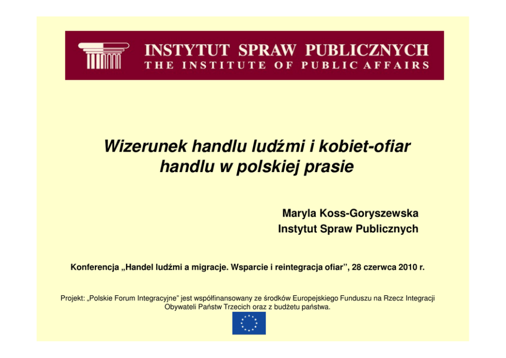 Wizerunek handlu ludźmi i kobiet-ofiar handlu w polskiej prasie Maryla Koss-Goryszewska Instytut Spraw Publicznych Konferencja „Handel ludźmi a migracje. Wsparcie i reintegracja ofiar”, 28 czerwca 2010 r. Projekt: „Polskie Forum Integracyjne” jest współfinansowany ze środków Europejskiego Funduszu na Rzecz Integracji Obywateli Państw Trzecich oraz z budżetu państwa. Przedmiot analizy: Wszystkie publikacje, w których ukazała się wzmianka o handlu ludźmi zamieszczone w dzienniku „Gazeta Wyborcza”, w jej lokalnych i tematycznych dodatkach, od stycznia 1991 r. do października 2009 r. → 353 publikacje Rodzaje analizy: • Analiza ilościowa • Analiza pola semantycznego • Analiza jakościowa Analiza ilościowa Liczba publikacji nt. handlu ludźmi w poszczególnych latach 60 50 40 30 20 10 20 09 20 08 20 07 20 06 20 05 20 04 20 03 20 02 20 01 20 00 19 99 19 98 19 97 19 96 19 95 19 94 19 93 19 92 19 91 0 In ne M ig ra cj P a rz es tę ps tw S o tu di W um yd ar of ze ia ry ni P a ra po w lit a yc zn kob ie oP t ku ra ltu w o, ra ln pr e ze pi sy pr aw ne In fo rm P ro ac st je yt uc nt .o ja rg .p oz H ar is z. to i z ria ag ro że ń Analiza ilościowa Kontekst badanych publikacji 250 200 150 100 50 0 Analiza pola semantycznego Metoda opiera się na wyszukaniu słów-kluczy, a następnie skategoryzowaniu ich względem funkcji, które pełnią w tekście rolę: • Określeń (jaki jest podmiot, jakimi cechami się charakteryzuje). • Asocjacji (z czym wiąże się podmiot). • Ekwiwalentów (czyli innymi słowy synonimów – wyrażeń, które zastępują słowa-klucze). • Opisu działań podmiotu (co robi podmiot, jak się zachowuje). • Opisu działań wobec podmiotu (jakie działania są podejmowane względem podmiotu). Określenia: Dużo potrafią Zostają zarażane Bez paszportu, bez pieniędzy, zastraszana Nie mają do kogo wracać Nie widzą innego sposobu na życie niż prostytucja Wiedzą, do jakiej pracy jadą Widziały głównie pegeerowską biedę Cierpią na syndrom „pretty woman” Wierzą, że trafi im się królewicz z bajki Mają podstawowe, góra – zawodowe wykształcenie Bezradne Naiwne Wierzyły, że jadą zbierać winogrona Znęcone wysokością obiecywanych zarobków Młode, naiwne dziewczęta Wiedziały od początku, na czym naprawdę miała polegać ich „praca” Wiedziały, w co się wpakowały Dotkliwie pokrzywdzone Asocjacje Handel dziewczynami Wywóz kobiet do zachodnich domów publicznych Handel żywym towarem Przydatność dziewczyn Uroda dziewczyn Pomoc pokrzywdzonym Sprzedaż kobiet Prostytucja i zorganizowany przemyt kobiet Drogowe prostytutki Rozebrana kobieta Uprawianie seksu przez osobę uwięzioną Szlaki przerzutu ofiar handlu Naiwność kobiet Stręczenie nieletniej kobiety Kupowanie kobiet ze wschodu Sprzedaż własnego ciała Lustracja panienek Kupować ciało kobiety Kupienie prostytutki Popyt na żywy towar Ochrona dóbr osobistych pokrzywdzonych Ekwiwalenty Dziewczyny do towarzystwa Pokrzywdzone kobiety Wykorzystywane kobiety Niewolnice Ofiary przymusowej prostytucji Dziewczyny bez nazwisk „Masażystki” Koleżanki po fachu Panienki Profesjonalne prostytutki Wesołe panie Kobiety do towarzystwa Panie na eksport Niewolnice seksu Przedmiot handlu Cudzoziemki trudniące się nierządem Sztuki Tirówki Hit eksportowy Przedmiot handlu między agencjami Niewolnice pracy Ludzki towar Towar wywozowy Żywy towar Opis działań podmiotu Wypinają pupy Kuszą Uciekły od opiekunów Musiały odrobić to, co w nie zainwestowano Trafiają do domów publicznych Boją się zemsty Zajmują się sprzedawaniem własnego ciała Po wypuszczeniu pewnie znowu wrócą na drogi Uprawiają prostytucję Tańczą Świadczyły usługi seksualne Pracowały na trasach wylotowych Granicę przechodziły z fałszywymi paszportami albo jechały ukryte w pociągu Zarabiały przy drodze Trafiały do domów publicznych lub wytwórni filmów pornograficznych Robiły to dobrowolnie Boją się dekonspiracji Chciała szybko „spłacić” dług Robiła, co jej kazali Opis działań wobec podmiotu Sprzedawane Zmuszane do uprawiania nierządu Zmuszane do prostytucji Uwiedzione i wywiezione Podstępnie uwiedzione Zabrane są im pieniądze Zostały wyekspediowane do pracy w domach publicznych na Zachodzie Sprzedane Dostarczone Bite Deportowane Kupowane Zgwałcone Więzione Werbowane Zapłacono za nie 2 tys. marek Sprzedawane do domu publicznego Zwabione Przekazane do domu publicznego Przetrzymywane siłą Terroryzowane Maltretowane Szprycowane narkotykami Analiza jakościowa – wyniki: • Handel ludźmi traktowany jest bardziej w kontekście sensacyjnego wydarzenia. Podane w publikacjach informacje dotyczą w zdecydowanej większości konkretnych wydarzeń kryminalnych. • Ofiary przedstawiane są niczym bohaterki powieści kryminalnych lub filmów akcji. • Profil społeczno-demograficzny ofiary na podstawie doniesień prasowych: jest to młoda (nastoletnia lub maksymalnie dwudziestokilkuletnia) kobieta, która pochodzi z niskich warstw społecznych, o niskim statusie materialnym, słabo wykształcona, z jednego z państw byłego bloku wschodniego lub, nieco rzadziej, z Polski. Analiza jakościowa – wyniki cd. • Dziennikarze koncentrują się głównie na cechach wyglądu zewnętrznego ofiar handlu kobietami. • Dziennikarze mają tendencje do eksponowania tych cech charakteru, które ich zdaniem zadecydowały o fakcie stania się ofiarą handlu, tzn. głupoty lub pazerności. • W wypowiedziach prasowych dominuje język stosunkowo prosty i bagatelizujący problem. • W kontekście handlu ludźmi często stosowana jest nomenklatura ekonomiczna i handlowa w odniesieniu do ofiar, tj.: „eksport” (czy też: „sekseksport”), „import”, „sprowadzanie”, „dostarczanie”, „ludzki towar”, „towar wywozowy”, „hit eksportowy”. Wnioski końcowe • Handel ludźmi jest zjawiskiem, które coraz silniej nagłaśniane i uwypukl