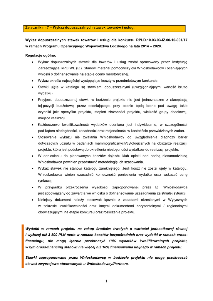 Załącznik nr 7 – Wykaz dopuszczalnych stawek towarów i usług. Wykaz dopuszczalnych stawek towarów i usług dla konkursu RPLD.10.03.03-IZ.00-10-001/17 w ramach Programu Operacyjnego Województwa Łódzkiego na lata 2014 – 2020. Regulacje ogólne: Wykaz dopuszczalnych stawek dla towarów i usług został opracowany przez Instytucję Zarządzającą RPO WŁ (IZ). Stanowi materiał pomocniczy dla Wnioskodawców i oceniających wnioski o dofinansowanie na etapie oceny merytorycznej. Wykaz określa najczęściej występujące koszty w przedmiotowym konkursie. Stawki ujęte w katalogu są stawkami dopuszczalnymi (uwzględniającymi wartość brutto wydatku). Przyjęcie dopuszczalnej stawki w budżecie projektu nie jest jednoznaczne z akceptacją tej pozycji budżetowej przez oceniającego, przy ocenie będą brane pod uwagę takie czynniki jak: specyfika projektu, stopień złożoności projektu, wielkość grupy docelowej, miejsce realizacji. Każdorazowo kwalifikowalność wydatków oceniana jest indywidualnie, w szczególności pod kątem niezbędności, zasadności oraz racjonalności w kontekście przewidzianych zadań. Stosowanie wykazu nie zwalania Wnioskodawcy od uwzględnienia diagnozy barier dotyczących udziału w badaniach mammograficznych/cytologicznych na obszarze realizacji projektu, która jest podstawą do określenia niezbędności wydatków do realizacji projektu. W odniesieniu do planowanych kosztów dojazdu i/lub opieki nad osobą niesamodzielną Wnioskodawca powinien przedstawić metodologię ich szacowania. Wykaz stawek nie stanowi katalogu zamkniętego. Jeśli koszt nie został ujęty w katalogu, Wnioskodawca winien uzasadnić konieczność poniesienia wydatku oraz wskazać cenę rynkową. W przypadku przekroczenia wysokości zaproponowanej przez IZ, Wnioskodawca jest zobowiązany do zawarcia we wniosku o dofinansowanie uzasadnienia zaistniałej sytuacji. Niniejszy dokument należy stosować łącznie z zasadami określonymi w Wytycznych w zakresie kwalifikowalności oraz innymi dokumentami horyzontalnymi / regionalnymi obowiązującymi na etapie konkursu oraz rozliczenia projektu. Wydatki w ramach projektu na zakup środków trwałych o wartości jednostkowej równej i wyższej niż 3 500 PLN netto w ramach kosztów bezpośrednich oraz wydatki w ramach crossfinancingu, nie mogą łącznie przekroczyć 10% wydatków kwalifikowalnych projektu, w tym cross-financing stanowi nie więcej niż 10% finansowania unijnego w ramach projektu. Stawki zaproponowane przez Wnioskodawcę w budżecie projektu nie mogą przekraczać stawek zwyczajowo stosowanych u Wnioskodawcy/Partnera. 1 Przykładowy katalog kosztów: Lp. nazwa warunek kwalifikowalności stawka jednostka miary 1 zwrot kosztu dojazdu Zapewnienie dojazdu niezbędnego cena uzależniona dla realizacji usługi zdrowotnej w ramach od cenników programu profilaktyki raka piersi lub raka operatorów szyjki macicy dla danej osoby z miejsca komunikacji zamieszkania do miejsca wykonywania publicznej osoba badania profilaktycznego i z powrotem. Uczestnik projektu otrzymuje zwrot faktycznie poniesionych kosztów, udokumentowanych: biletem, paragonem, fakturą. Wydatek kwalifikowalny do wysokości opłat za środki transportu publicznego kołowego lub szynowego, zgodnie z cennikiem biletów II klasy, obowiązującym na danym obszarze. W przypadku korzystania ze środków transportu prywatnego refundacja wydatku do wysokości ww. kosztów. Co do zasady Wnioskodawca nie powinien ograniczać uczestnikom możliwości dojazdu komunikacją publiczną. Zróżnicowanie form dojazdu może lepiej odpowiadać na bariery uczestnictwa w badaniach. Założenia w tym zakresie, przedstawione we wniosku o dofinansowanie, powinny być logiczne, racjonalne i efektywne. Możliwość korzystania z transportu własnego powinna dotyczyć przede wszystkim sytuacji, gdy na danym terenie nie funkcjonuje komunikacja publiczna. 2 zapewnienie Zapewnienie dojazdu niezbędnego bus 1,50 zł – 3,30 zł dojazdu dla realizacji usługi zdrowotnej w ramach autokar 2,80 zł – programu profilaktyki raka piersi lub raka 10,00 zł szyjki macicy dla danej osoby z miejsca zamieszkania do miejsca wykonywania badania profilaktycznego i z powrotem. Możliwe jest wynajęcie autokaru/busa – w zależności od liczby osób 2 km – dla zapewnienia dojazdu na badanie profilaktyczne. Koszt uzależniony jest od liczby osób i długości trasy. Refundacja wydatku do wysokości faktycznie poniesionych kosztów. W przypadku, gdy Wnioskodawca planuje wykorzystanie własnego busa (lub wynajem busa), aby zapewnić dojazd na badania uczestnikom z jakiegoś obszaru, a oferta komunikacji publicznej na tym obszarze pozwala na taki dojazd, konieczne jest, przedstawienie przesłanek takiego podejścia w uzasadnieniu wydatku. Takie podejście, ograniczające formy dojazdu, jest jednak dopuszczalne tylko w szczególnie uzasadnionych sytuacjach. 3 opieka nad Wnioskodawca we wniosku do 20 zł; osobą o dofinansowanie może przewidzieć dwie cena nie powinna niesamodzielną formy zapewnienia opieki nad osobą odbiegać od ceny niesamodzielną: rynkowej poprzez zwrot kosztów uczestnikowi projektu ponoszonych na zapewnienie opieki nad osobą niesamodzielną, za którą odpowiada. Aby ubiegać się o zwrot poniesionych kosztów uczestnik powinien udokumentować konieczność opieki nad osobą niesamodzielną np. poprzez złożenie oświadczenia beneficjentowi, jak również przedstawić fakturę/rachunek, bądź umowę zlecenie za usługę związaną z opieką (zgodnie z terminem badania profilaktycznego, z którego uczestnik korzysta w projekcie). Refundacja kosztów opieki następuje na rzecz uczestnika projektu. lub poprzez zapewnienie przez beneficjenta opieki nad osobą niesamodzielną, którą opiekuje się 3 godzina uczestnik projektu. O ile to możliwe, beneficjent może zapewnić opiekę również w miejscu realizacji projektu. Wybierając jedną z wymienionych możliwości Wniosk