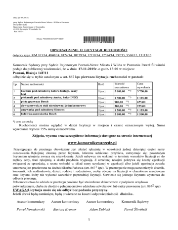 Dnia 23-09-2015r. przy Sądzie Rejonowym Poznań-Nowe Miasto i Wilda w Poznaniu Paweł Śliwiński Kancelaria Komornicza w Swarzędzu 62-020 Swarzędz Wrzesińska 9a Km 103/14 *0020001413269* #Beata *0020001413269*/0419/ OBWIESZCZENIE O LICYTACJI RUCHOMOŚCI dotyczy sygn. KM 103/14, 4840/14, 8124/14, 10739/14, 12150/14, 12584/14, 292/15, 9568/15, 13113/15 Komornik Sądowy przy Sądzie Rejonowym Poznań-Nowe Miasto i Wilda w Poznaniu Paweł Śliwiński podaje do publicznej wiadomości, że w dniu 17-11-2015r. o godz. 13:00 w miejscu: Poznań, Błażeja 14F/11 odbędzie się w trybie ustalonym w art. 867 kpc pierwsza licytacja ruchomości w postaci: 1 [szt.] Wartość szacunkowa 5 000,00 **) Cena wywołania 3 750,00 1 [szt.] 1 [szt.] 1 [szt.] 1 [szt.] 1 [szt.] 1 500,00 **) 900,00 **) 300,00 **) 1 500,00 **) 2 000,00 **) 1 125,00 675,00 225,00 1 125,00 1 500,00 Lp. Nazwa ruchomości Ilość 1 kuchnia pod zabudowę koloru białego, szary blat piekarnik pod zabudowę Amica, kolor INOX płyta grzewcza Bosch zlewozmywak ze stali nierdzewnej jednokomorowy zmywarka pod zabudowę Siemens lodówko-zamrażarka Bosch 2 3 4 5 6 *) cena za sztukę Ruchomości można oglądać w dzień licytacji w miejscu i czasie oznaczonym wyżej. Suma wywołania wynosi 75% sumy oszacowania. Zdjęcia, wycena oraz szczegółowe informacje dostępne na stronie internetowej www.komornikswarzedz.pl Przystępujący do przetargu obowiązany jest złożyć rękojmię w wysokości jednej dziesiątej części sumy oszacowania. Rękojmię złożoną przez licytanta, któremu udzielono przybicia, zatrzymuje się; pozostałym licytantom rękojmię zwraca się niezwłocznie. Jeżeli nabywca nie wykonał w terminie warunków licytacji co do zapłaty ceny, traci rękojmię, a skutki przybicia wygasają. Z utraconej rękojmi pokrywa się koszty egzekucji związanej ze sprzedażą, a reszta wchodzi w skład sumy uzyskanej w egzekucji albo jeżeli egzekucja została umorzona jest przelewana na dochód Skarbu Państwa (art. 8671 kpc). W przetargu nie mogą uczestniczyć: dłużnik, komornik, ich małżonkowie, dzieci, rodzice i rodzeństwo, osoby obecne na licytacji w charakterze urzędowym oraz licytant, który nie wykonał warunków poprzedniej licytacji. Stawienie się jednego licytanta wystarcza do odbycia przetargu. Pełnomocnictwo do udziału w przetargu powinno być stwierdzone dokumentem z podpisem urzędowo poświadczonym, chyba że chodzi o pełnomocnictwo udzielone adwokatowi lub radcy prawnemu (art. 8672 kpc) UWAGA:Licytacja może się nie odbyć bez podania przyczyny. Jeżeli drzwi będą zamknięte, będą otwierane na koszt i odpowiedzialność dłużnika . Asesor komorniczy Asesor komorniczy Asesor komorniczy Komornik Sądowy Paweł Nowakowski Bartosz Kramer Adam Dębicki Paweł Śliwiński 1