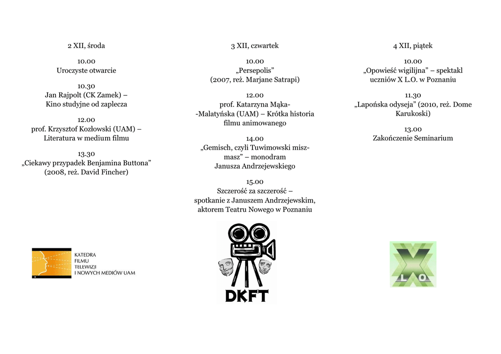 2 XII, środa 3 XII, czwartek 4 XII, piątek 10.00 Uroczyste otwarcie 10.00 „Persepolis” (2007, reż. Marjane Satrapi) 10.00 „Opowieść wigilijna” – spektakl uczniów X L.O. w Poznaniu 12.00 prof. Katarzyna Mąka-Malatyńska (UAM) – Krótka historia filmu animowanego 11.30 „Lapońska odyseja” (2010, reż. Dome Karukoski) 10.30 Jan Rajpolt (CK Zamek) – Kino studyjne od zaplecza 12.00 prof. Krzysztof Kozłowski (UAM) – Literatura w medium filmu 13.30 „Ciekawy przypadek Benjamina Buttona” (2008, reż. David Fincher) 14.00 „Gemisch, czyli Tuwimowski miszmasz” – monodram Janusza Andrzejewskiego 15.00 Szczerość za szczerość – spotkanie z Januszem Andrzejewskim, aktorem Teatru Nowego w Poznaniu 13.00 Zakończenie Seminarium Aula X L.O. w Poznaniu os. Rzeczypospolitej 111 Tel. 061 8771959 [email protected] 2 – 4 XII 2015
