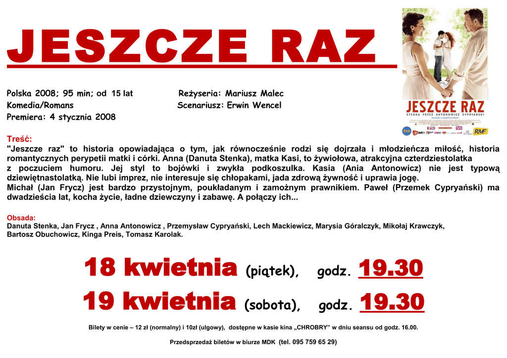 JESZCZE RAZ Polska 2008; 95 min; od 15 lat Komedia/Romans Premiera: 4 stycznia 2008 Reżyseria: Mariusz Malec Scenariusz: Erwin Wencel Treść: "Jeszcze raz" to historia opowiadająca o tym, jak równocześnie rodzi się dojrzała i młodzieńcza miłość, historia romantycznych perypetii matki i córki. Anna (Danuta Stenka), matka Kasi, to żywiołowa, atrakcyjna czterdziestolatka z poczuciem humoru. Jej styl to bojówki i zwykła podkoszulka. Kasia (Ania Antonowicz) nie jest typową dziewiętnastolatką. Nie lubi imprez, nie interesuje się chłopakami, jada zdrową żywność i uprawia jogę. Michał (Jan Frycz) jest bardzo przystojnym, poukładanym i zamożnym prawnikiem. Paweł (Przemek Cypryański) ma dwadzieścia lat, kocha życie, ładne dziewczyny i zabawę. A połączy ich... Obsada: Danuta Stenka, Jan Frycz , Anna Antonowicz , Przemysław Cypryański, Lech Mackiewicz, Marysia Góralczyk, Mikołaj Krawczyk, Bartosz Obuchowicz, Kinga Preis, Tomasz Karolak. 18 kwietnia (piątek), 19 kwietnia (sobota), godz. 19.30 godz. 19.30 Bilety w cenie – 12 zł (normalny) i 10zł (ulgowy), dostępne w kasie kina „CHROBRY” w dniu seansu od godz. 16.00. Przedsprzedaż biletów w biurze MDK (tel. 095 759 65 29)