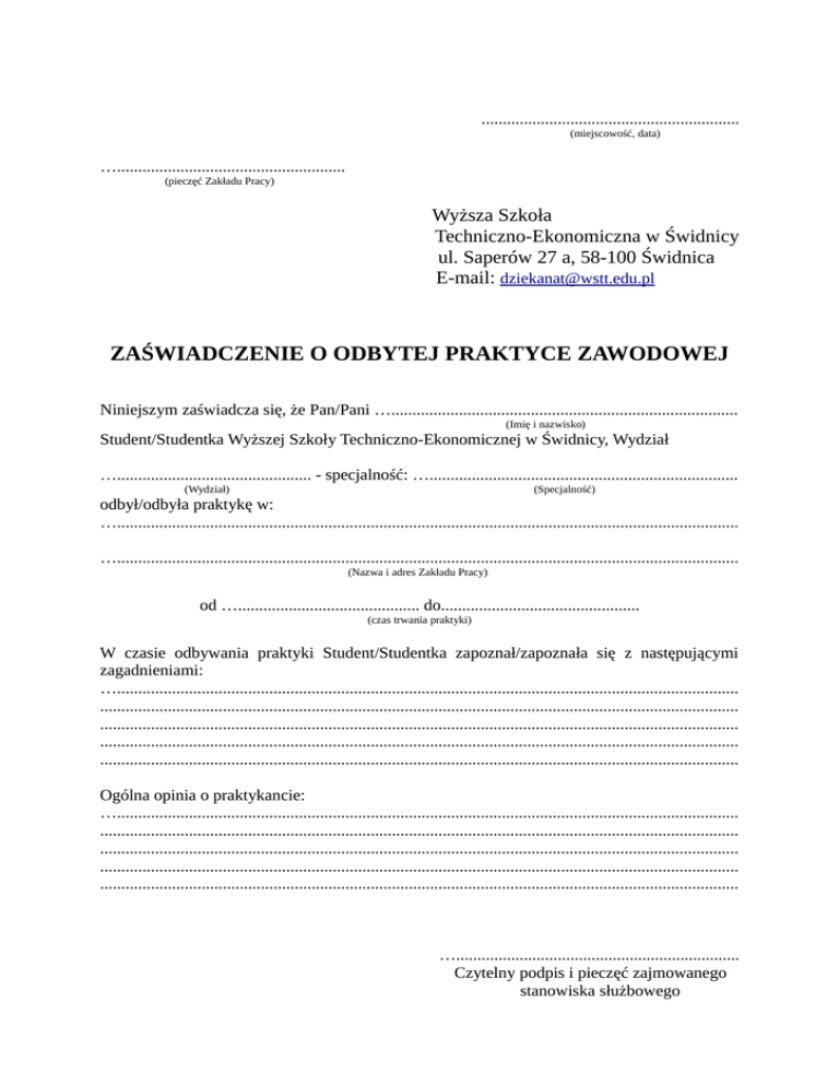 ............................................................. (miejscowość, data) …...................................................... (pieczęć Zakładu Pracy) Wyższa Szkoła Techniczno-Ekonomiczna w Świdnicy ul. Saperów 27 a, 58-100 Świdnica E-mail: [email protected] ZAŚWIADCZENIE O ODBYTEJ PRAKTYCE ZAWODOWEJ Niniejszym zaświadcza się, że Pan/Pani ….................................................................................. (Imię i nazwisko) Student/Studentka Wyższej Szkoły Techniczno-Ekonomicznej w Świdnicy, Wydział ….............................................. - specjalność: …......................................................................... (Wydział) (Specjalność) odbył/odbyła praktykę w: …................................................................................................................................................... …................................................................................................................................................... (Nazwa i adres Zakładu Pracy) od …........................................... do............................................... (czas trwania praktyki) W czasie odbywania praktyki Student/Studentka zapoznał/zapoznała się z następującymi zagadnieniami: …................................................................................................................................................... ....................................................................................................................................................... ....................................................................................................................................................... ....................................................................................................................................................... ....................................................................................................................................................... Ogólna opinia o praktykancie: …................................................................................................................................................... ....................................................................................................................................................... ....................................................................................................................................................... ....................................................................................................................................................... ....................................................................................................................................................... …................................................................... Czytelny podpis i pieczęć zajmowanego stanowiska służbowego